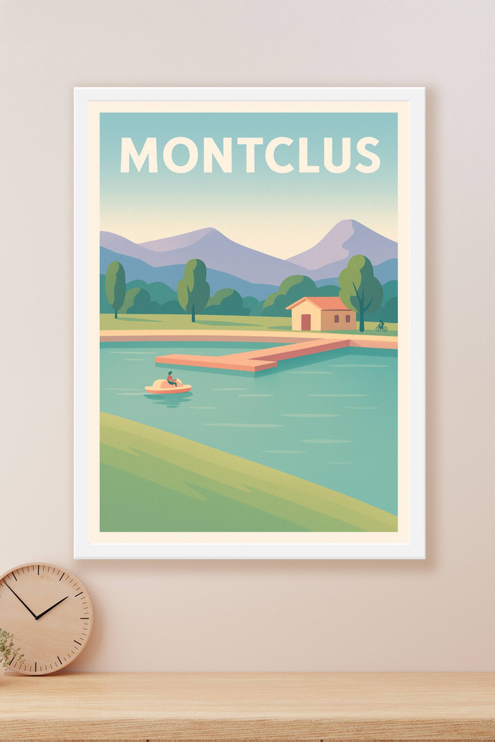 Découvrez la sérénité de Montclus avec cette affiche illustrée mettant en scène un paysage naturel paisible, entre montagnes, arbres verdoyants et ...