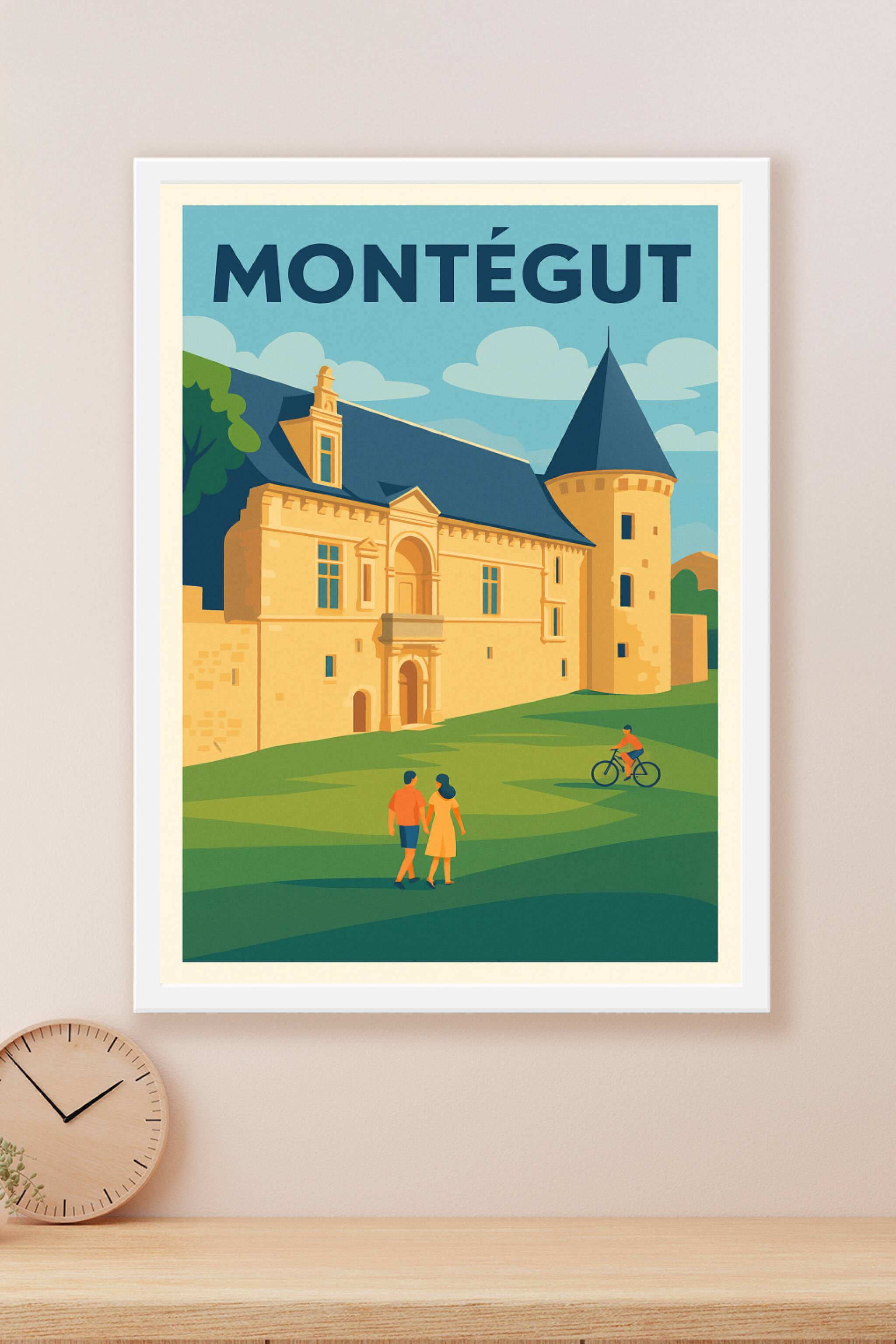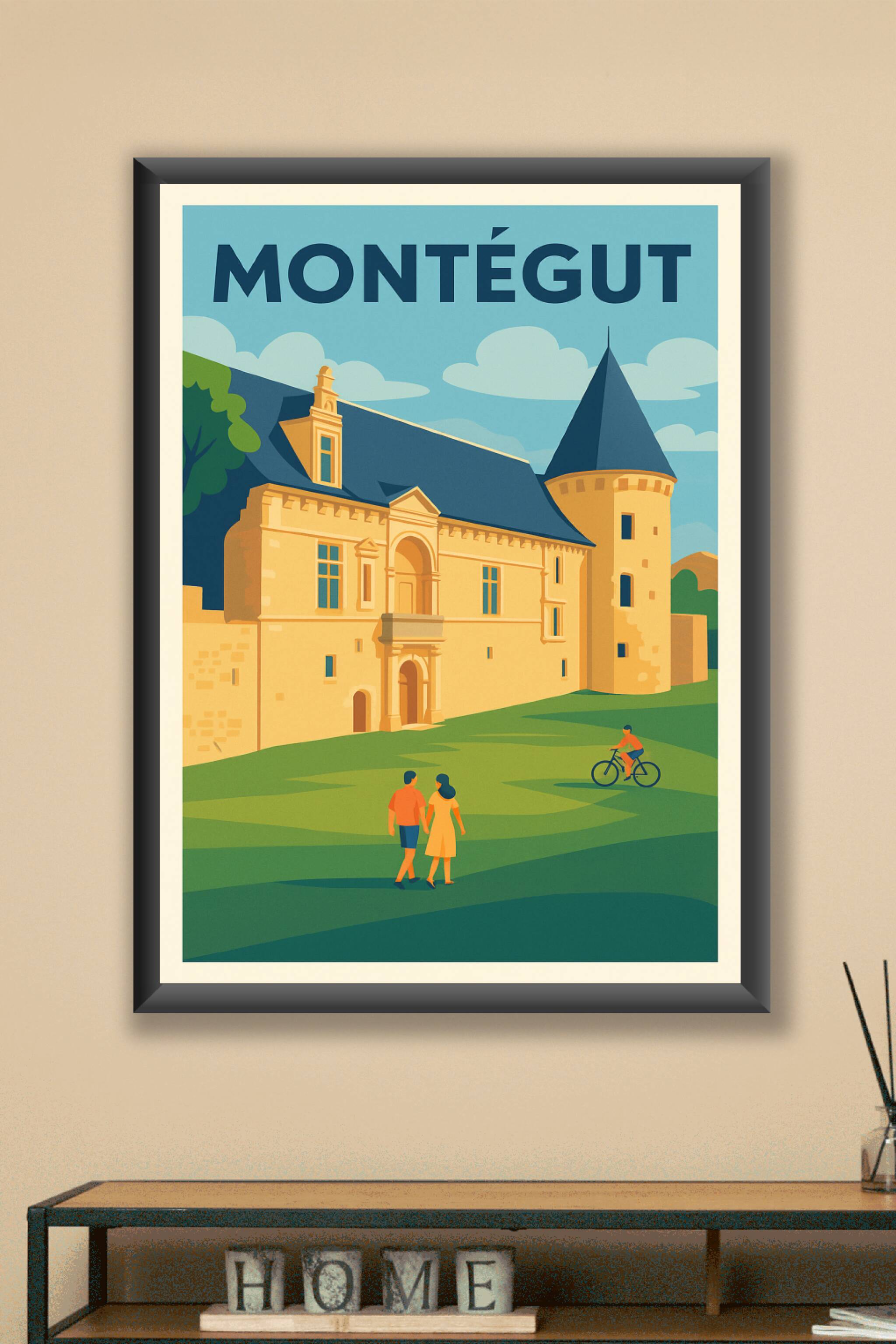Découvrez la sérénité et l'architecture médiévale de Montégut avec cette affiche au style vintage illustré. Le poster met en scène un château emblé...