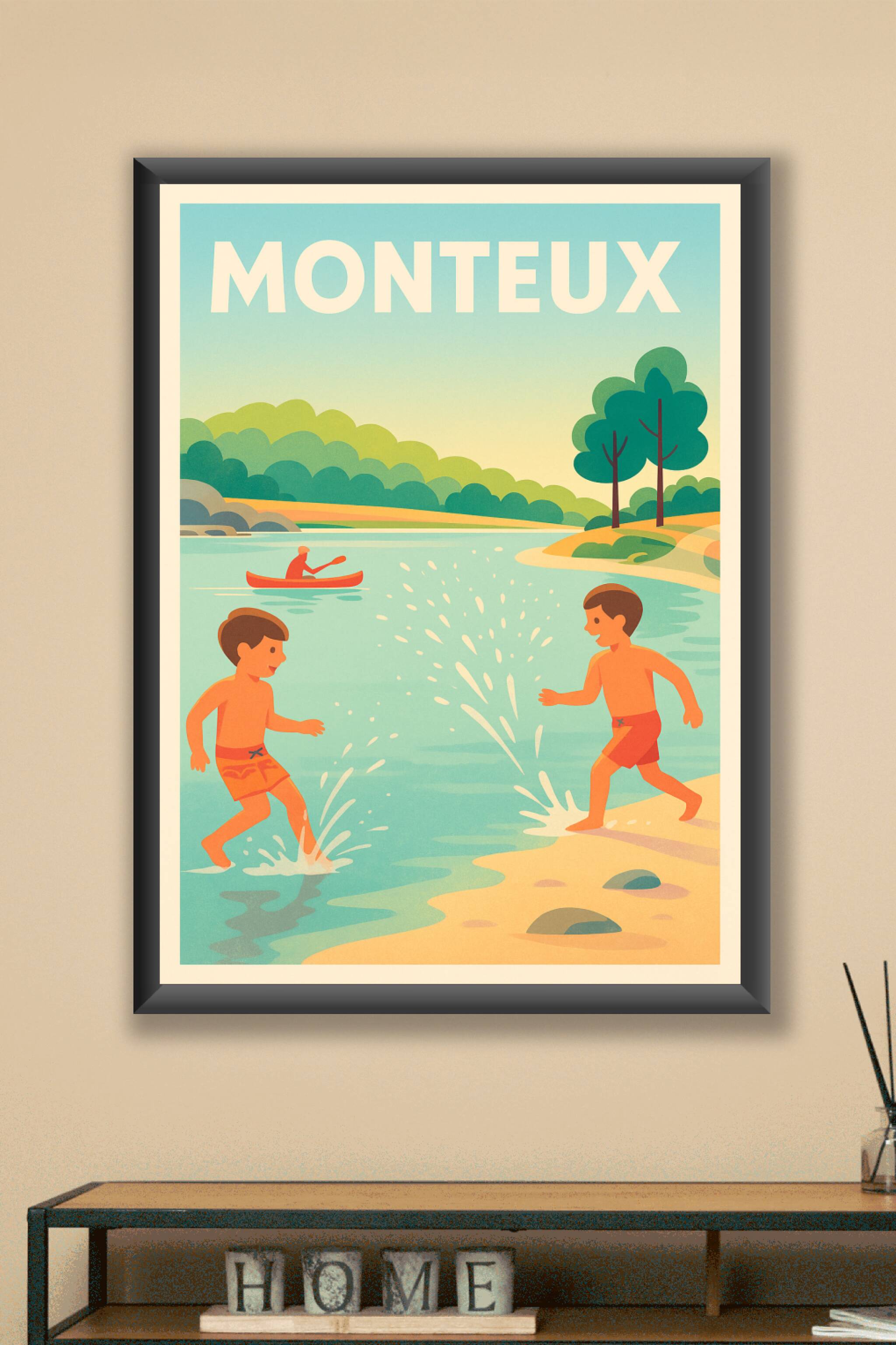 Découvrez l'esprit estival et joyeux de Monteux avec cette affiche vintage représentant deux enfants s'amusant au bord d'une rivière paisible, sous un ciel bleu et une nature verdoyante. Ce poster évoque les souvenirs d'été et les moments simples passés à profiter de la nature. Imprimée en tirage "Fine Art" sur papier 305g coton, cette affiche vous offre une qualité d'impression exceptionnelle et une grande fidélité des couleurs. Disponible en formats A1 à A4, avec ou sans cadre, elle sublimera votre intérieur en apportant une touche de fraîcheur et de nostalgie. Fabriquée en France, cette affiche est un choix parfait pour les amateurs de décoration vintage et les passionnés de Monteux.