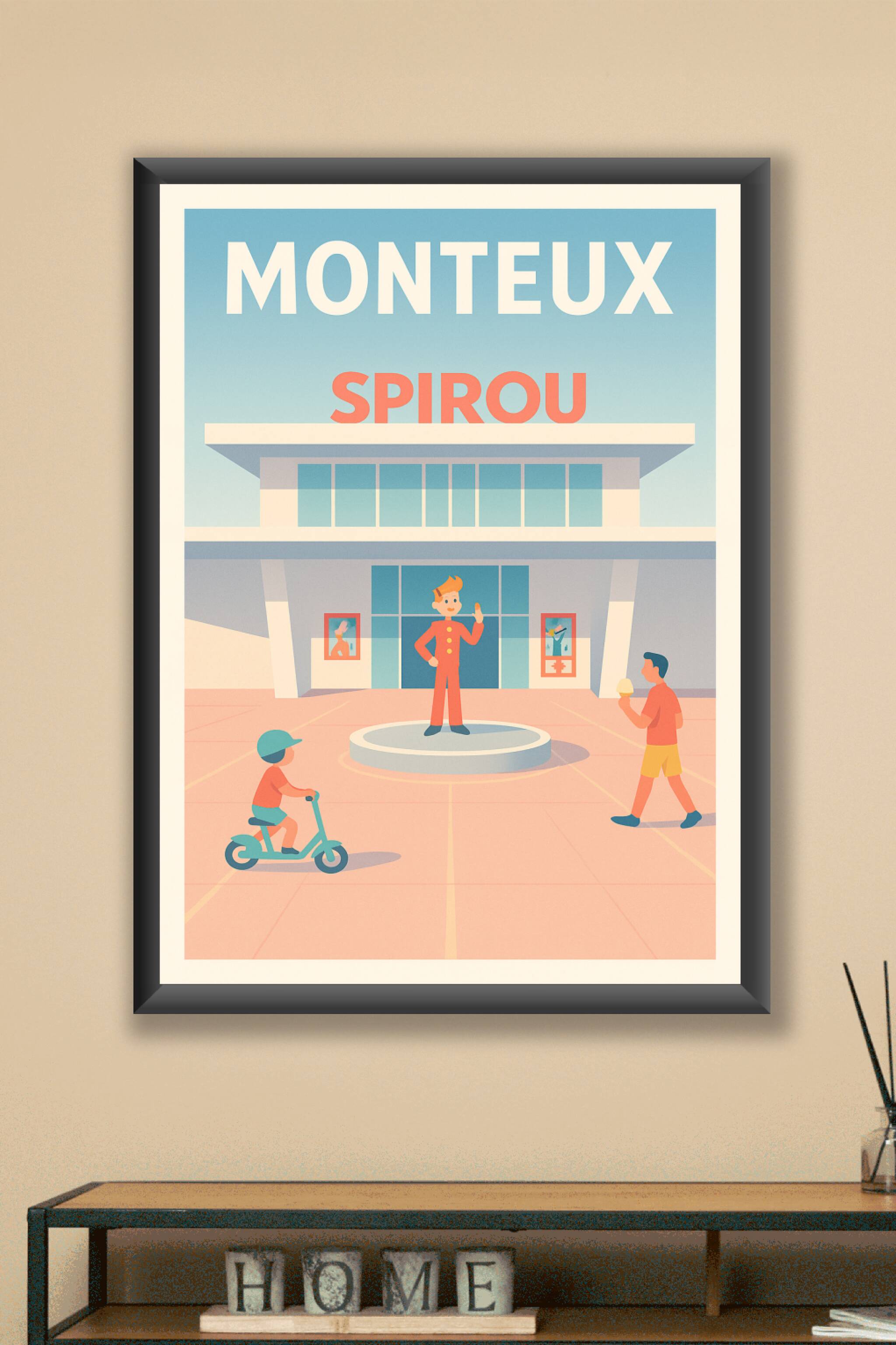 Découvrez cette affiche unique qui met en scène l'emblématique personnage de Spirou dans un décor lumineux et apaisant, typique de la ville de Mont...