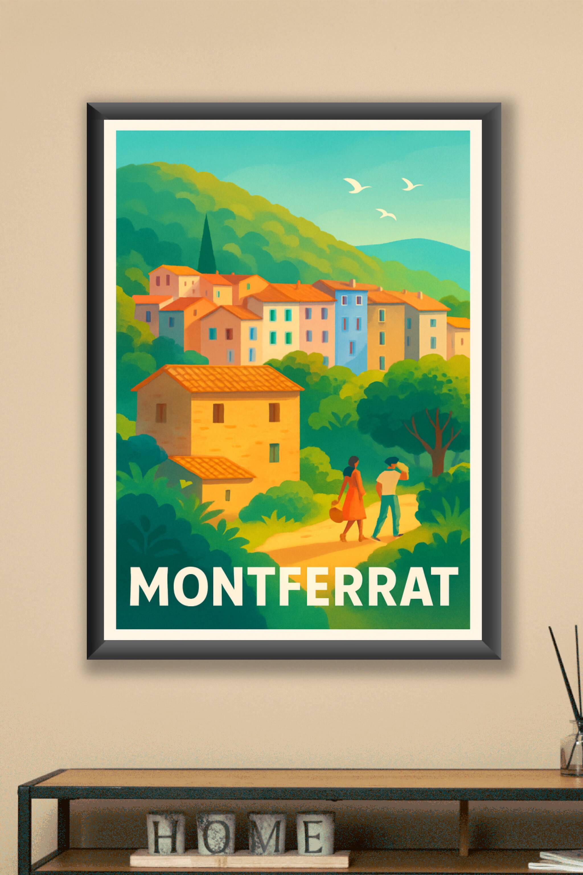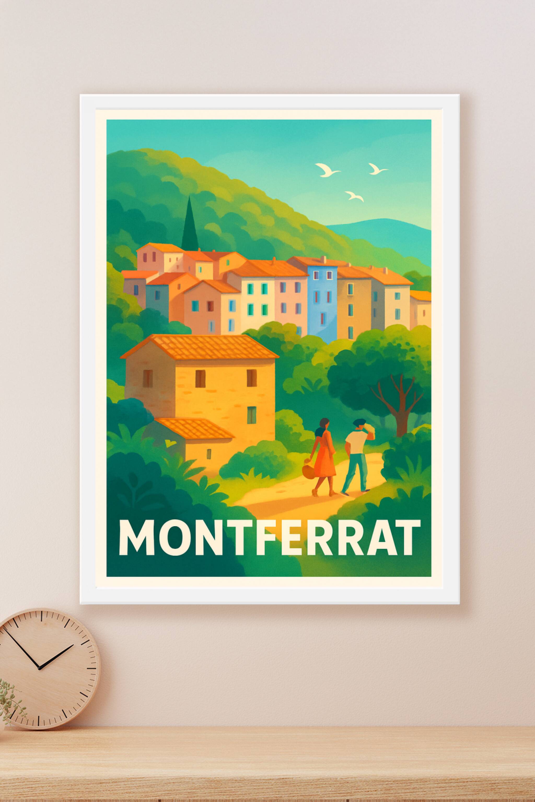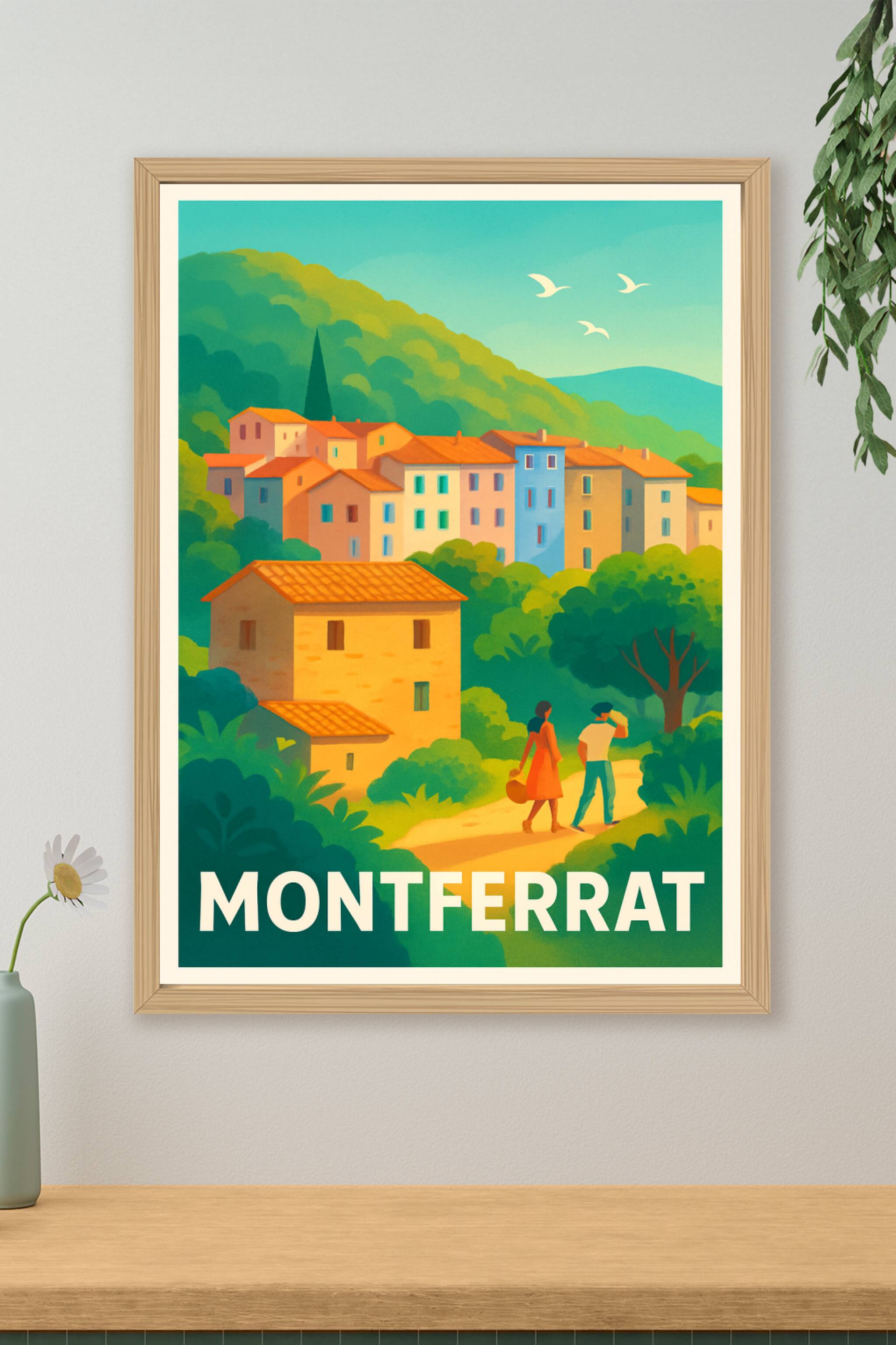 Découvrez la douceur de vivre de Montferrat avec cette affiche illustrée aux couleurs chaleureuses et apaisantes. Ce poster capture l'harmonie entr...