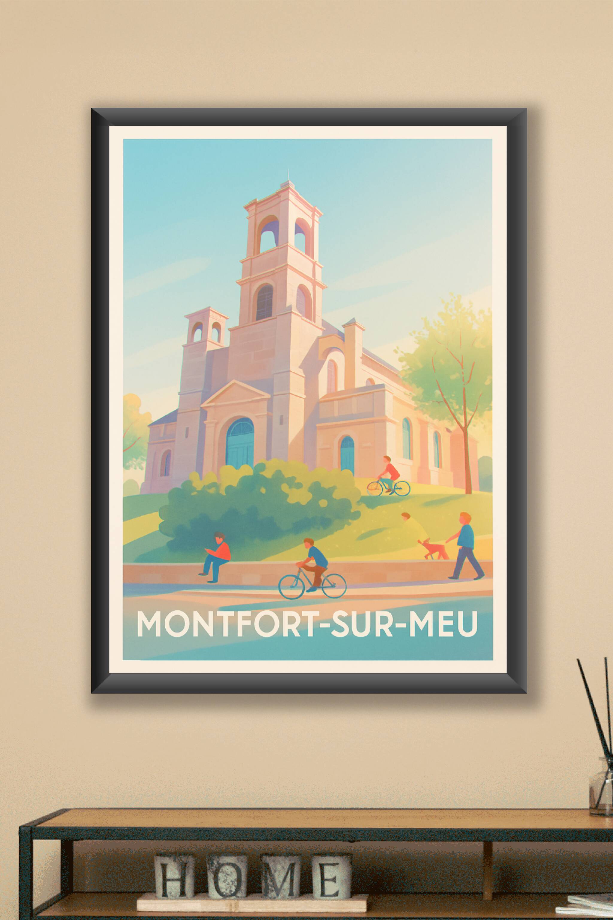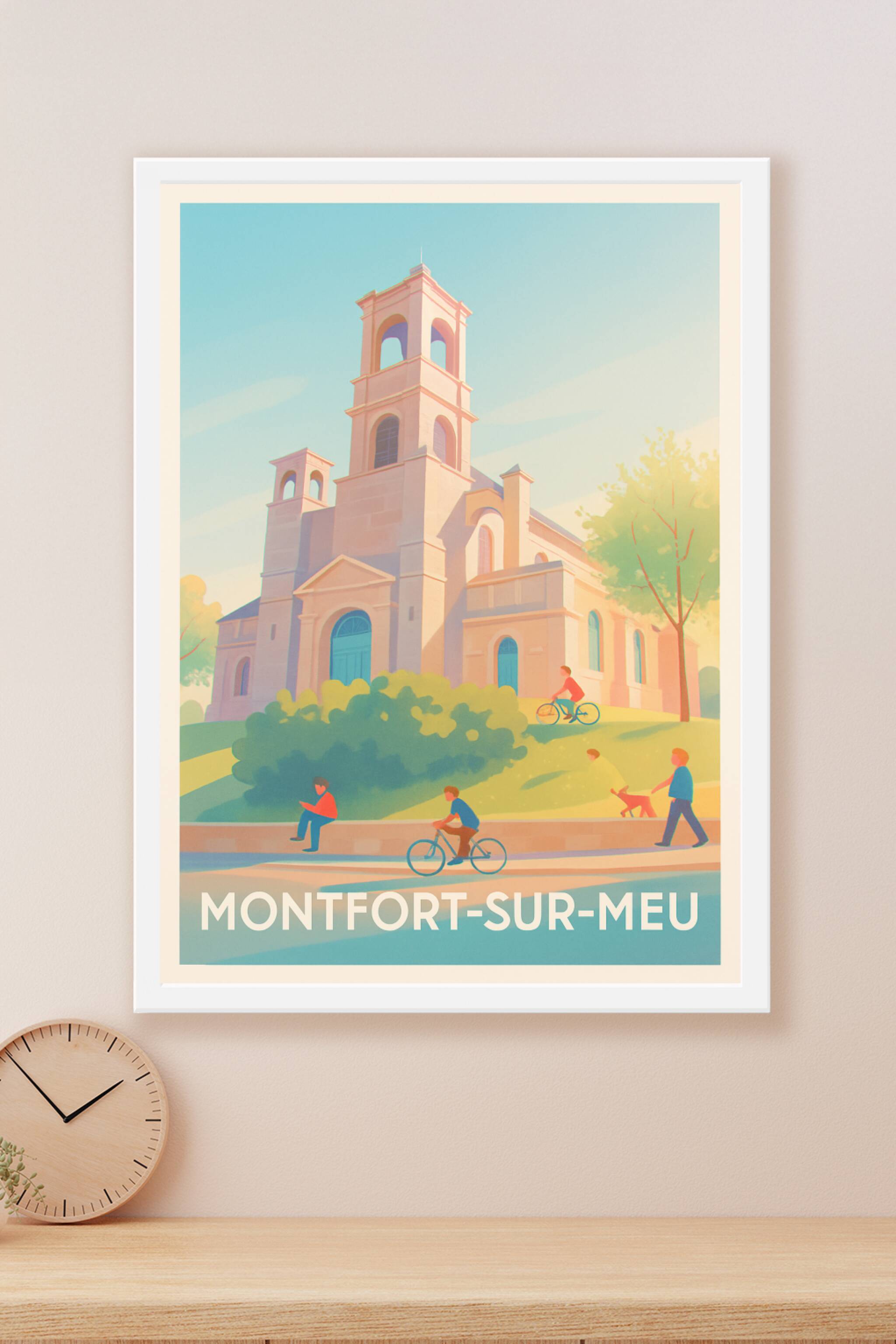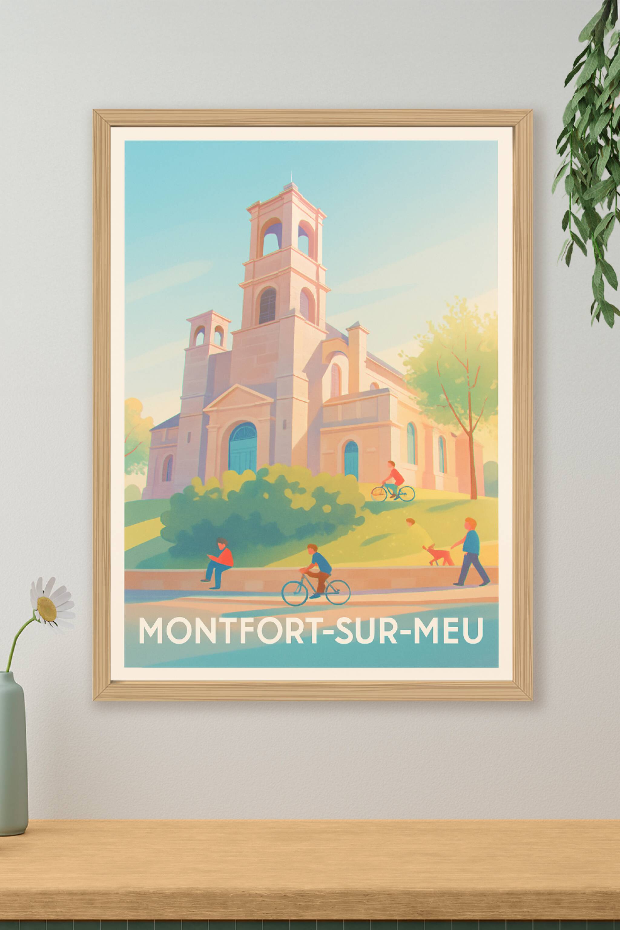 Découvrez l'atmosphère paisible et lumineuse de Montfort-sur-Meu à travers cette affiche illustrée, mettant en avant l'élégante architecture locale...