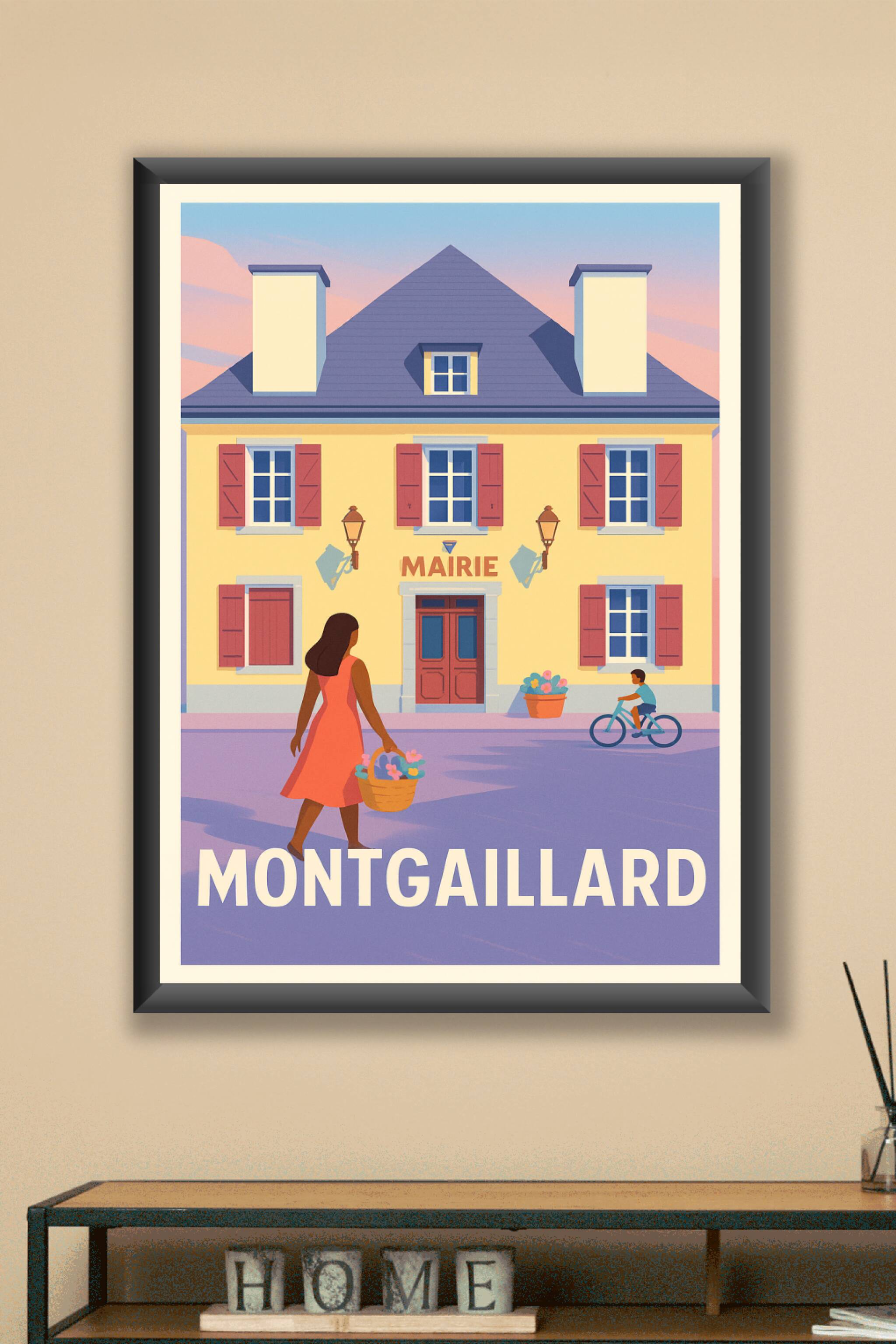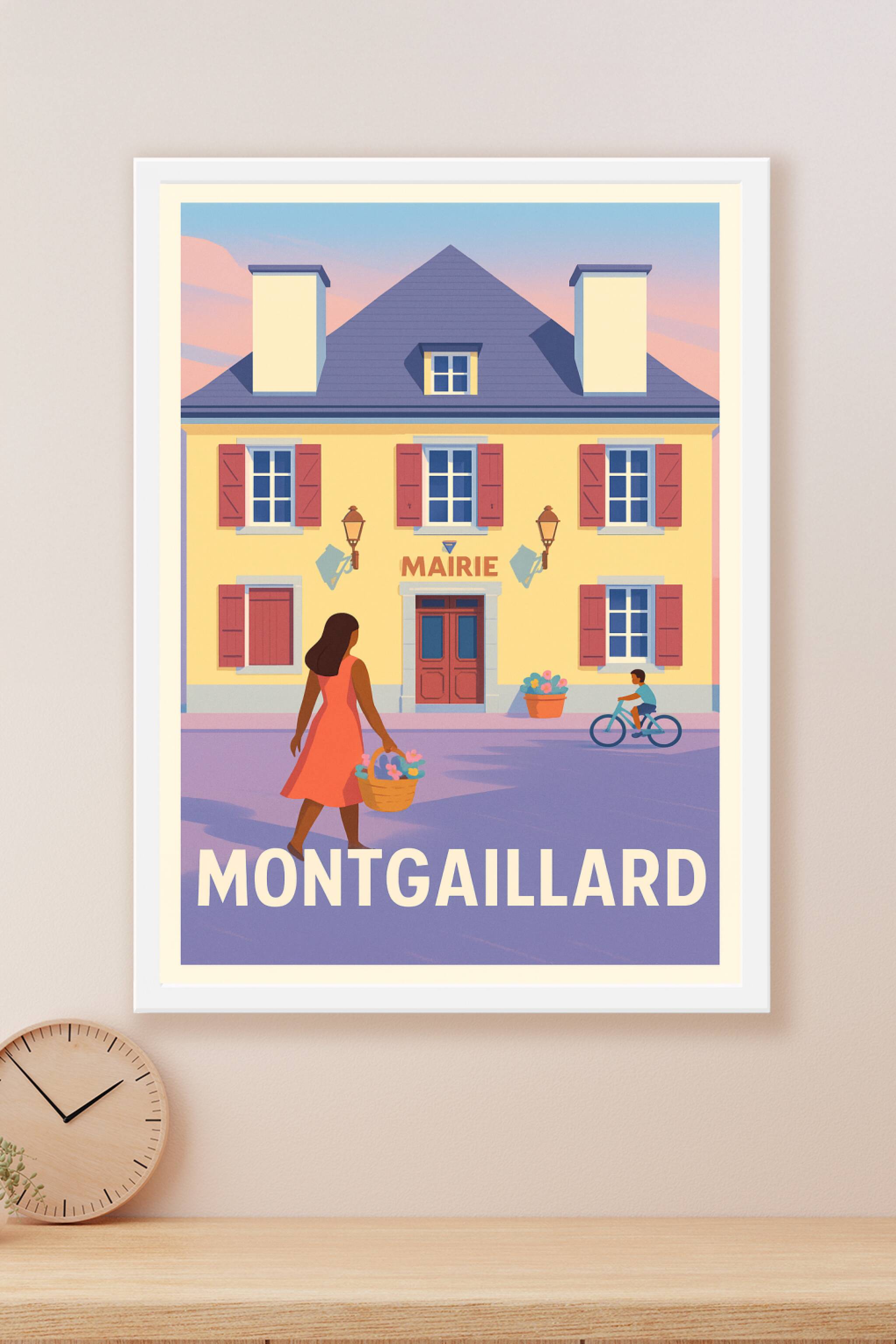 Découvrez l'élégance discrète de Montgaillard grâce à cette affiche illustrée qui capture un moment paisible devant la mairie. Les couleurs chaleur...