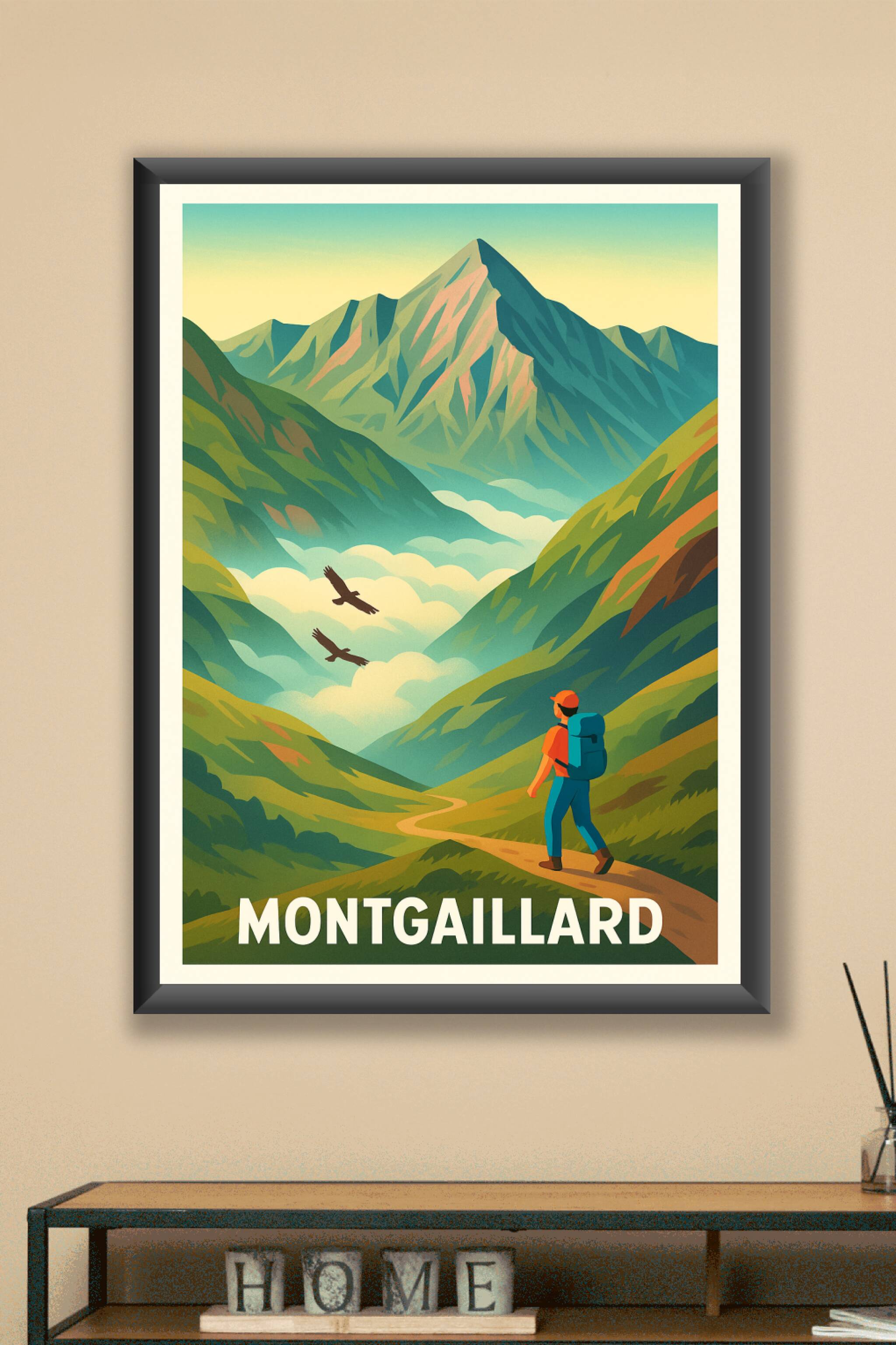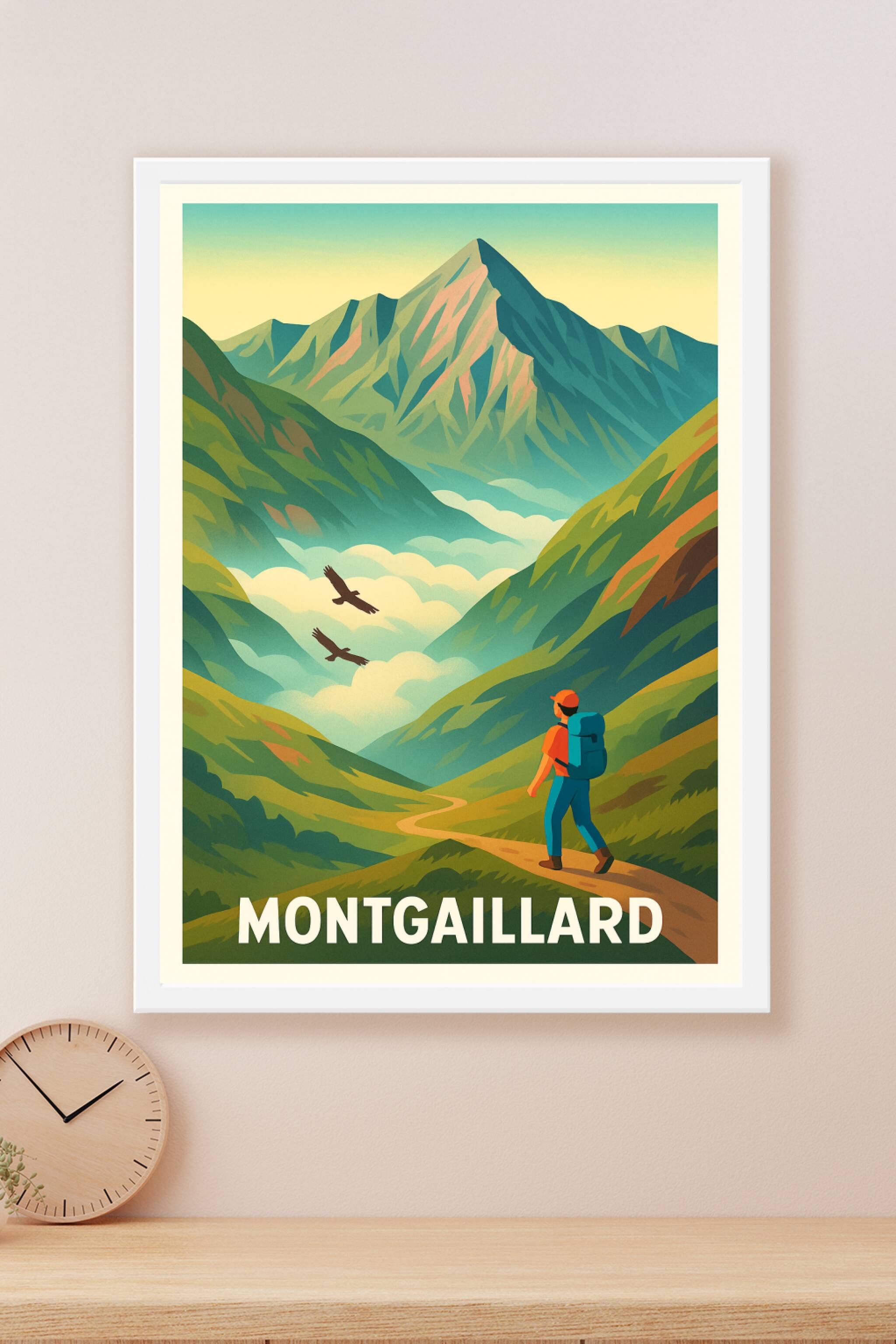 Découvrez la majesté des paysages alpins de Montgaillard avec cette affiche inspirante illustrant un randonneur face à une montagne imposante, dans...