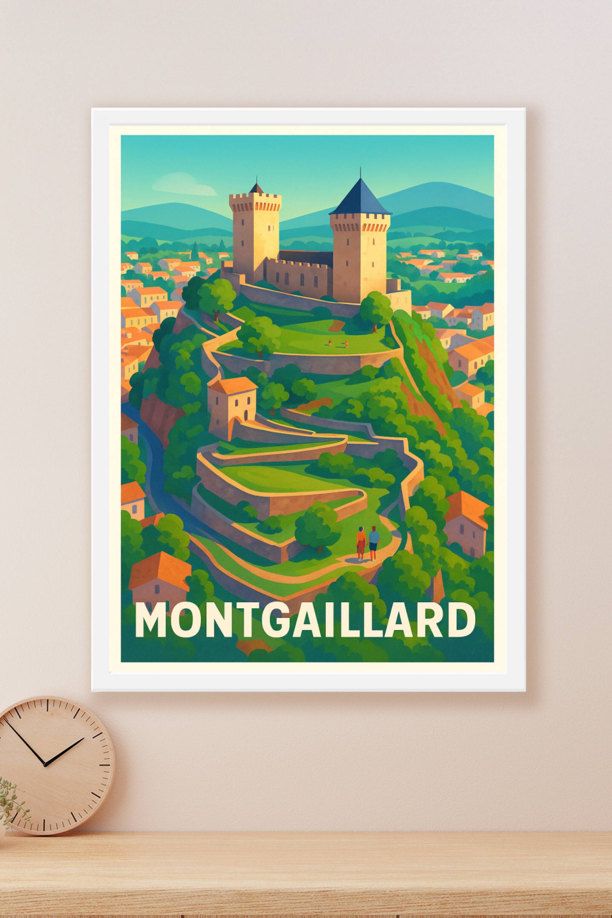 Découvrez la beauté pittoresque de Montgaillard avec cette affiche illustrée mettant en scène son château médiéval perché sur les hauteurs, entouré...