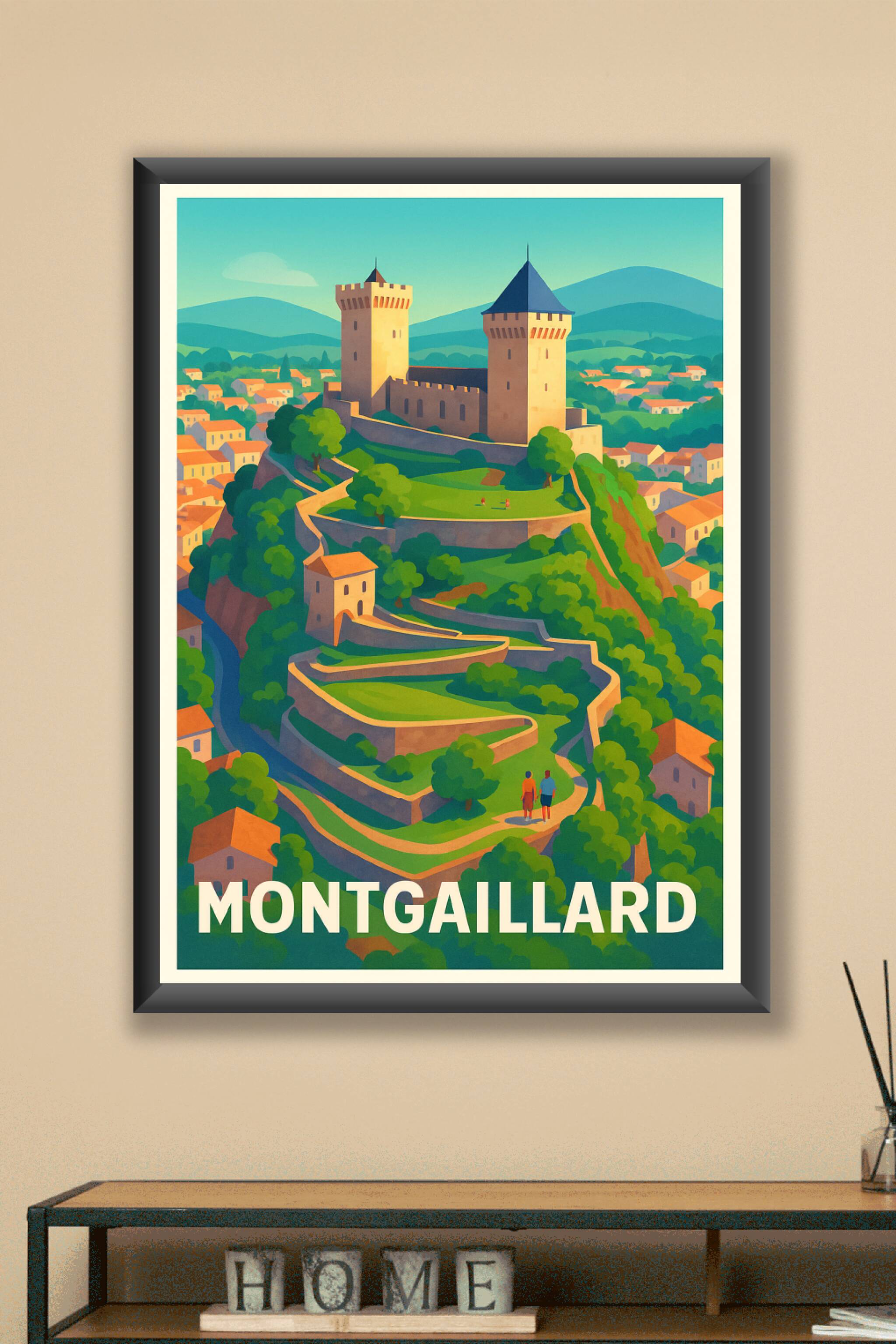 Découvrez la beauté pittoresque de Montgaillard avec cette affiche illustrée mettant en scène son château médiéval perché sur les hauteurs, entouré de collines verdoyantes. Ce poster allie charme historique et paysage apaisant, parfait pour apporter une touche authentique et colorée à votre décoration intérieure. Imprimée en tirage "Fine Art" sur papier 305g coton de haute qualité, cette affiche garantit des couleurs vibrantes et une durabilité exceptionnelle. Disponible en formats A1 à A4, avec ou sans cadre, elle s'adapte à tous les styles d'intérieur. Offrez-vous ou faites plaisir à un amateur de patrimoine avec ce souvenir raffiné, 100% fabriqué en France.
