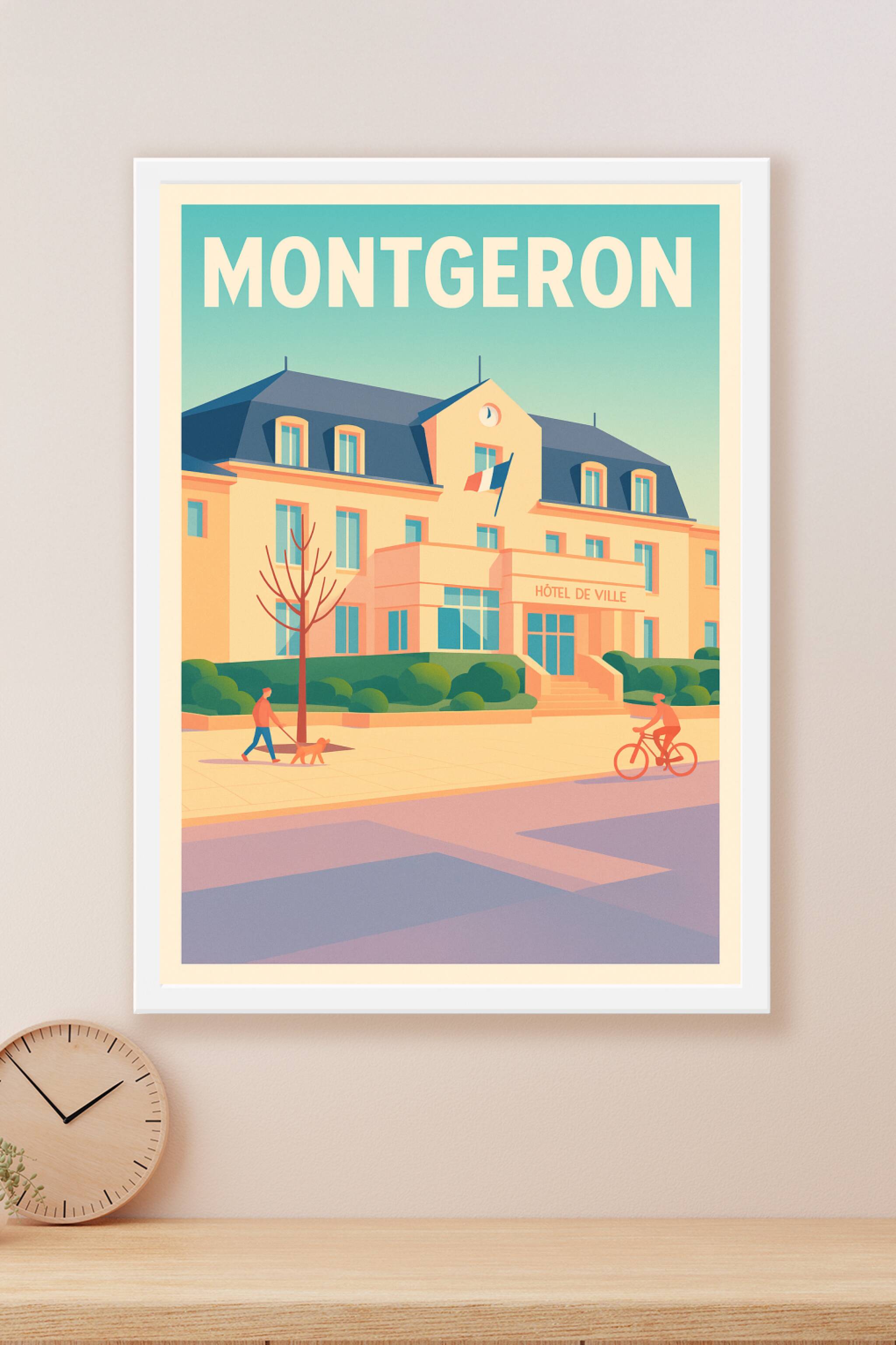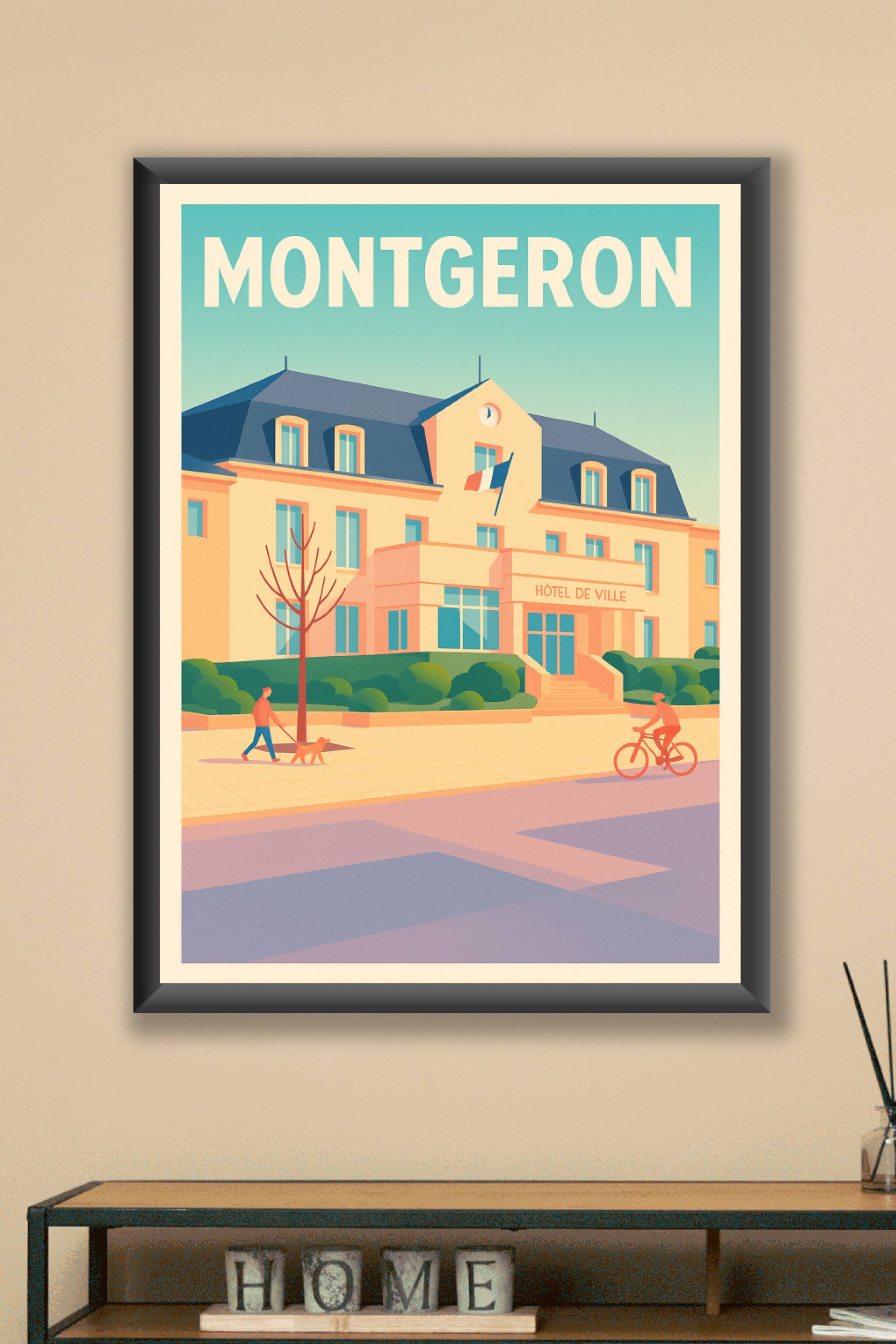 Découvrez cette affiche illustrée qui capture la douceur de vivre à Montgeron, avec son emblématique Hôtel de Ville baigné d'une lumière douce et p...