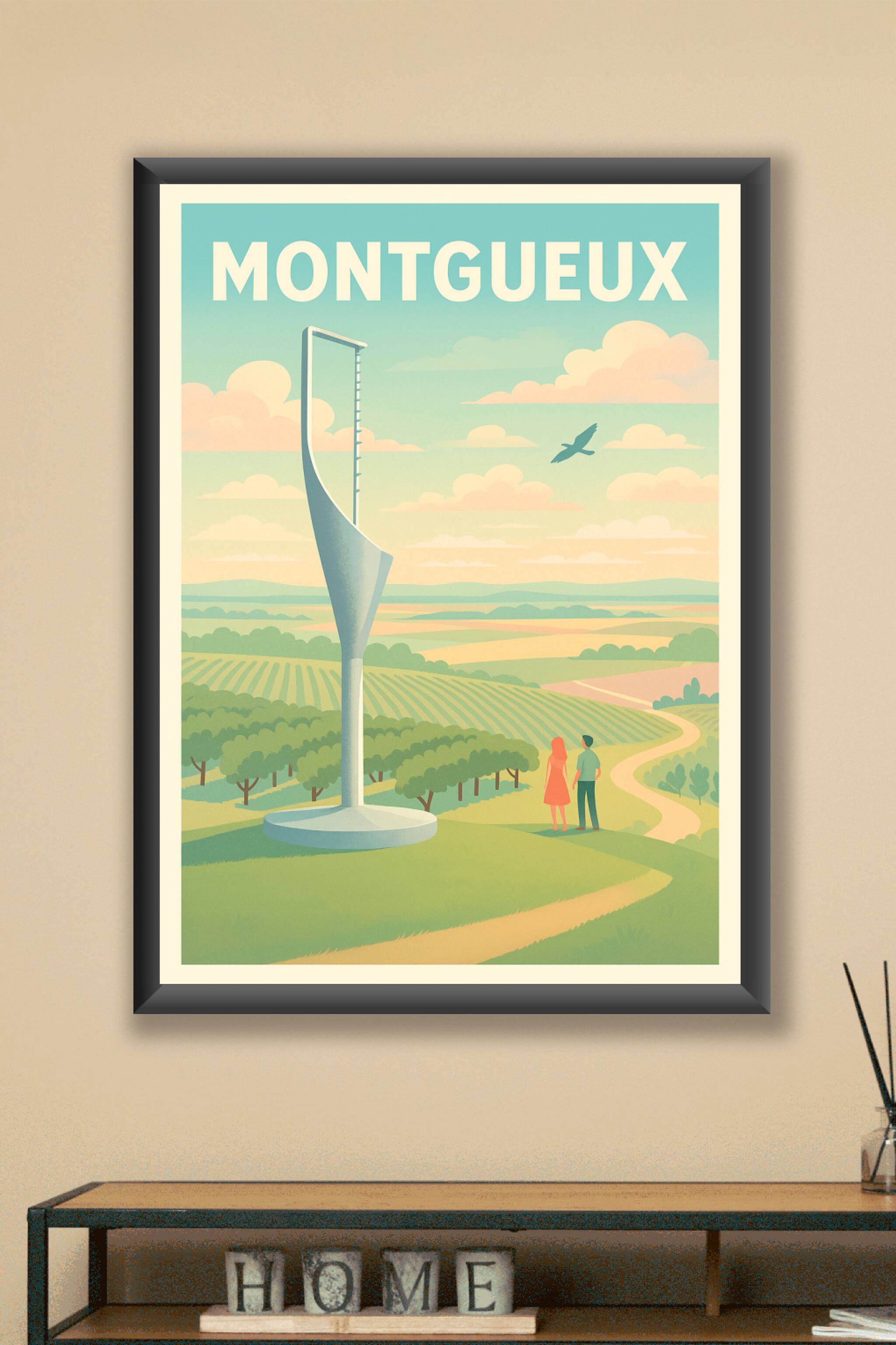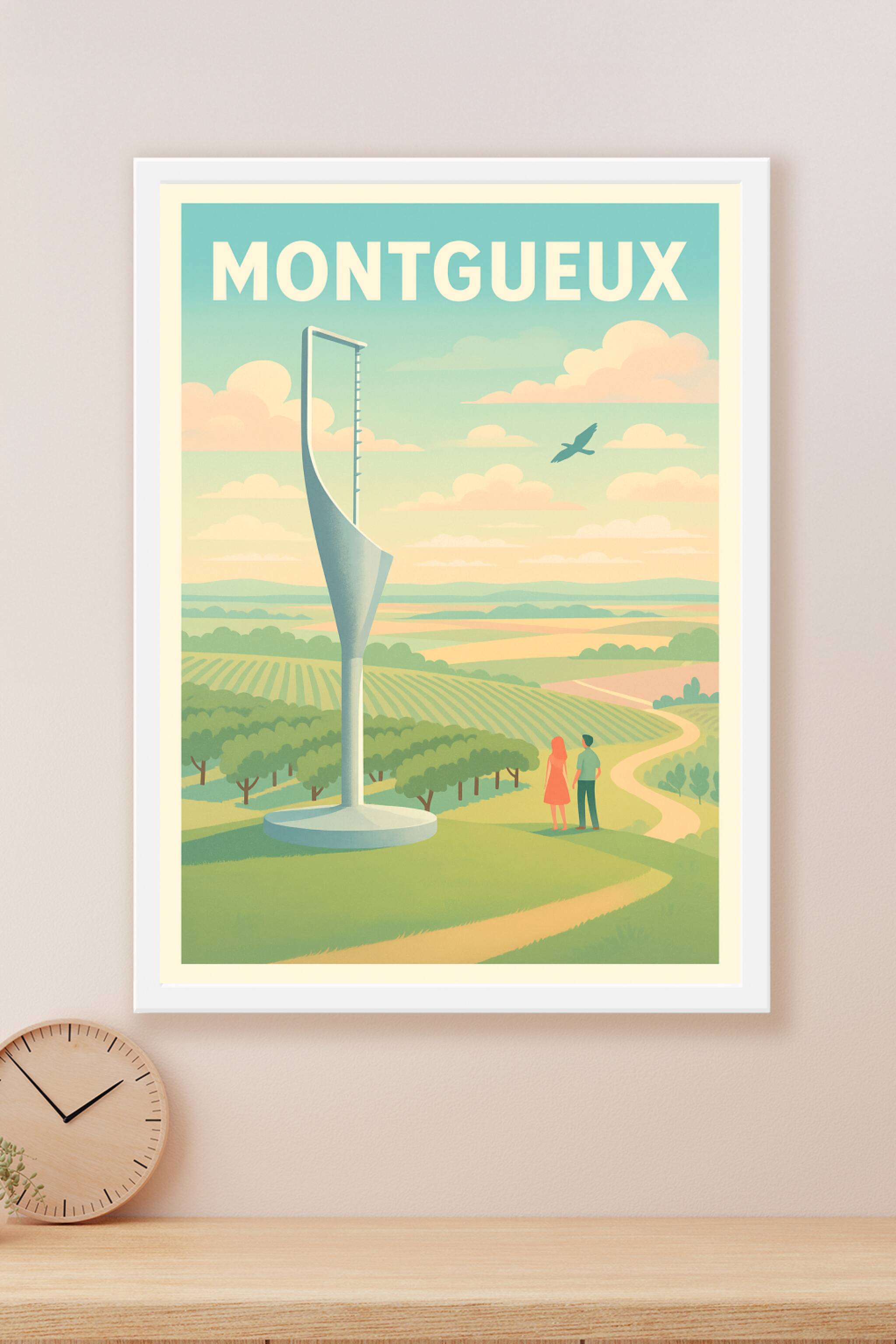 Découvrez Montgueux à travers cette affiche au style vintage moderne qui célèbre la beauté paisible des vignobles champenois. Cette illustration me...