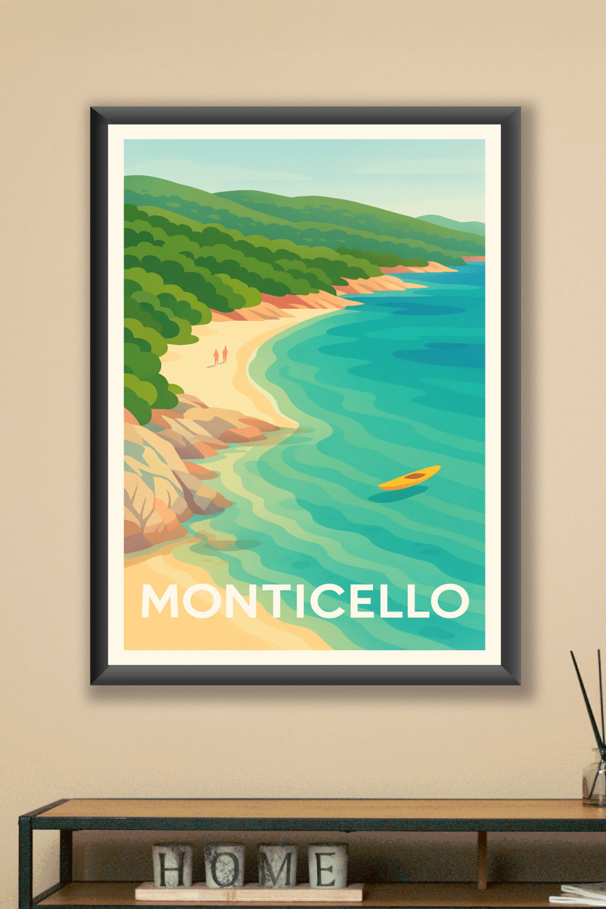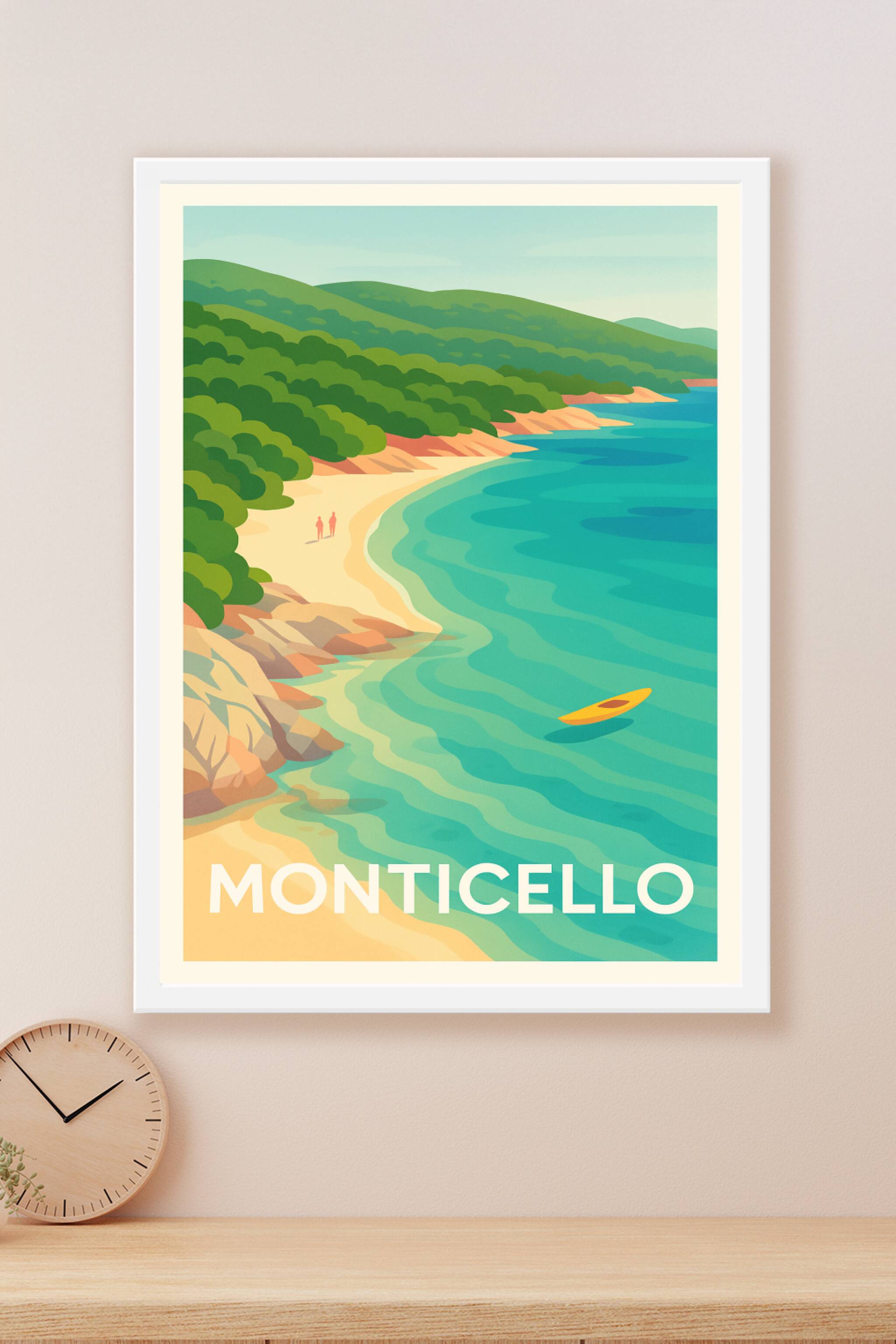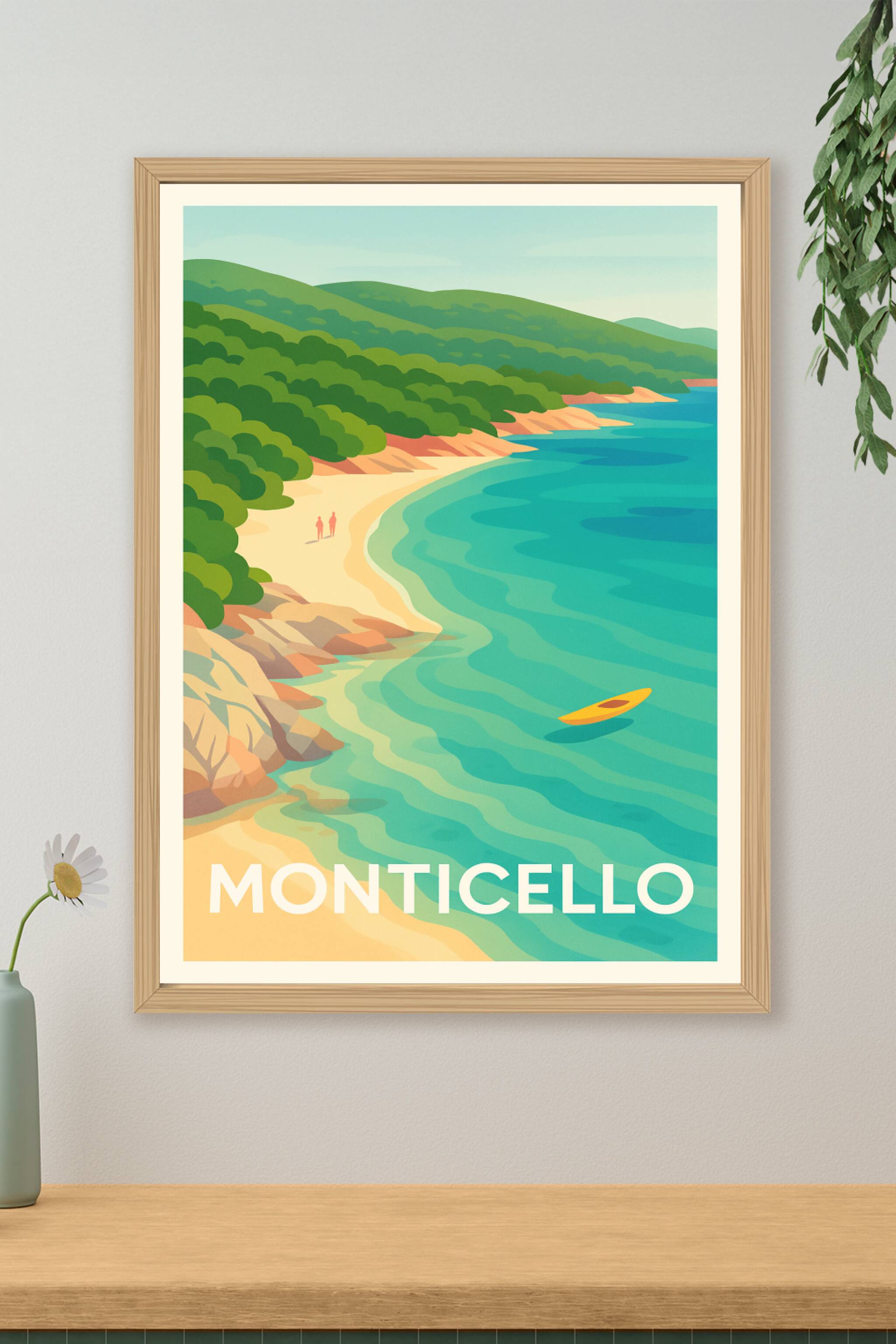 Laissez-vous séduire par l'atmosphère paisible et ensoleillée de Monticello avec cette affiche au design épuré et aux couleurs harmonieuses. Cette vue idyllique révélé par ce poster met en avant la côte bordée de sable doré, la mer turquoise et la végétation luxuriante qui caractérisent ce charmant coin de Méditerranée.Ce poster est imprimé en tirage "Fine Art" sur papier 305g coton, garantissant une qualité d'impression exceptionnelle et une tenue durable des couleurs. Disponible en plusieurs formats, de l'A1 à l'A4, avec ou sans cadre, cette affiche est parfaite pour ajouter une touche de quiétude et de nature à votre décoration intérieure.Fabriquée en France avec un savoir-faire premium, cette affiche Monticello est idéale pour offrir ou sublimer votre espace avec une invitation au voyage et à la détente.