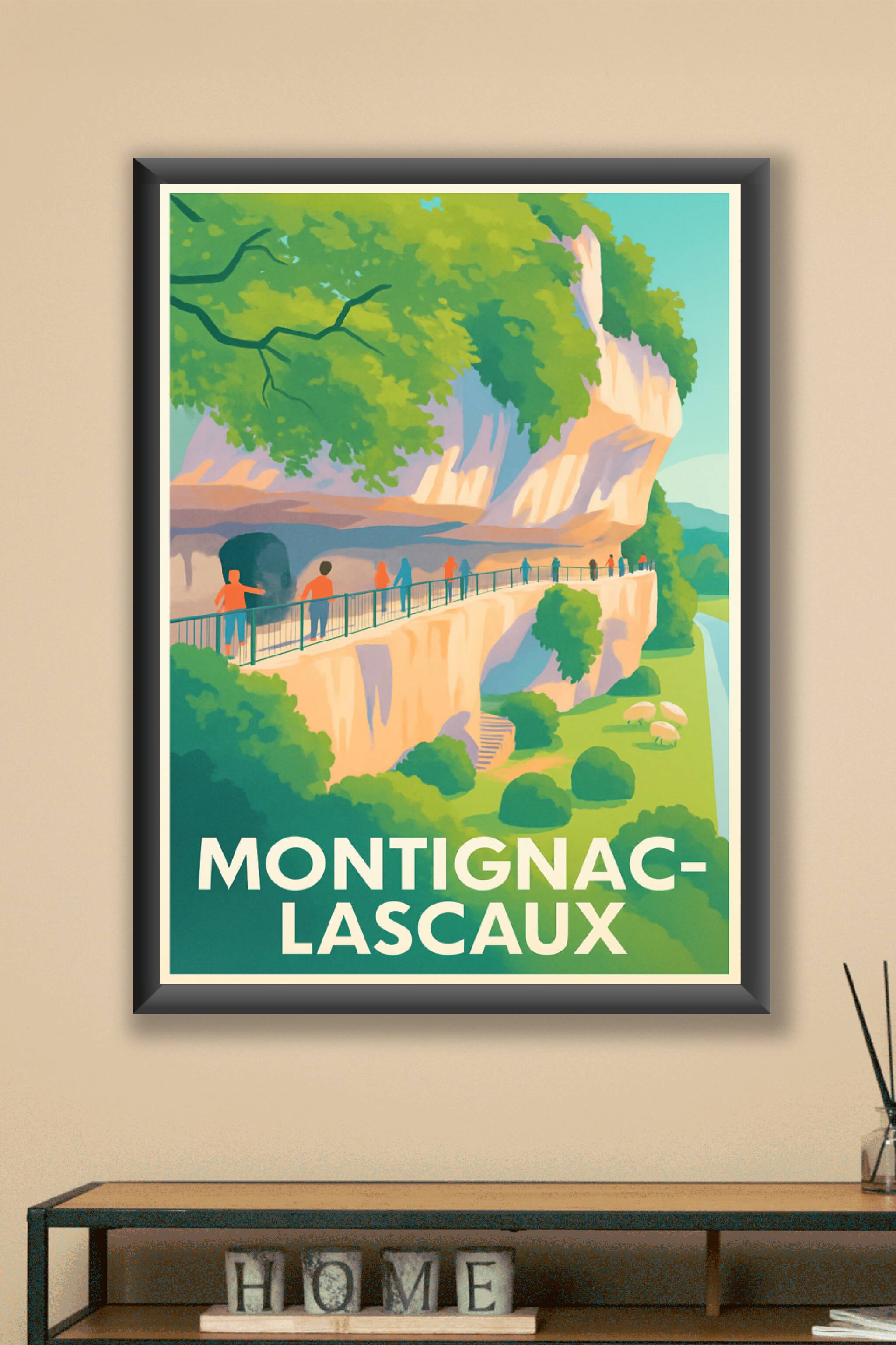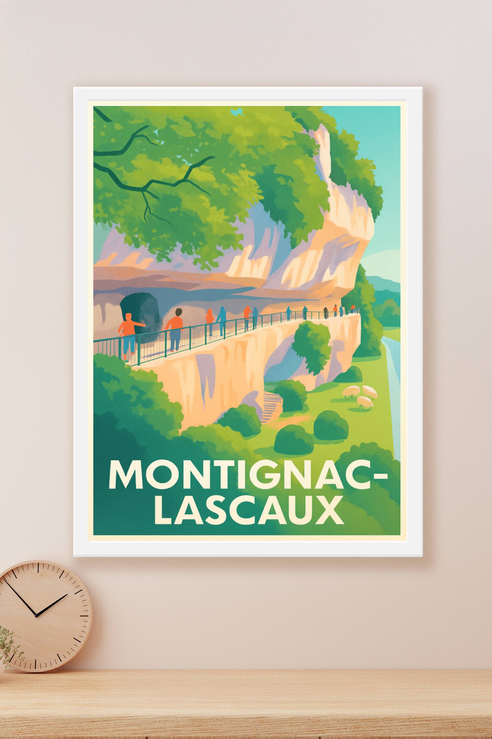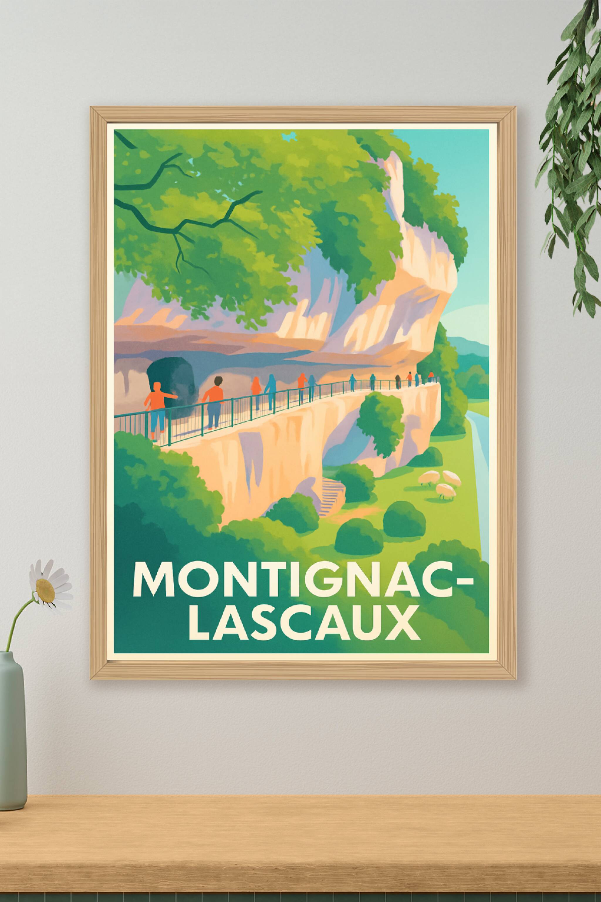 Découvrez la majesté des falaises de Montignac-Lascaux à travers cette affiche art déco qui invite à une promenade contemplative au sommet des célè...