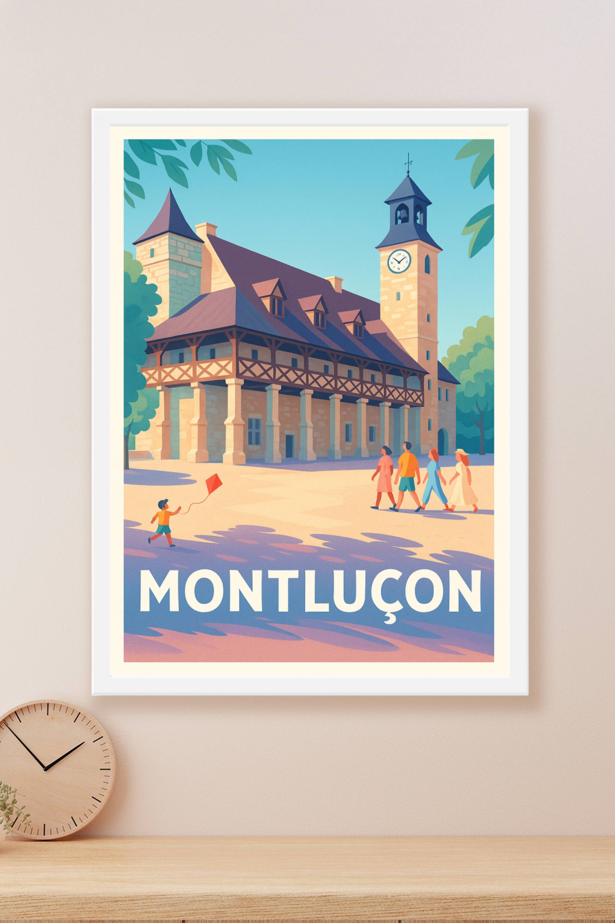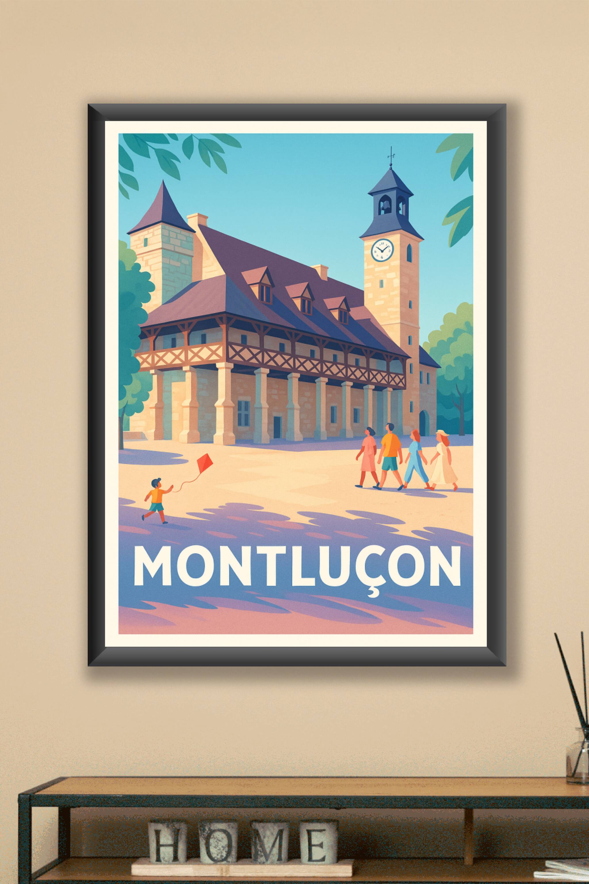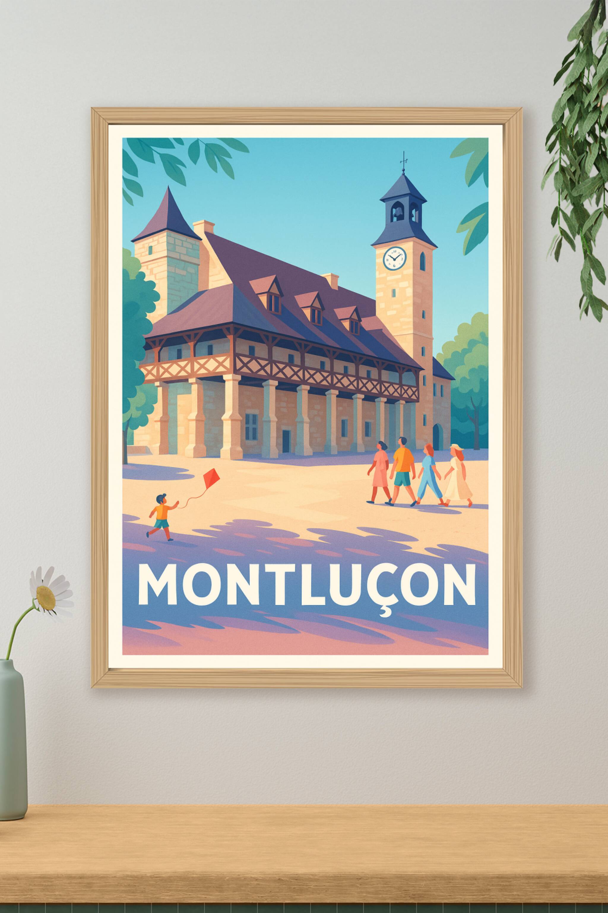 Découvrez le charme historique de Montluçon avec cette affiche illustrée au style rétro moderne, mettant en lumière l'architecture emblématique de ...