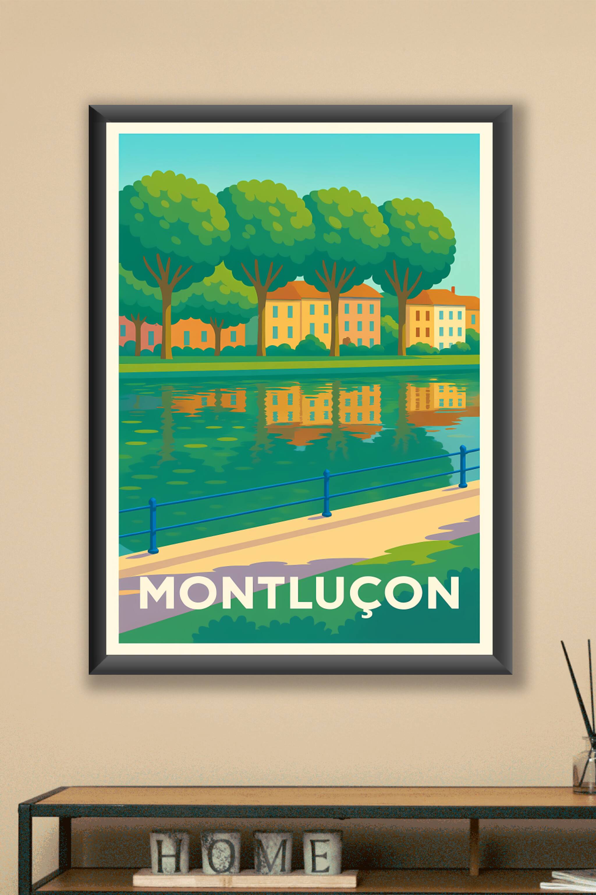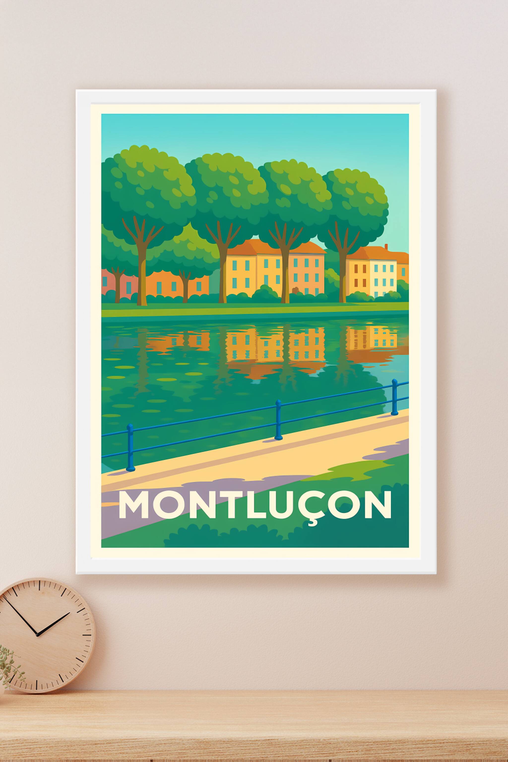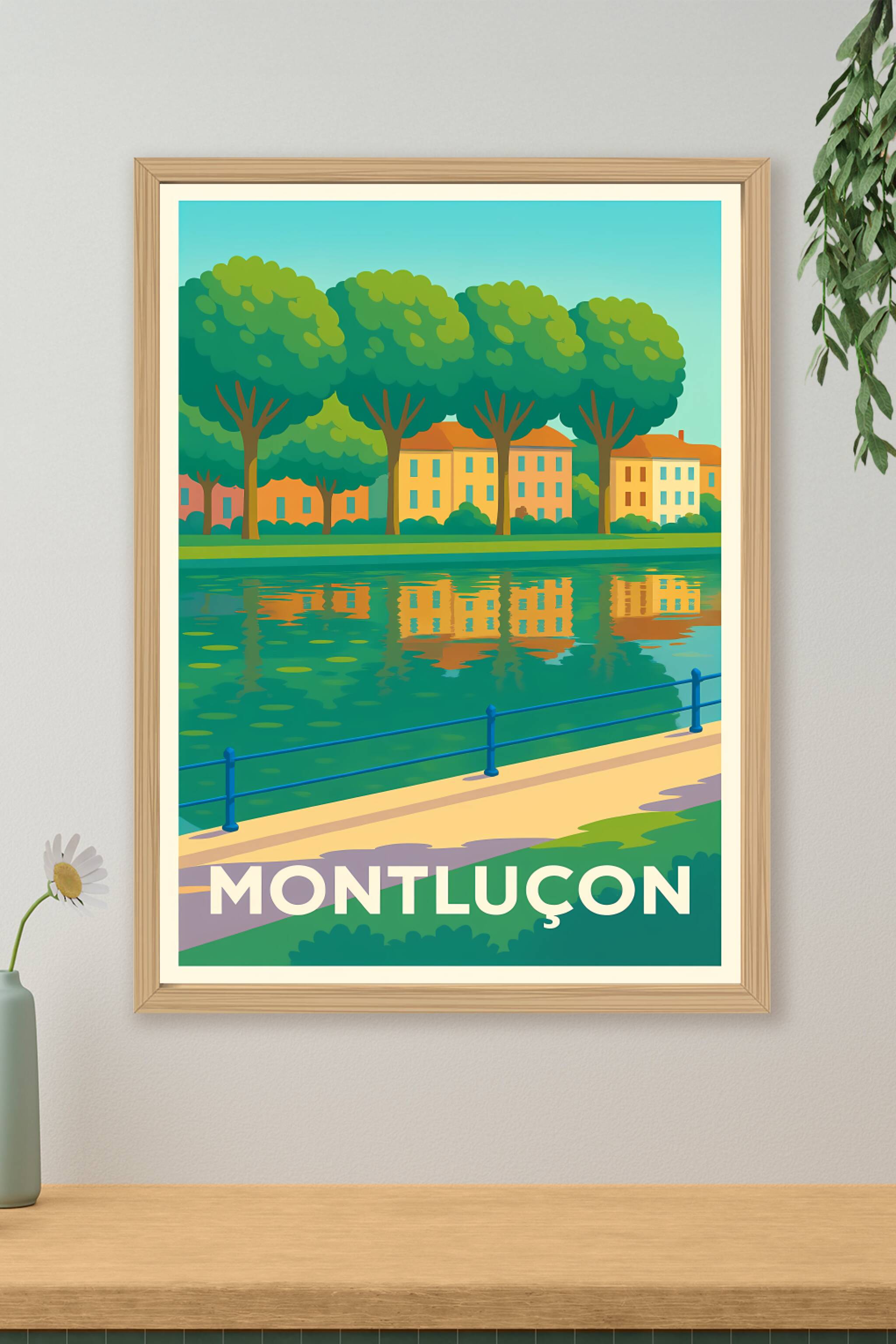 Découvrez l'atmosphère paisible de Montluçon avec cette affiche inspirante montrant une promenade au bord de l'eau, entourée d'arbres majestueux et...