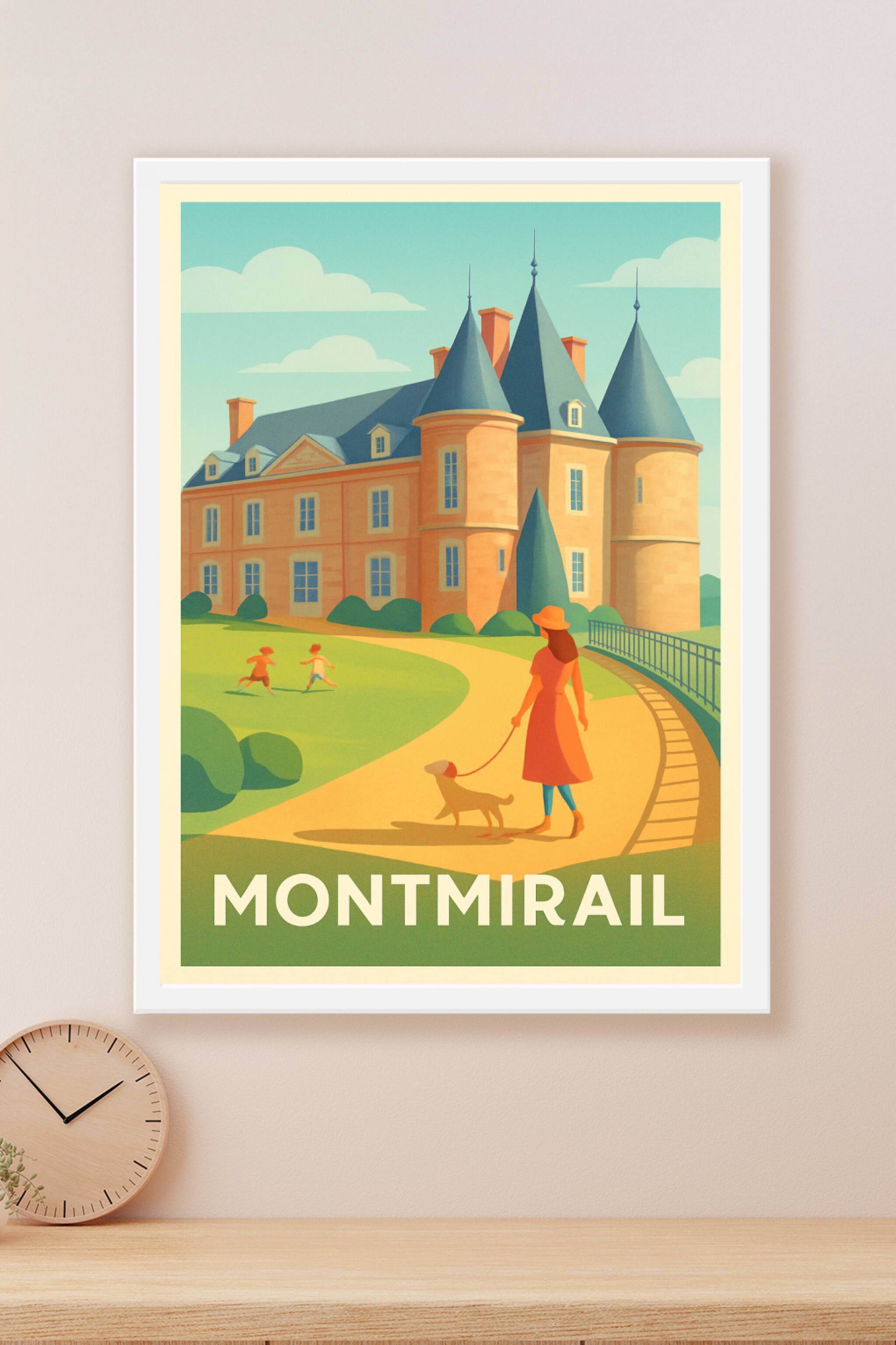 Découvrez cette superbe affiche illustrée mettant en scène le château emblématique de Montmirail, baigné d'une lumière douce et chaleureuse. Un pos...