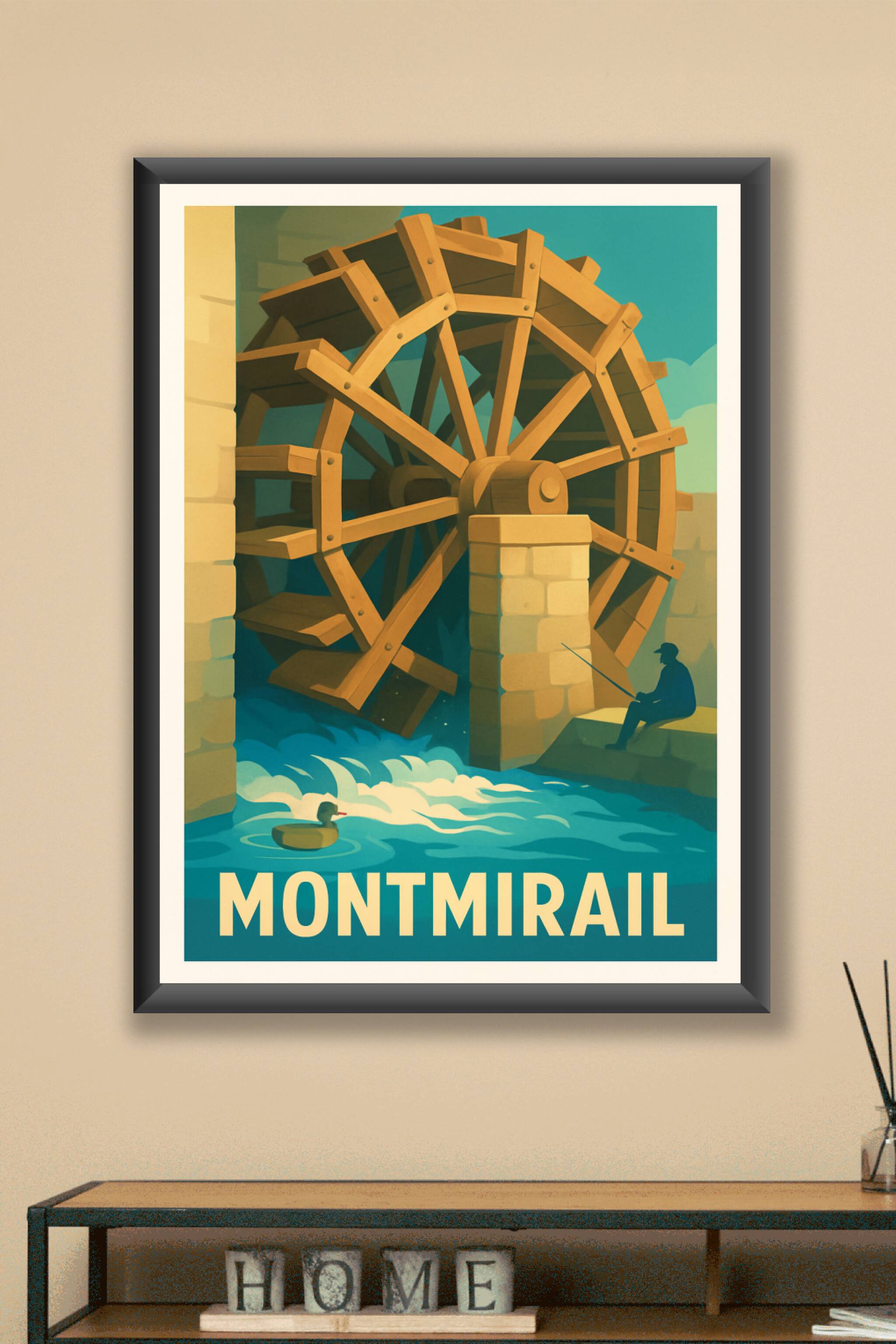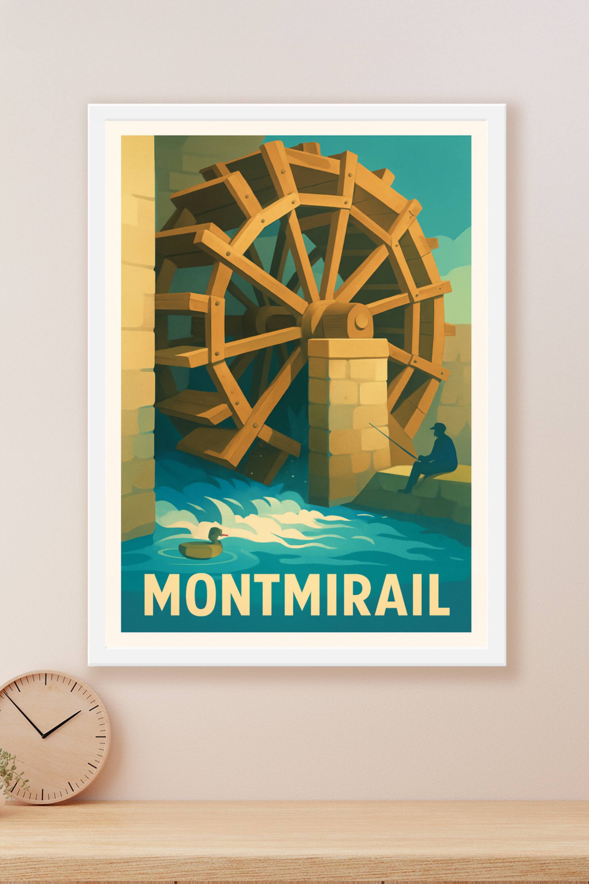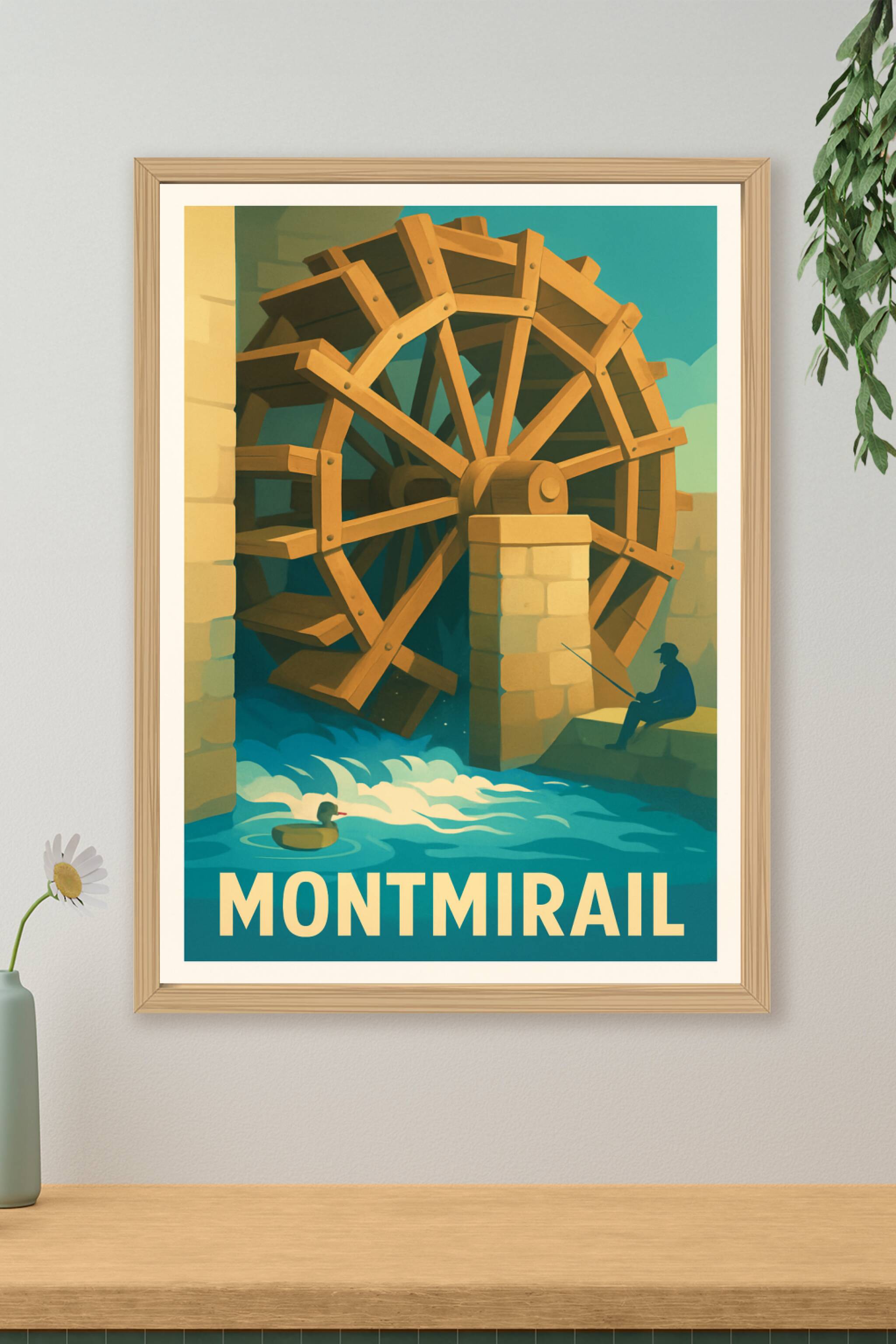 Découvrez l'atmosphère tranquille et authentique de Montmirail à travers cette affiche illustrée mettant en scène une roue à eau en bois emblématiq...