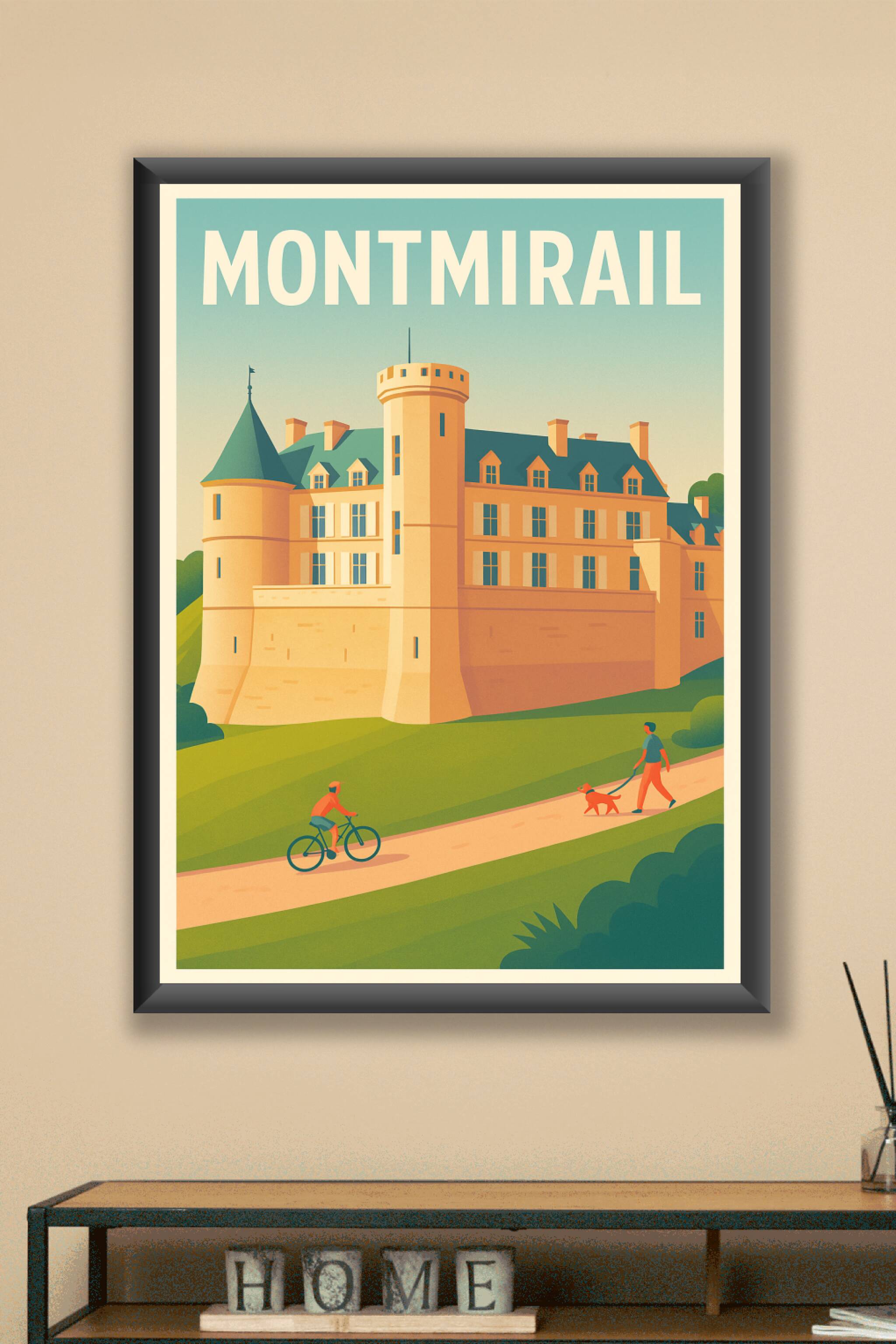 Cette affiche illustre avec charme le château emblématique de Montmirail, un véritable bijou architectural niché dans un écrin de verdure. L'ambian...