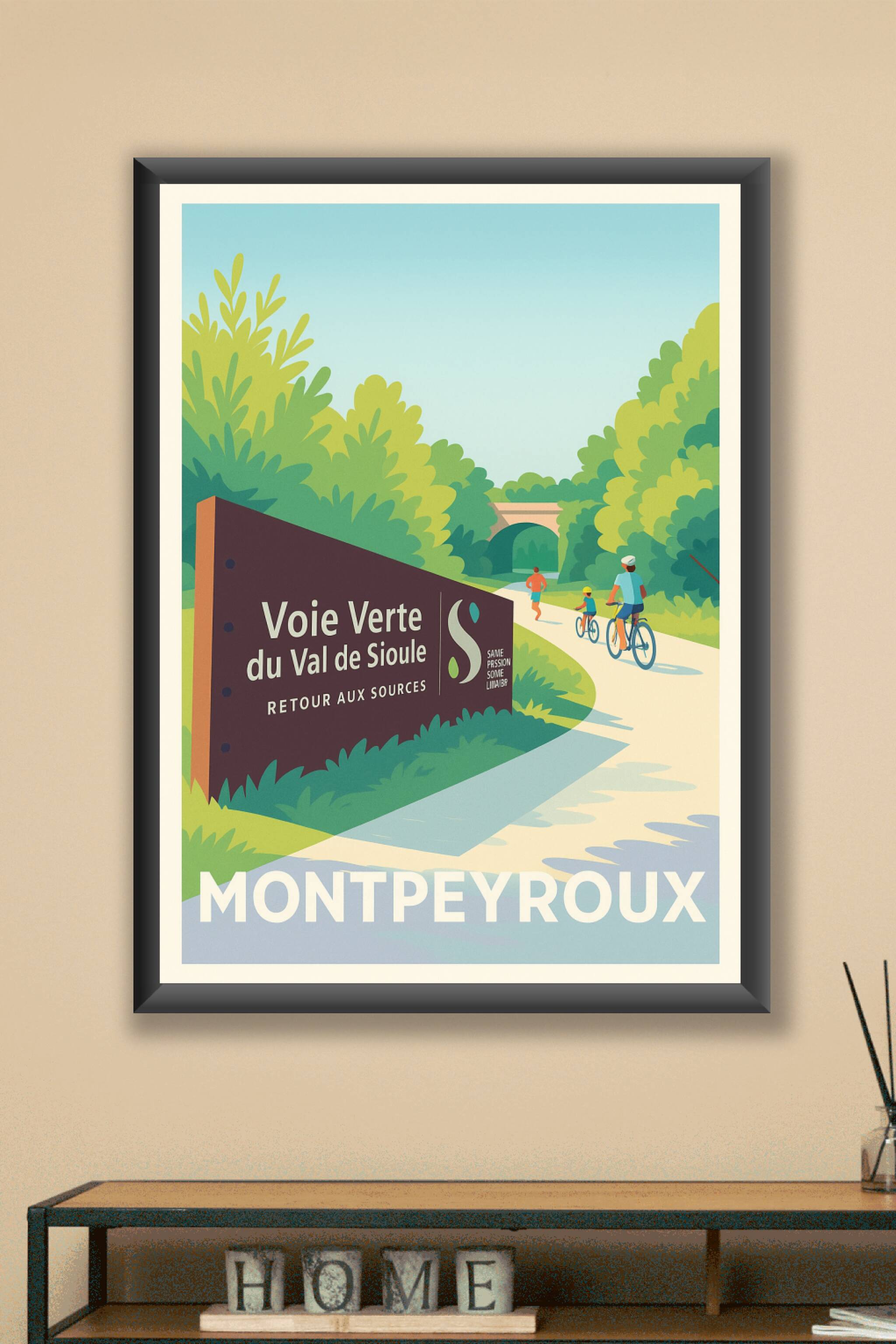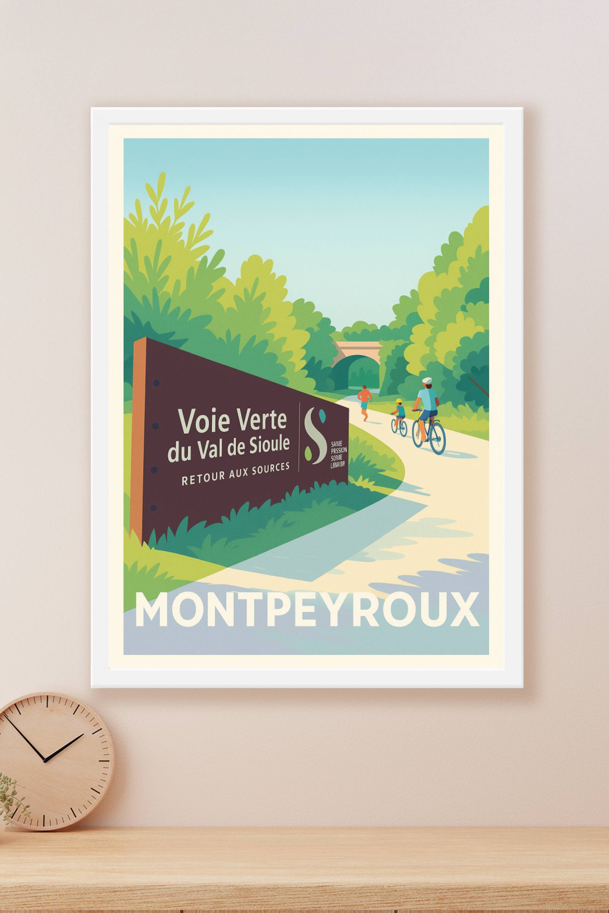 Découvrez la sérénité de la Voie Verte du Val de Sioule avec cette affiche illustrant un sentier bordé de verdure où cyclistes et joggeurs partagen...