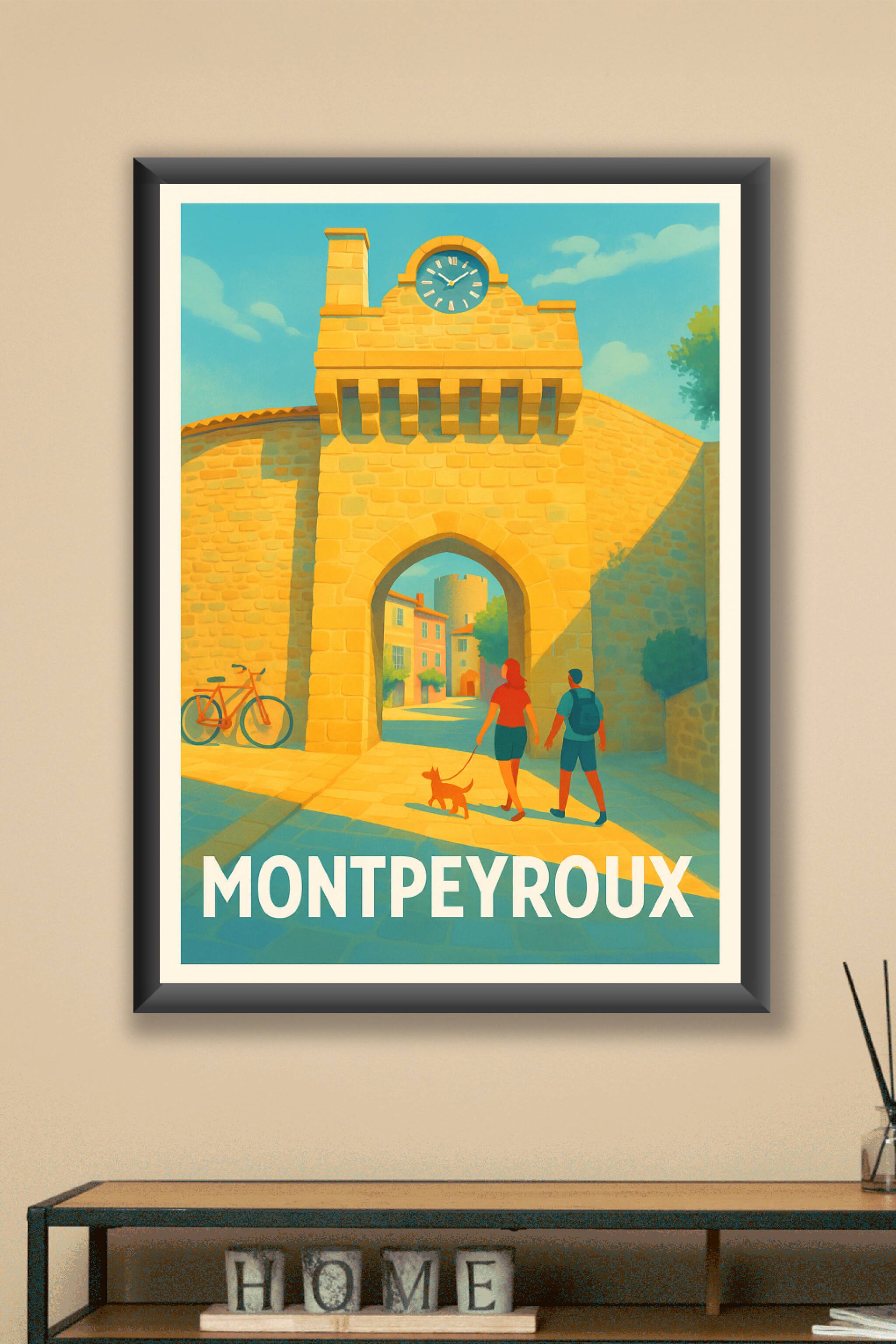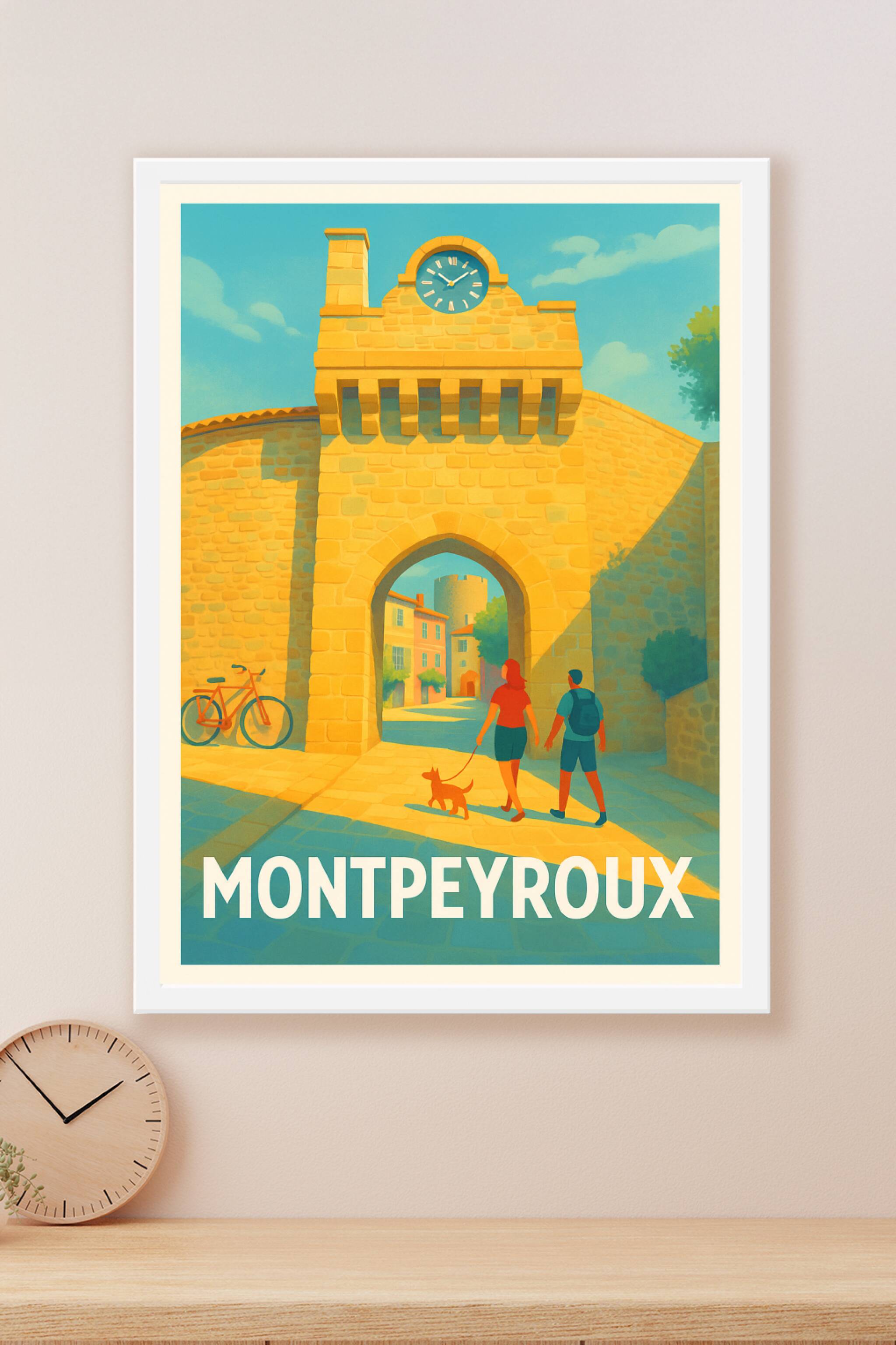 Découvrez la charmante ville de Montpeyroux à travers cette affiche vintage pleine de lumière et de douceur. Le poster met en scène l'entrée emblématique du village avec ses pierres dorées baignées par un soleil radieux, tandis qu'un couple se promène avec son chien, illustrant l'atmosphère paisible et chaleureuse du lieu. Disponible en tirage Fine Art sur papier 305g coton, cette affiche offre une qualité d'impression exceptionnelle et une résistance durable. Choisissez le format qui vous convient parmi les options A1 à A4, avec ou sans cadre, pour intégrer à votre intérieur cette invitation au voyage et à la sérénité, ou pour offrir un souvenir authentique de Montpeyroux.