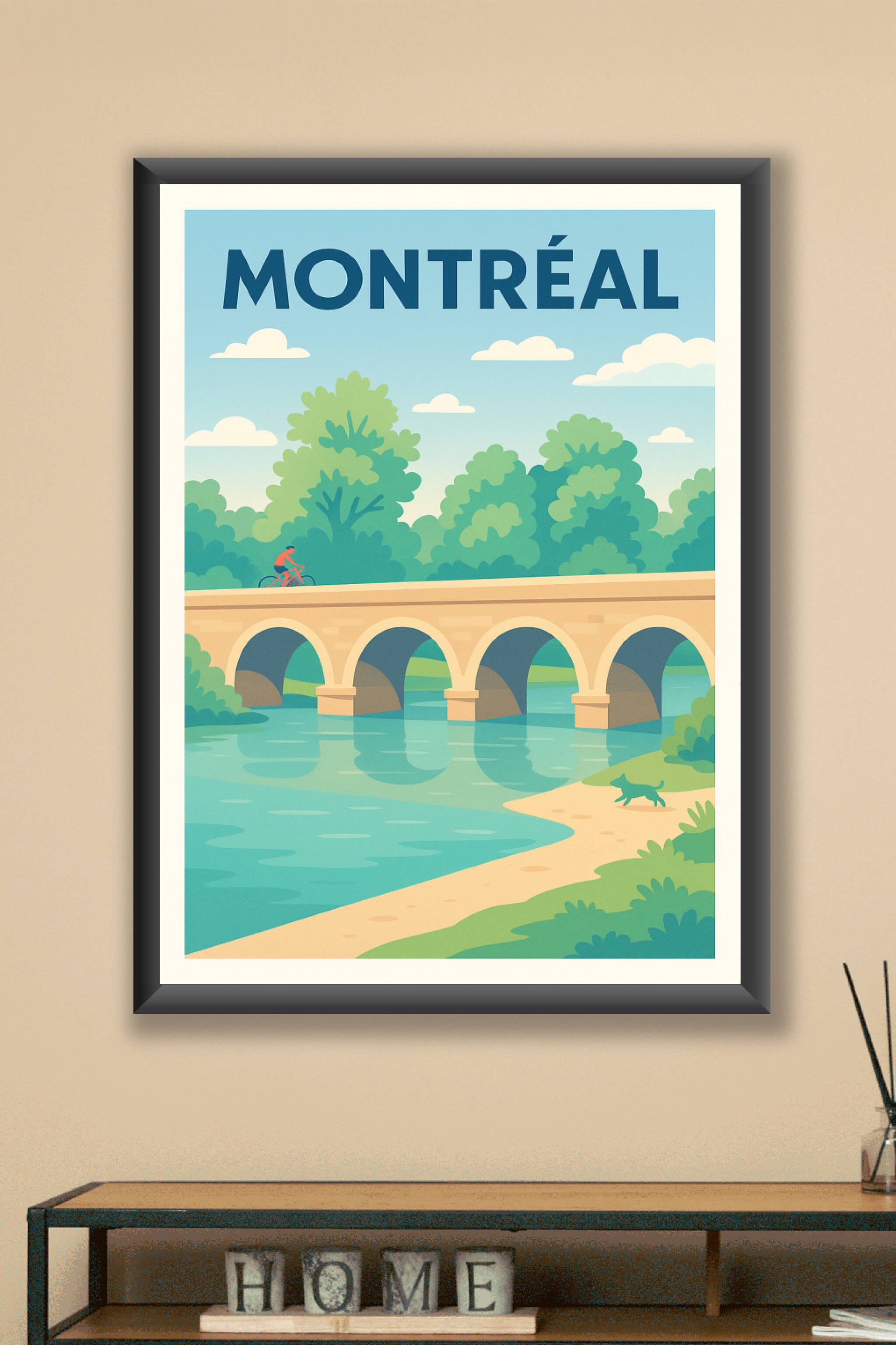 Découvrez la douceur et le calme de Montréal avec cette affiche illustrée représentant un pont historique traversant une rivière paisible, entourée d'arbres verdoyants. Un cycliste et un chien se promènent pour ajouter une touche de vie et d'aventure à cette scène tranquille. Ce poster est imprimé en tirage "Fine Art" sur un papier 305g coton haut de gamme, garantissant une qualité d'impression exceptionnelle et une durabilité remarquable. Disponible en formats A1 à A4, avec ou sans cadre, cette affiche apportera une ambiance apaisante et naturelle à votre intérieur. Profitez d'une fabrication 100% française pour sublimer votre décoration ou offrir un cadeau raffiné aux amoureux de Montréal.