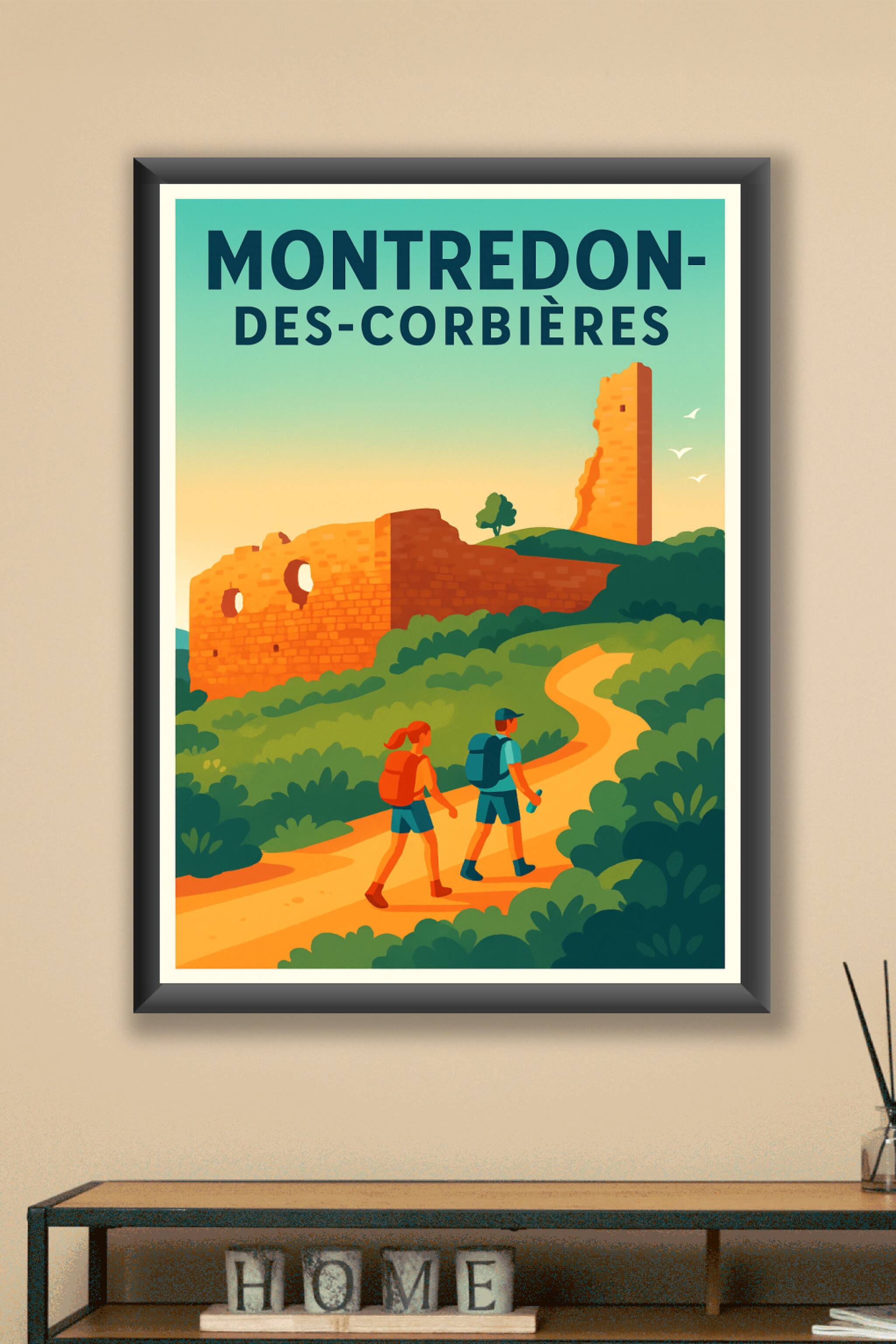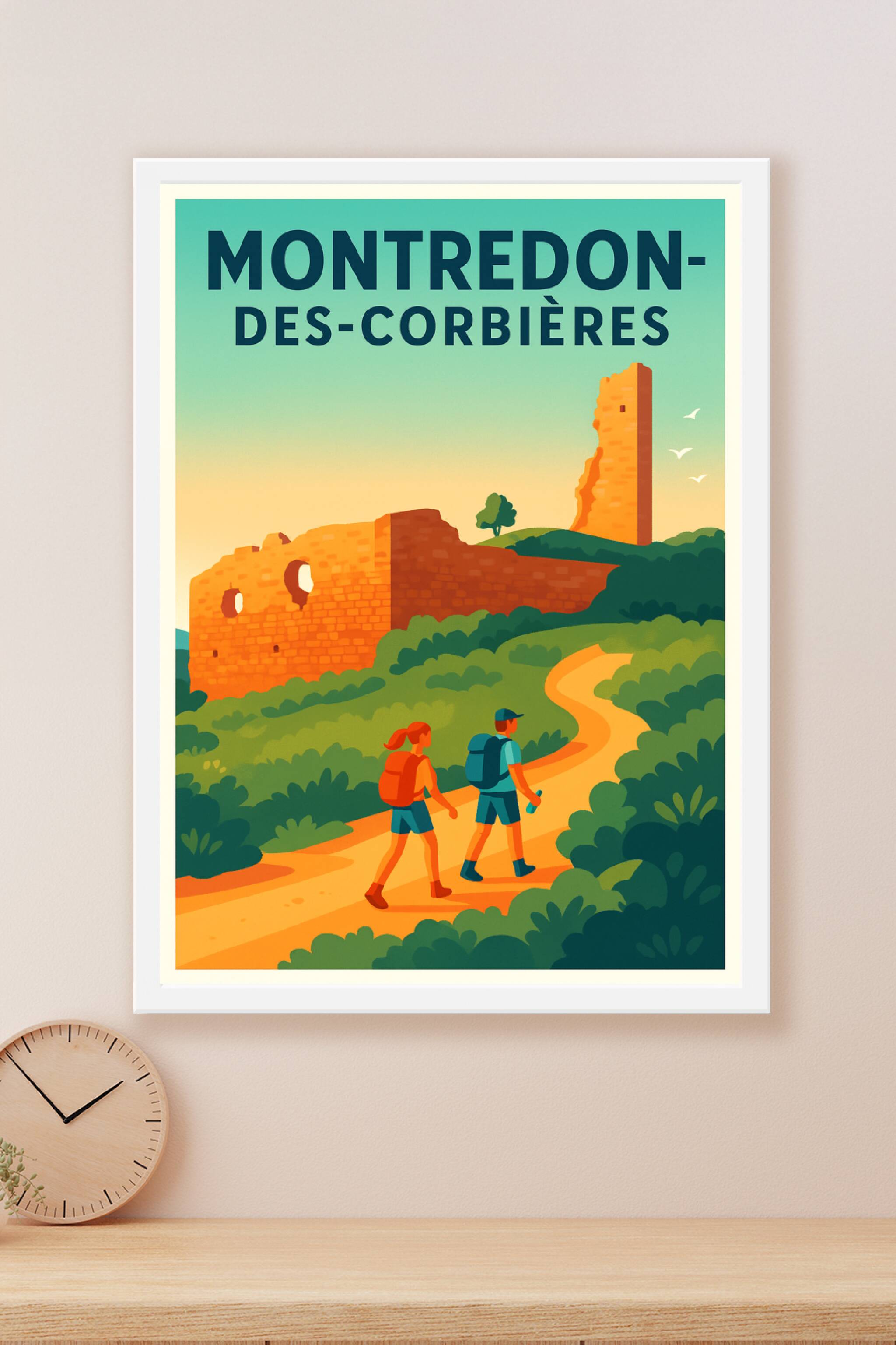 Découvrez Montredon-des-Corbières à travers cette affiche illustrée qui met en avant l'harmonie entre nature et histoire, avec ses vestiges médiéva...