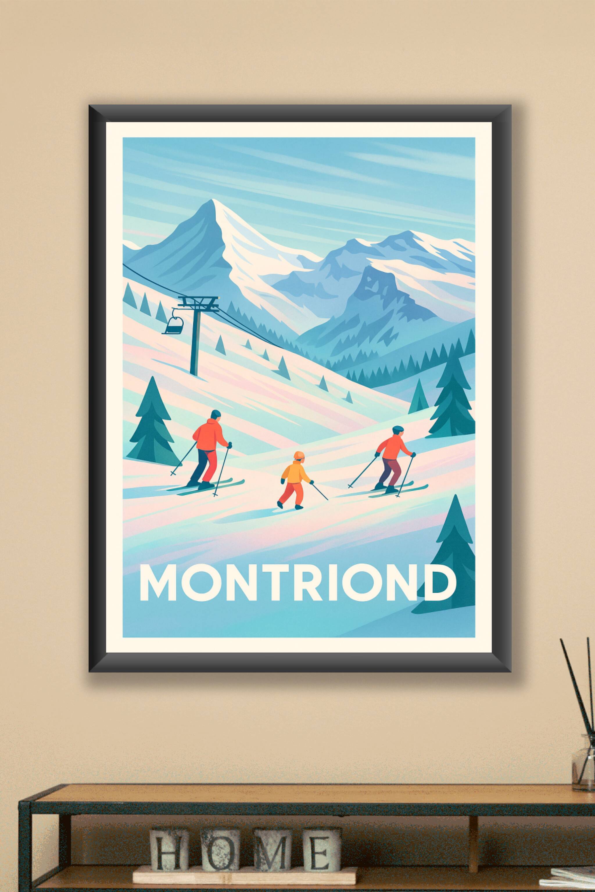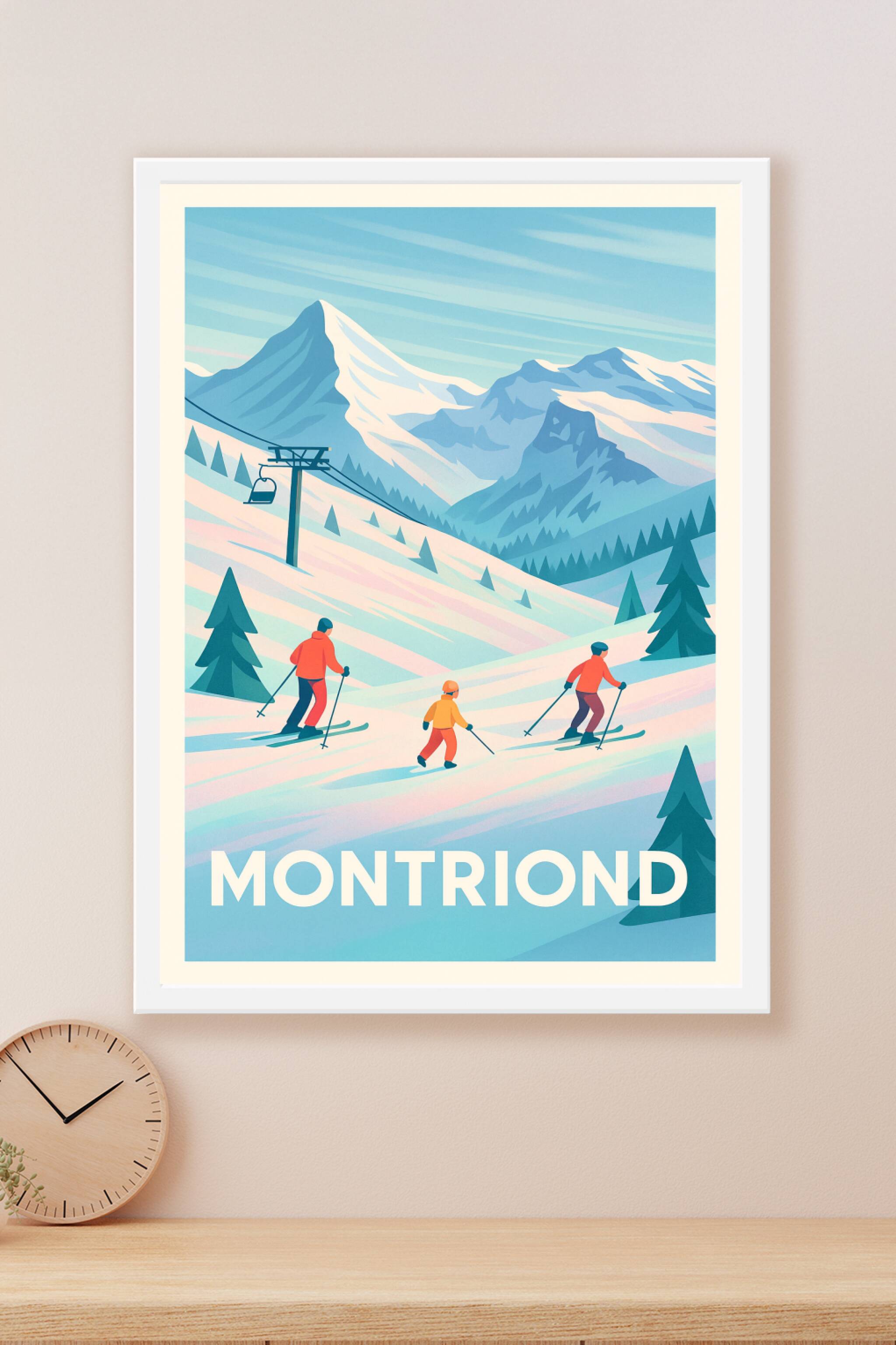 Découvrez la beauté paisible des montagnes enneigées de Montriond avec cette affiche au style vintage et coloré, mettant en scène une famille profi...