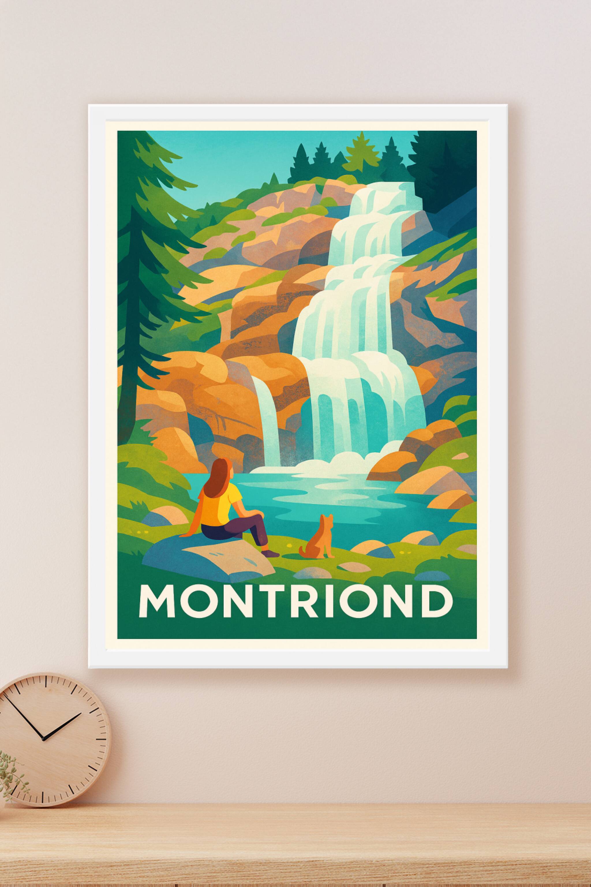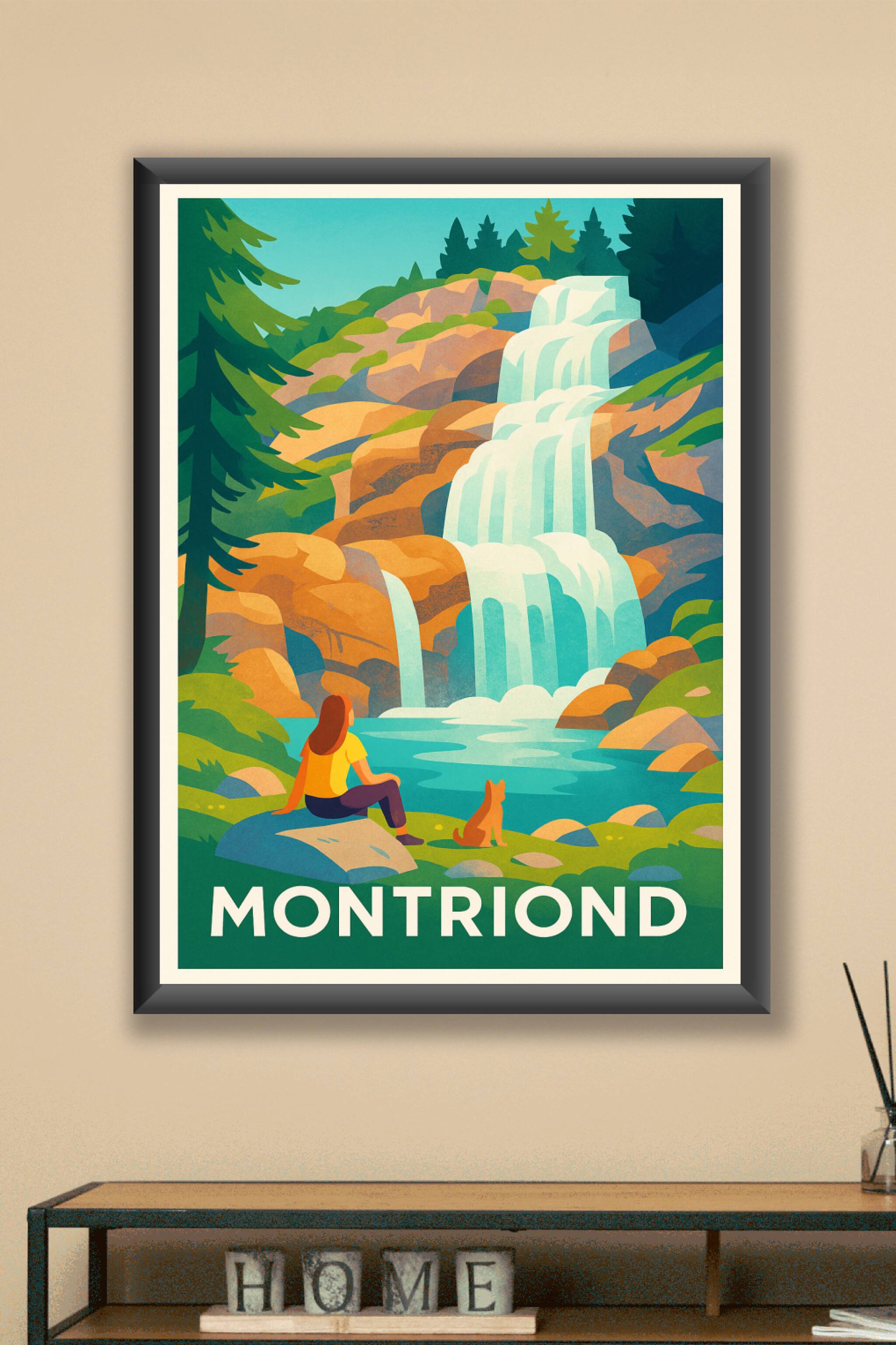 Découvrez la tranquillité et la beauté naturelle de Montriond avec cette affiche illustrée mettant en scène une cascade majestueuse entourée de roc...