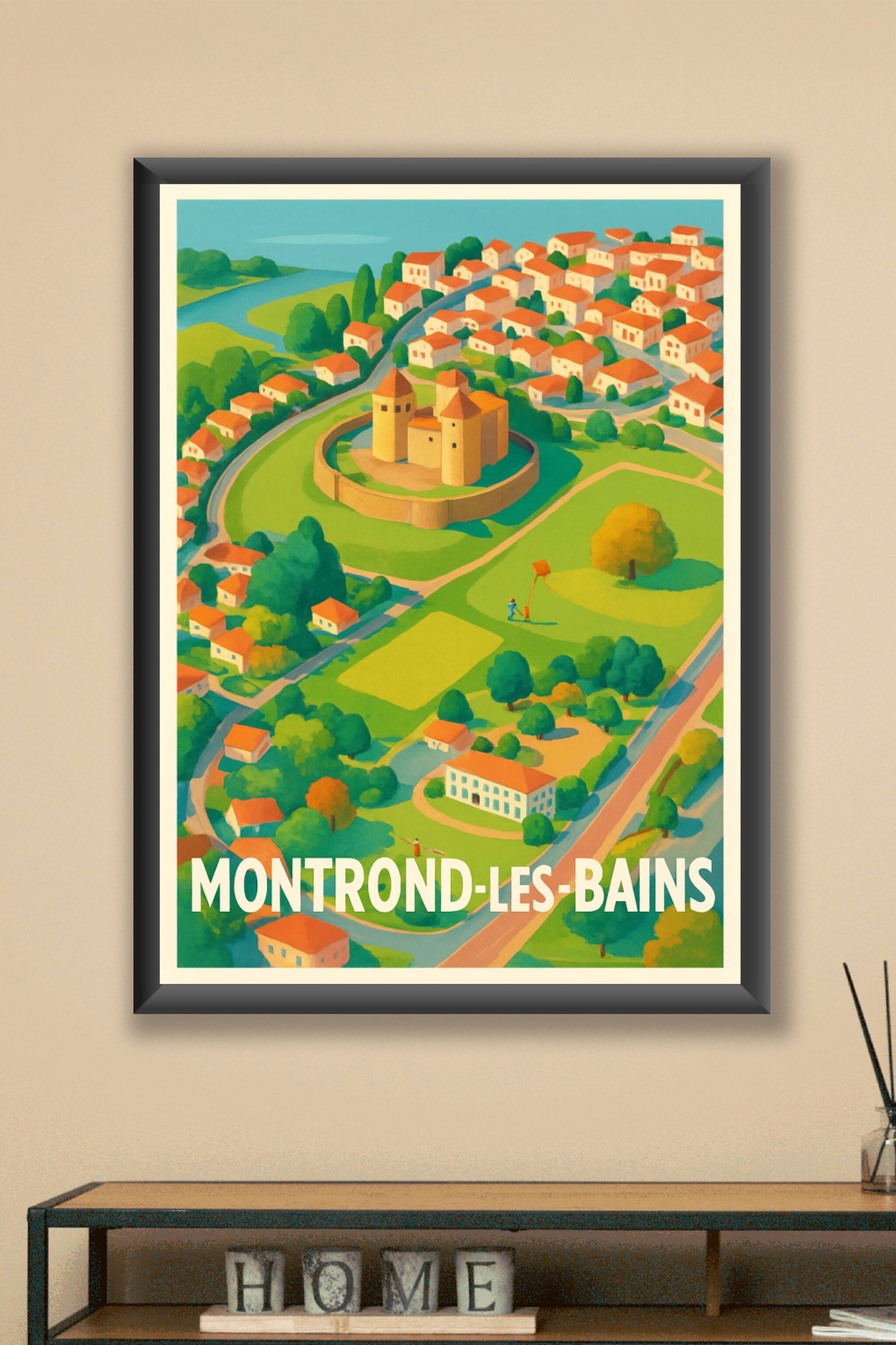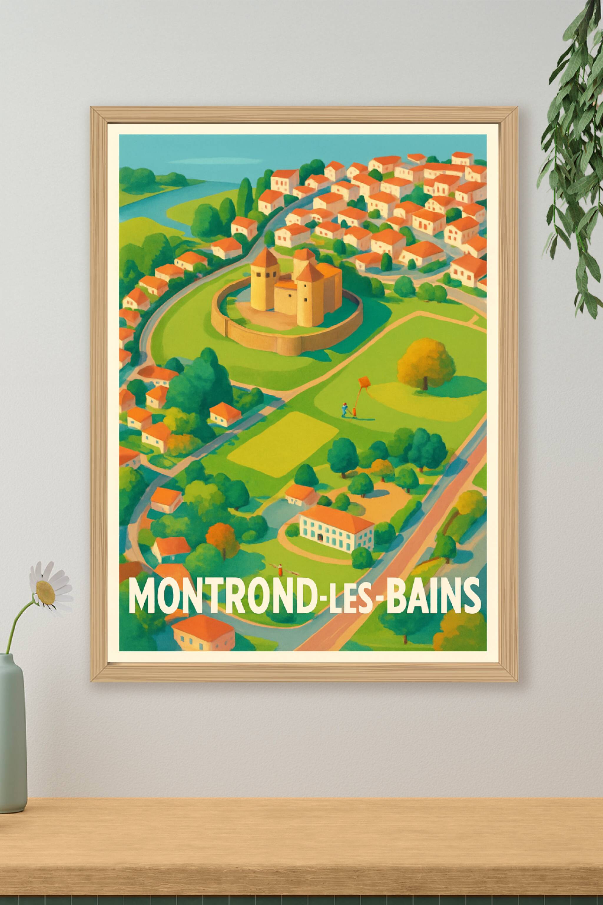 Redécouvrez Montrond-les-Bains à travers cette magnifique affiche illustrée, présentant en vue aérienne son célèbre château entouré de verdure et de charmantes maisons aux toits rouges. Ce poster s'impose comme un hommage visuel vibrant à cette ville pleine de caractère et d'histoire. Imprimée en tirage "Fine Art" sur papier coton 305g, cette affiche garantit une qualité d'impression exceptionnelle aux couleurs vives et durables. Disponible en formats A1 à A4, avec ou sans cadre, elle s'adapte parfaitement à toutes vos envies de décoration, que ce soit pour habiller un mur de salon, bureau ou chambre. Offrez-vous ce poster de Montrond-les-Bains pour apporter une touche d'authenticité et de douceur à votre intérieur ou pour faire un cadeau unique et élégant.