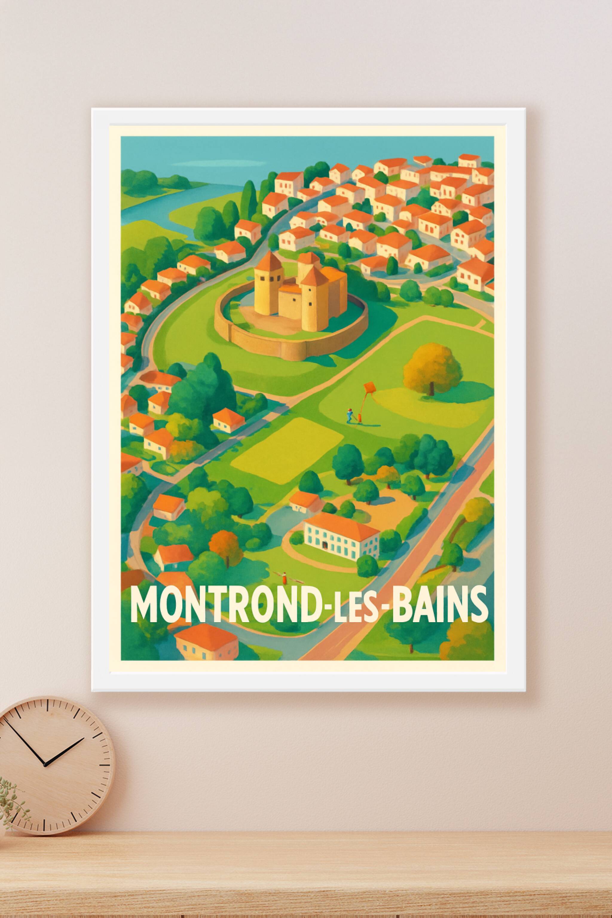 Redécouvrez Montrond-les-Bains à travers cette magnifique affiche illustrée, présentant en vue aérienne son célèbre château entouré de verdure et d...