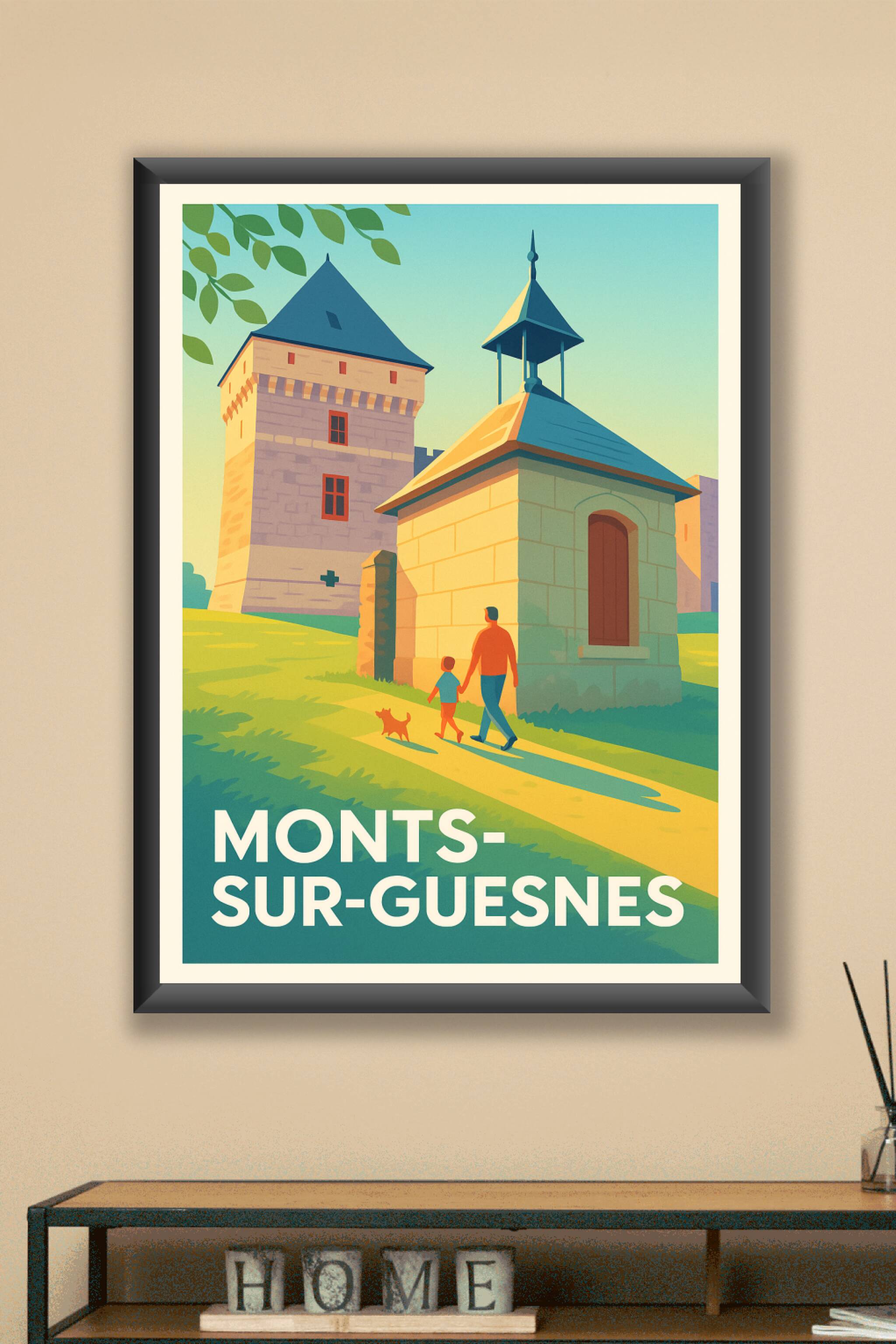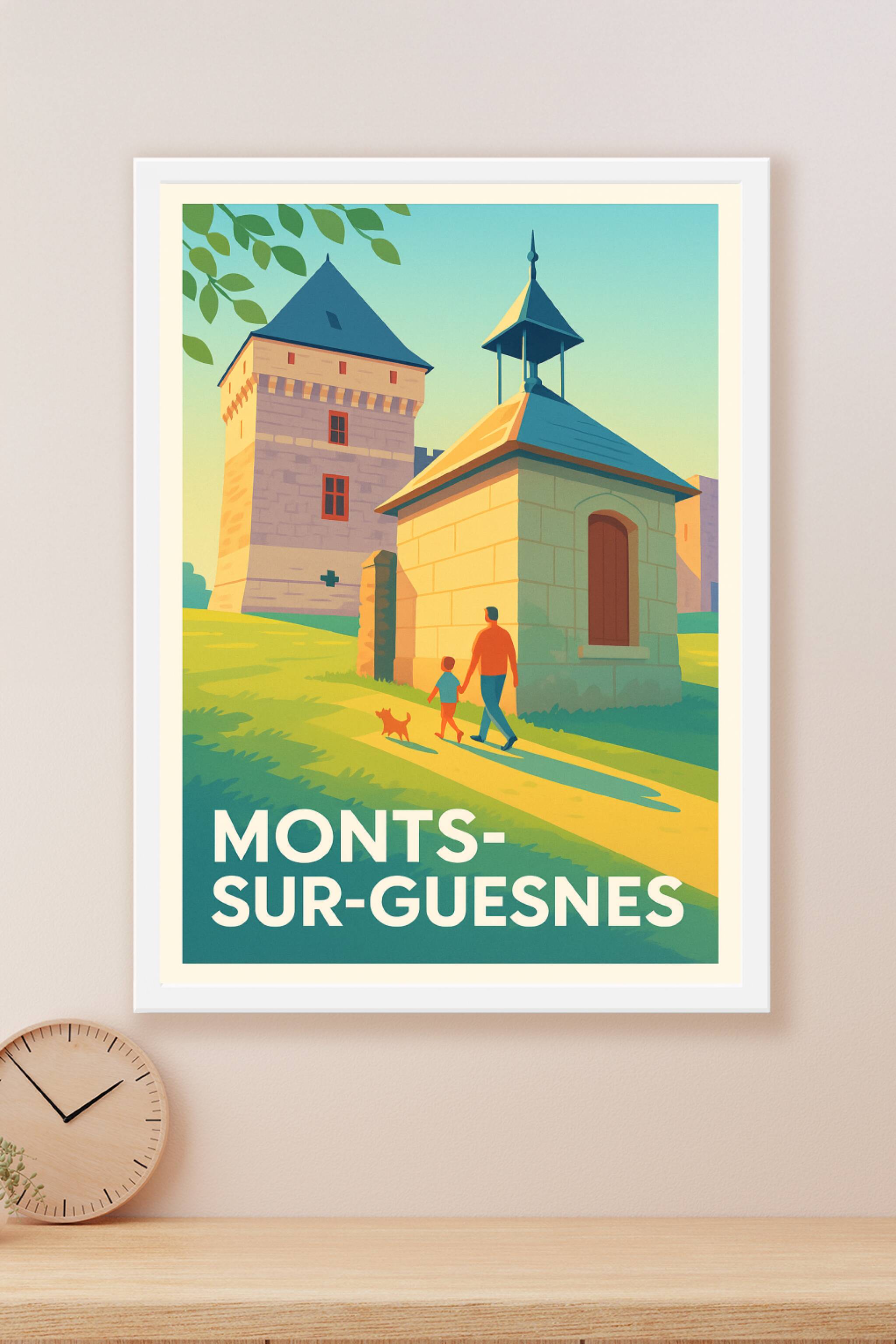 Découvrez l'élégance et la quiétude de Monts-sur-Guesnes à travers cette affiche artistique mettant en scène une promenade familiale dans un cadre ...