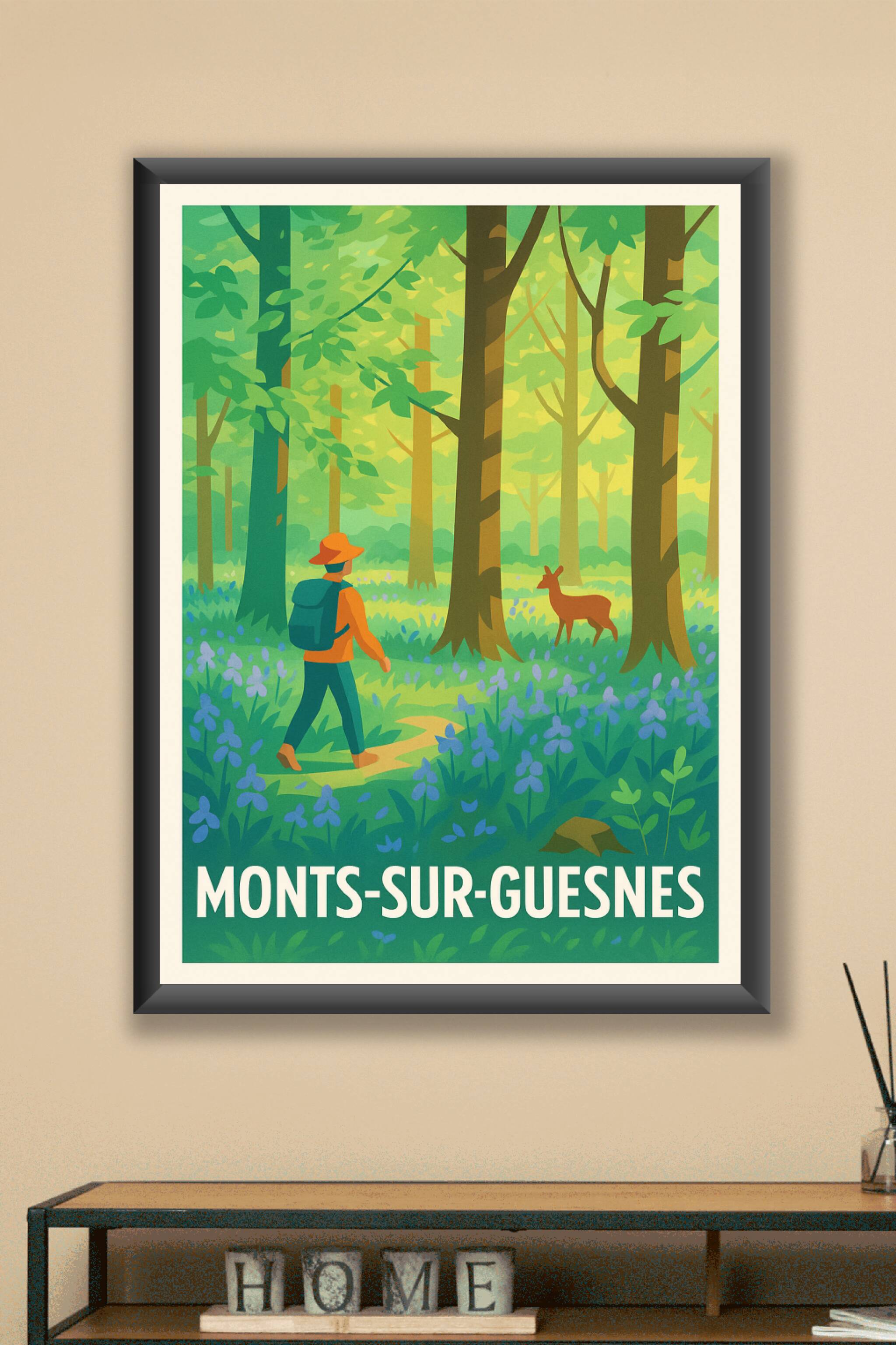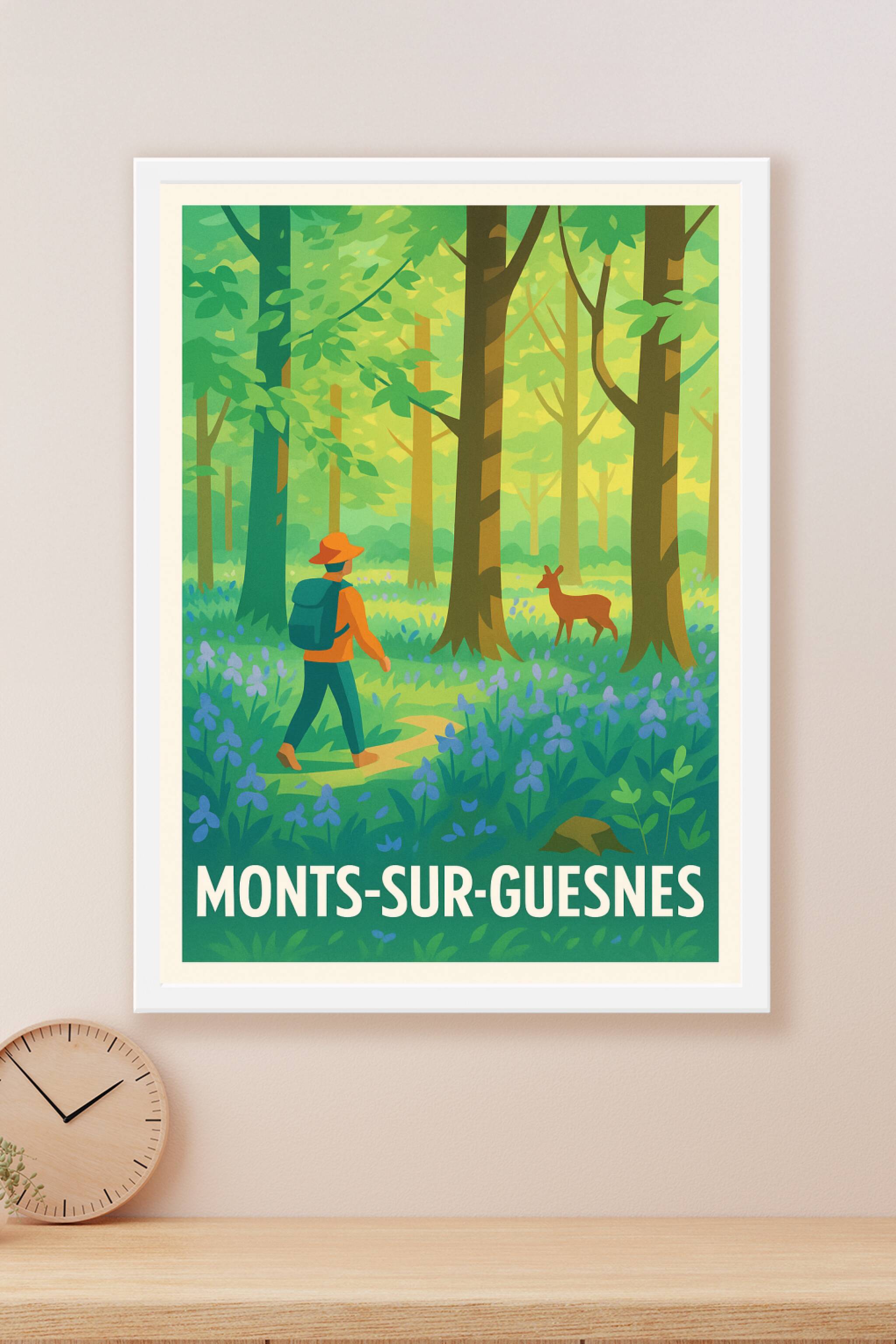 Découvrez la beauté paisible de Monts-sur-Guesnes avec cette affiche illustrée mettant en scène une forêt verdoyante baignée de lumière, un randonn...