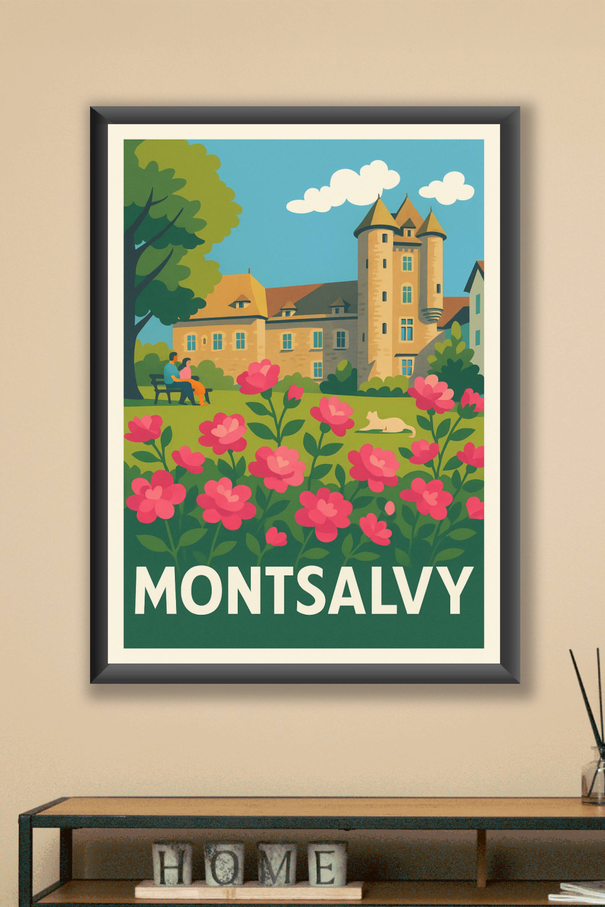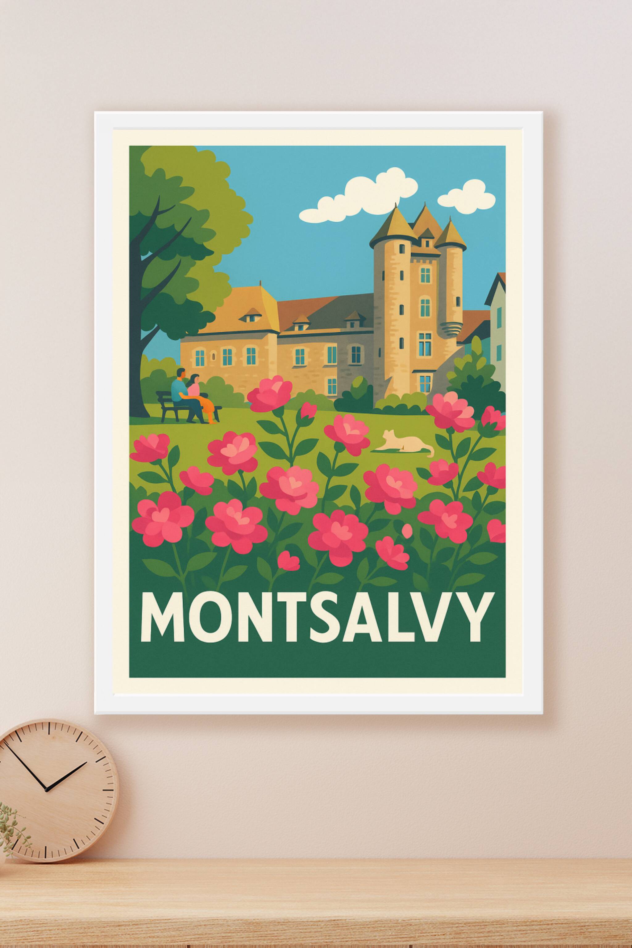 Découvrez l'élégance paisible de Montsalvy à travers cette affiche illustrée mettant en scène son architecture emblématique et ses jardins fleuris....
