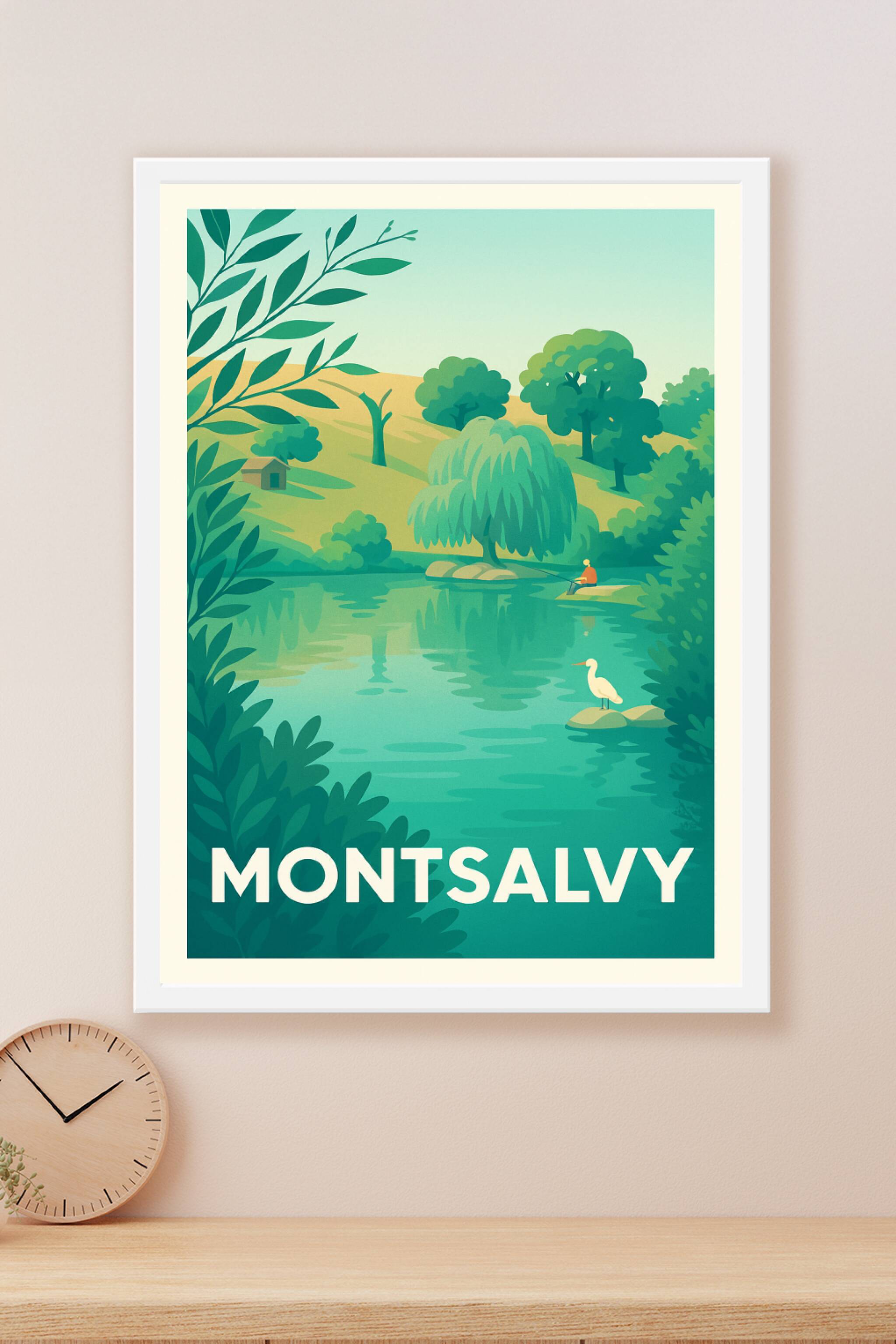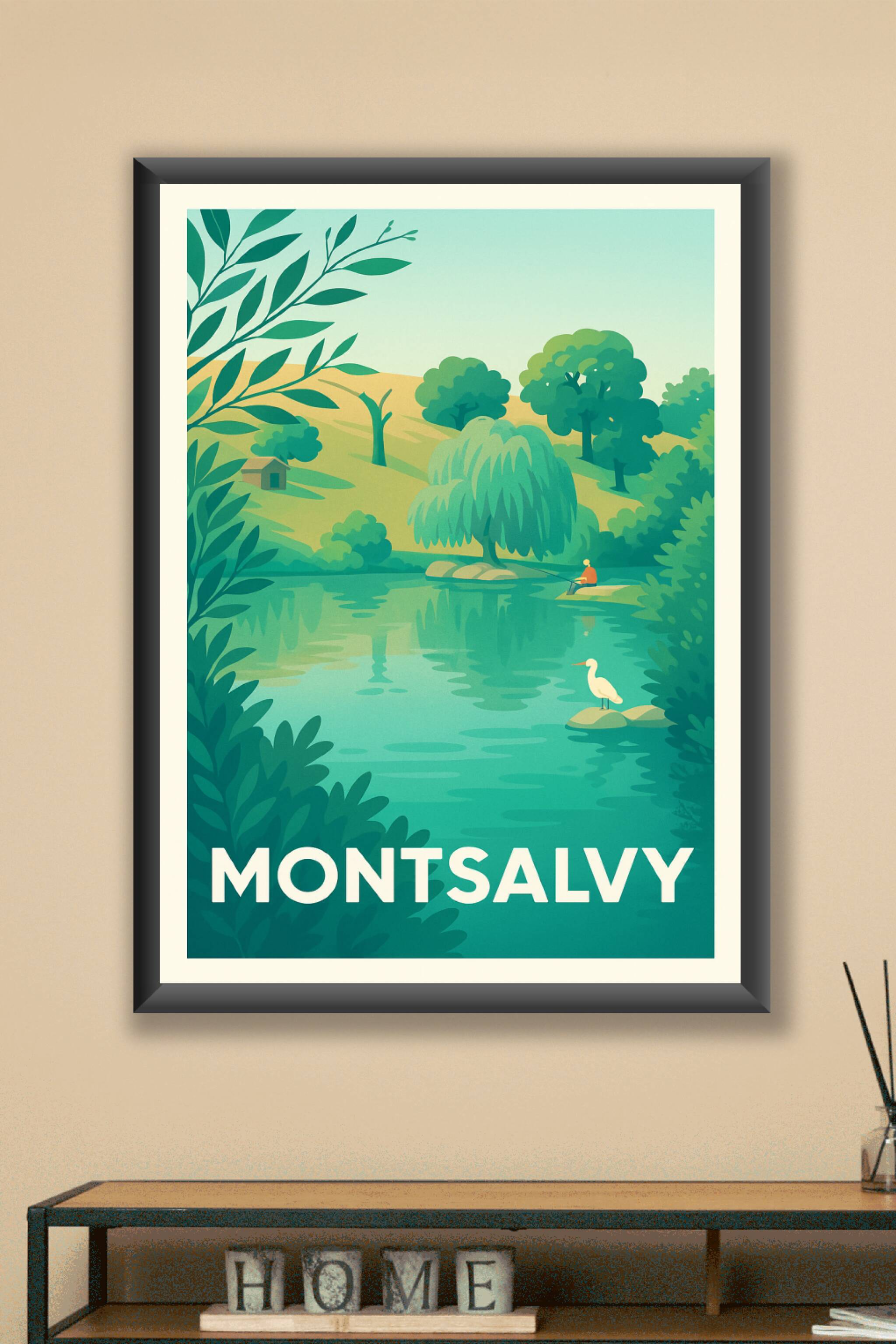 Découvrez la quiétude de Montsalvy à travers cette affiche vintage illustrant un paysage naturel paisible, où un pêcheur profite du calme au bord d...