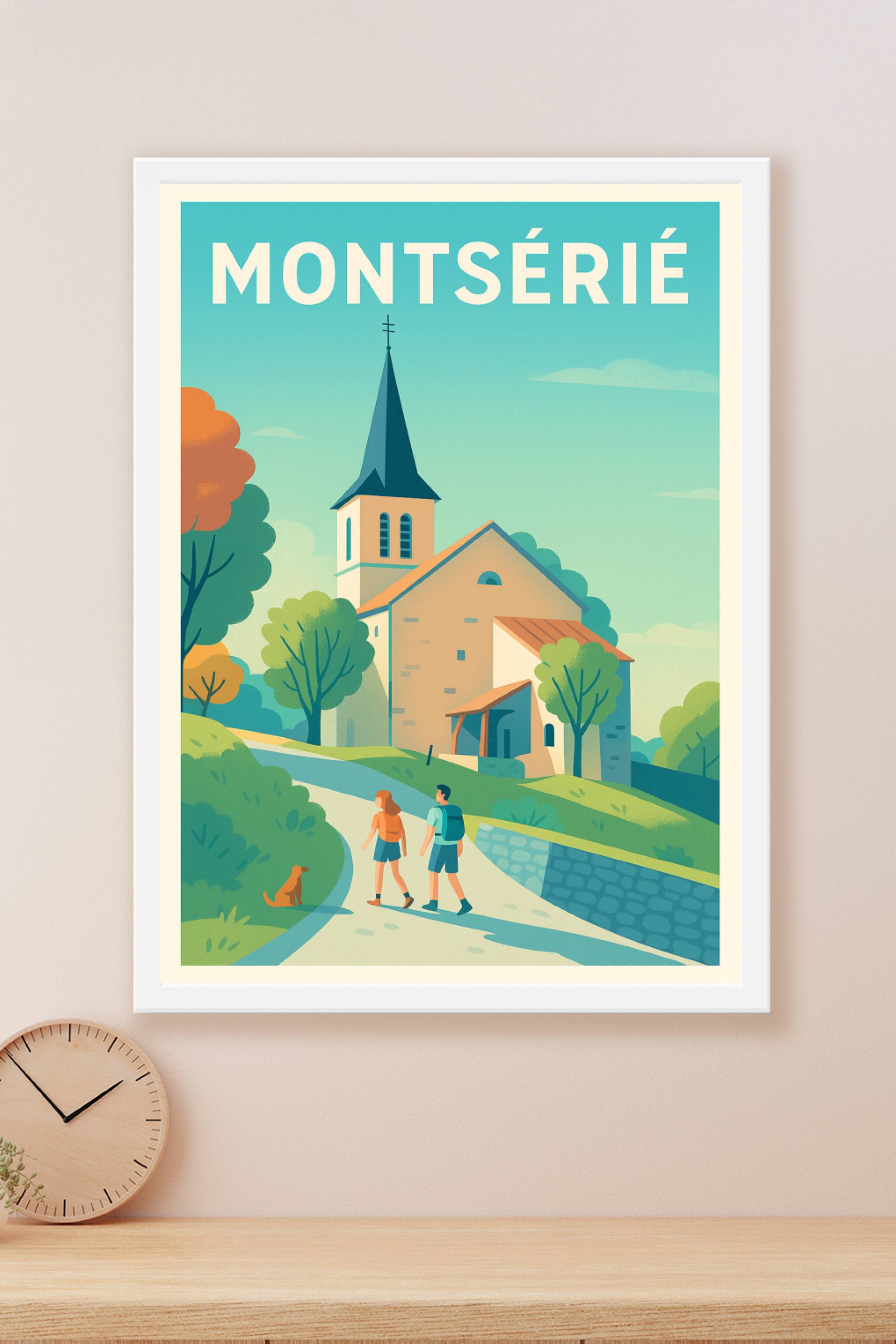 Découvrez le charme paisible de Montsérié avec cette affiche illustrée au style rétro et coloré, mettant en scène une balade tranquille devant une ...