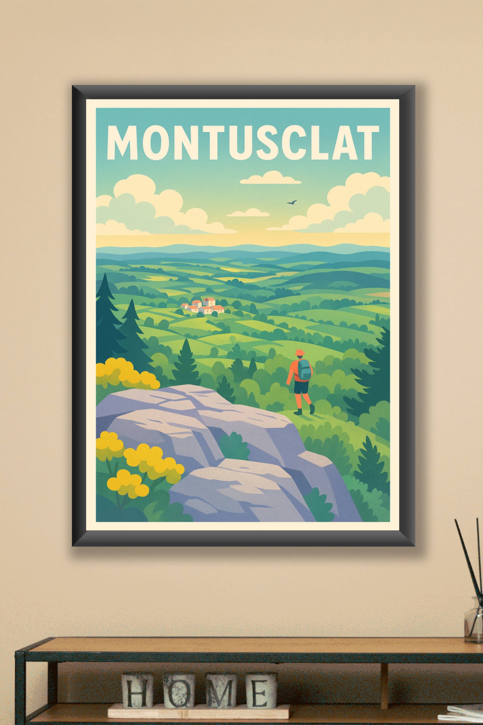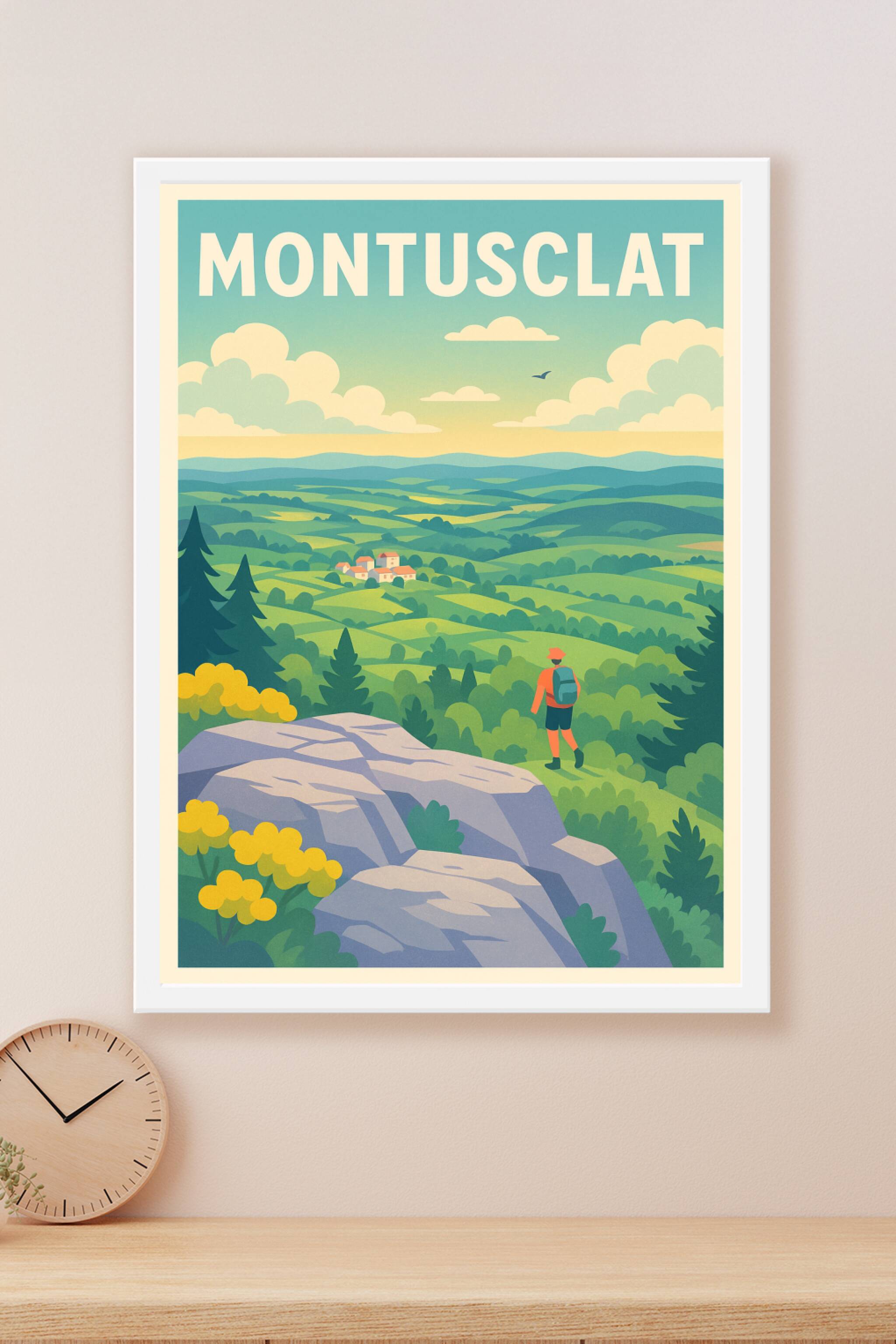 Découvrez la beauté naturelle et paisible de Montusclat avec cette affiche illustrée mettant en scène un randonneur admirant un paysage vallonné et...