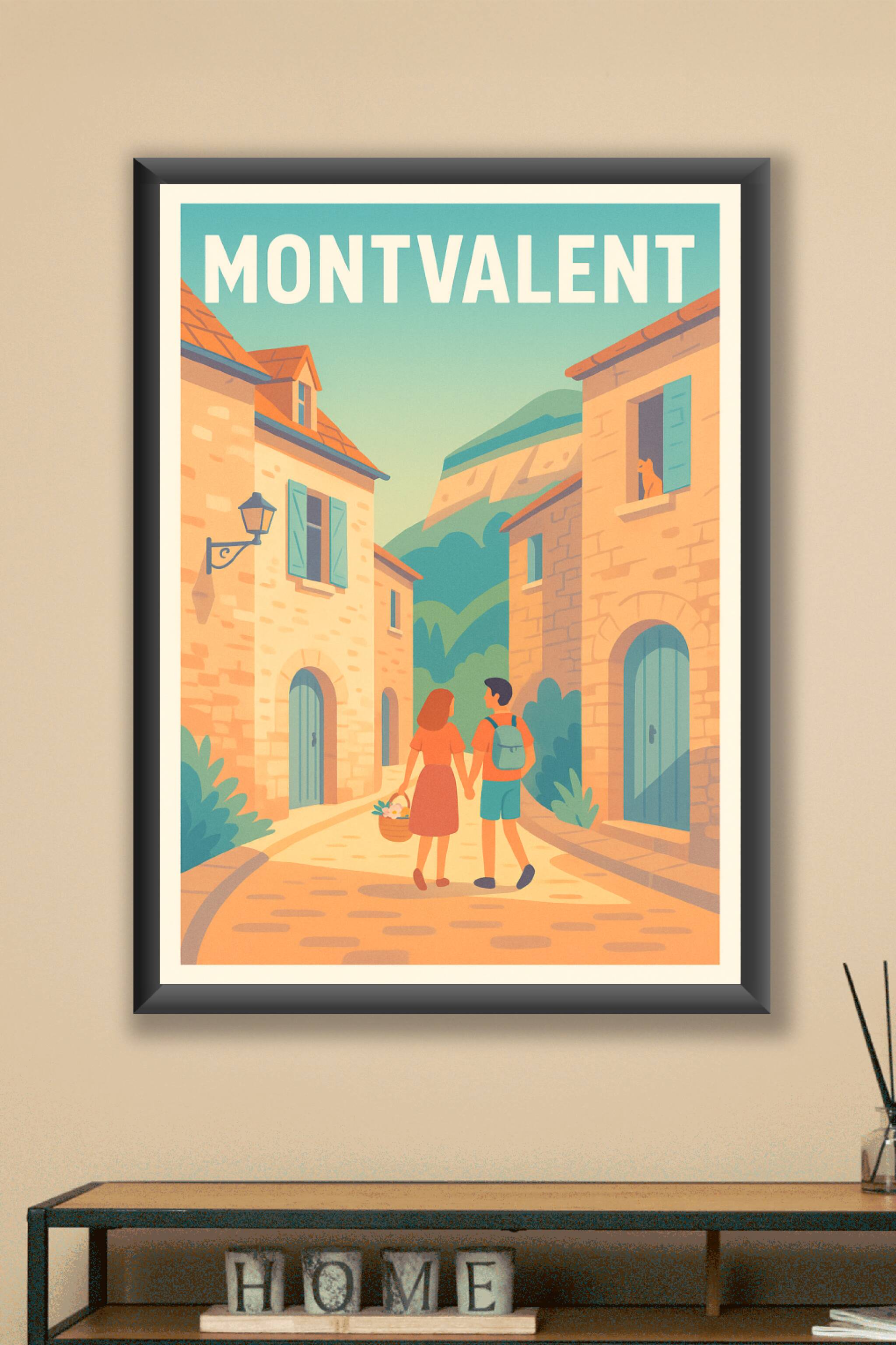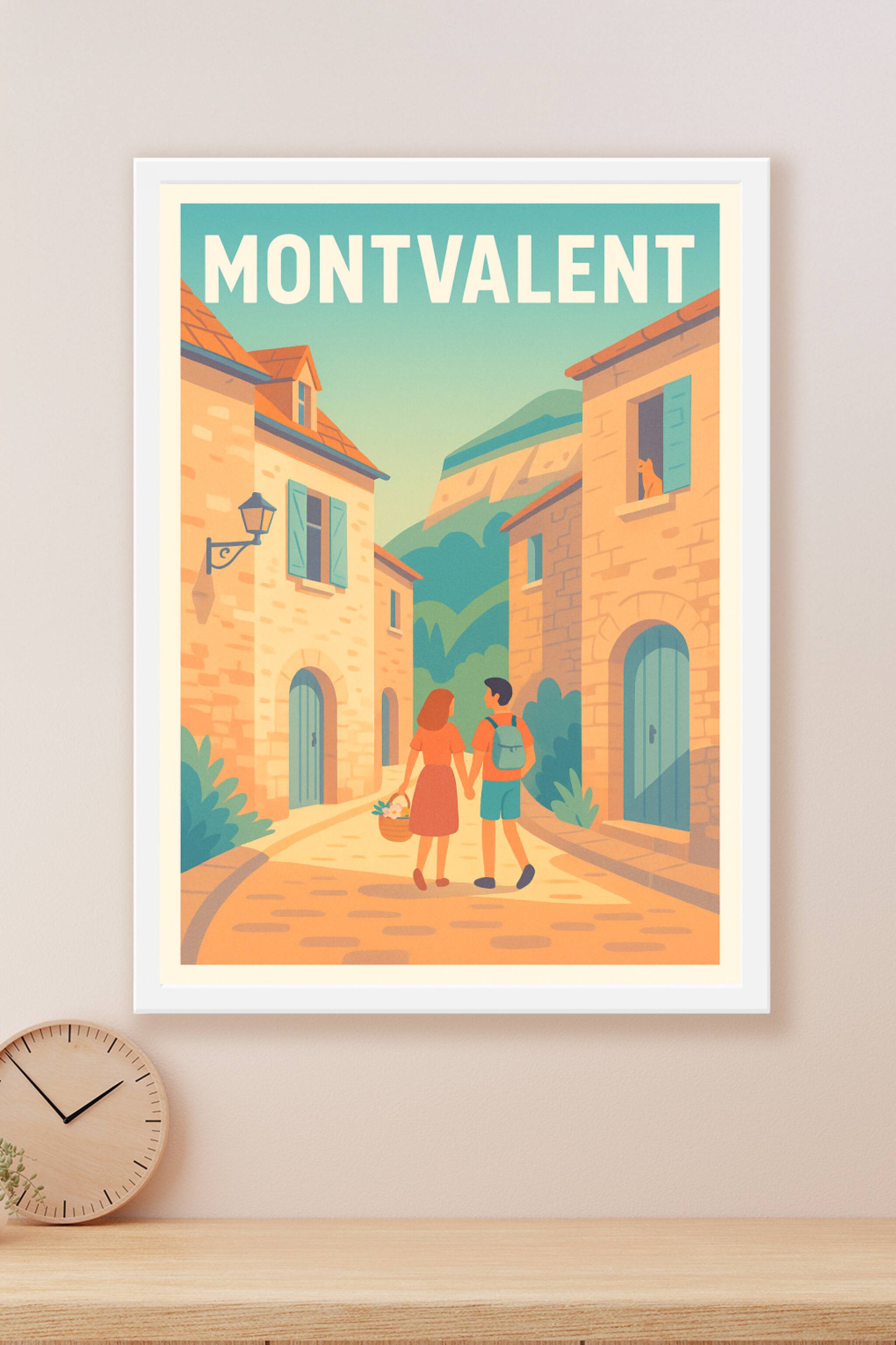 Découvrez le charme intemporel de Montvalent avec cette affiche illustrée inspirante où deux promeneurs main dans la main s’imprègnent de l’atmosph...