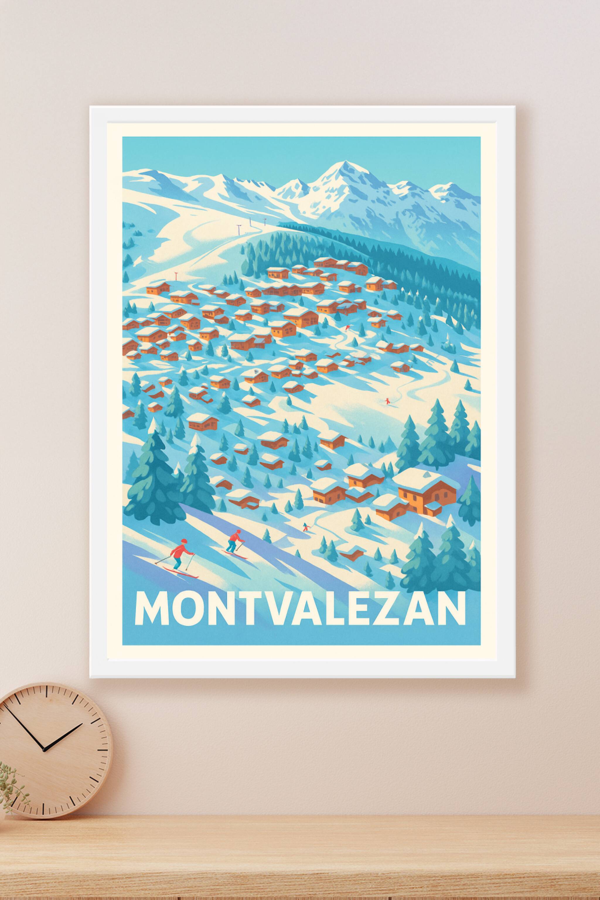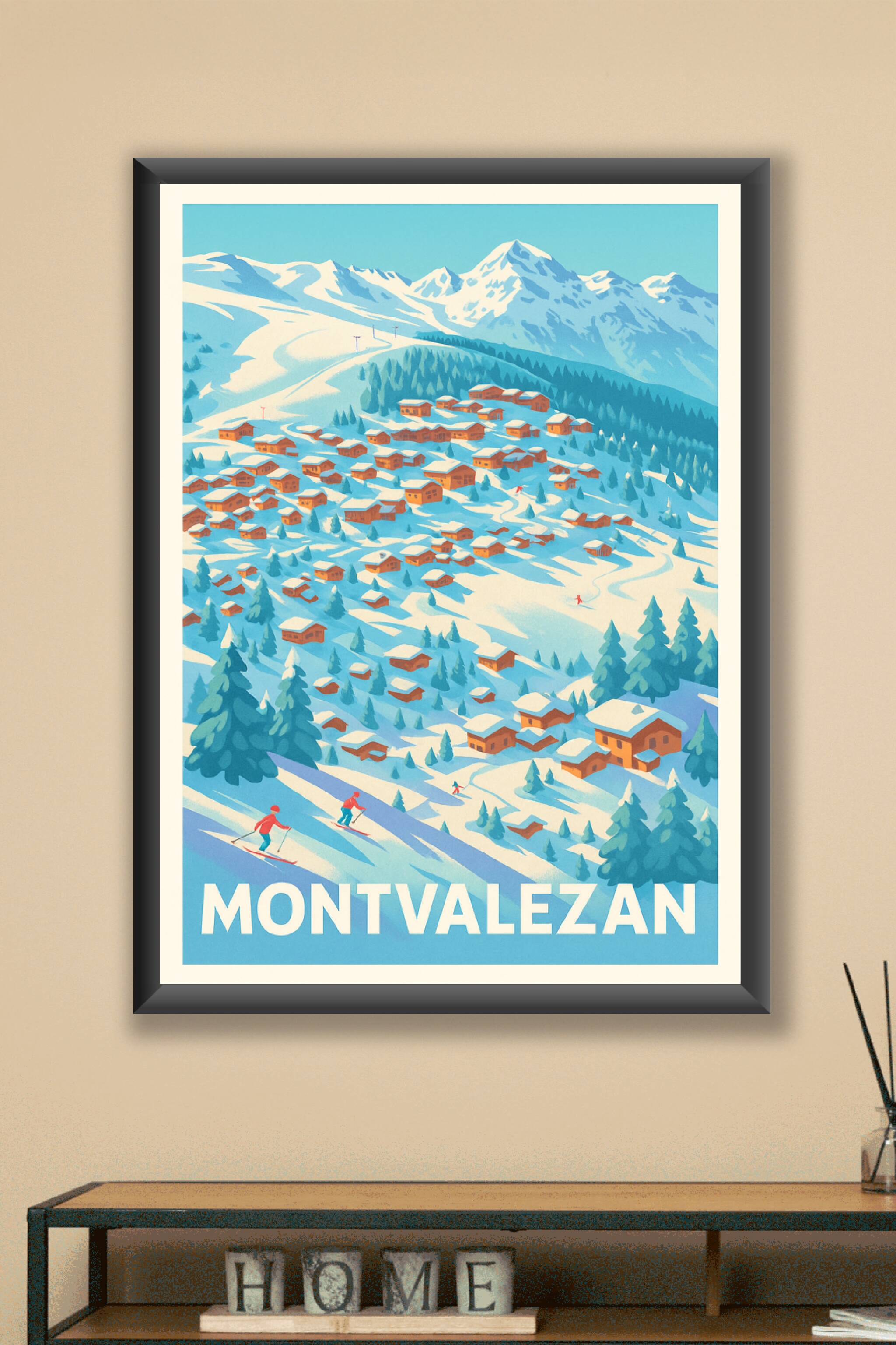 Découvrez la beauté hivernale de Montvalezan avec cette affiche illustrée dans un style vintage captivant. Cette scène de chalets enneigés et de sk...