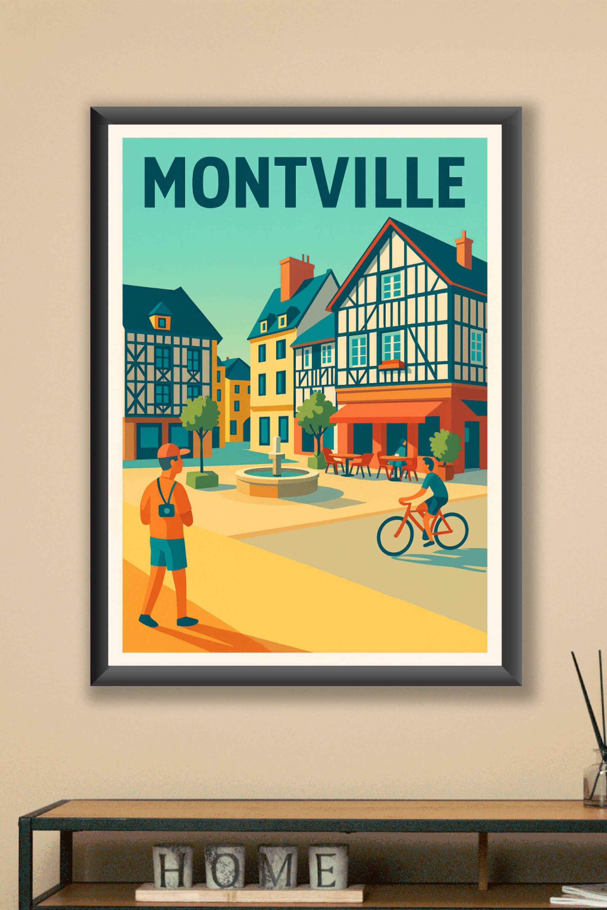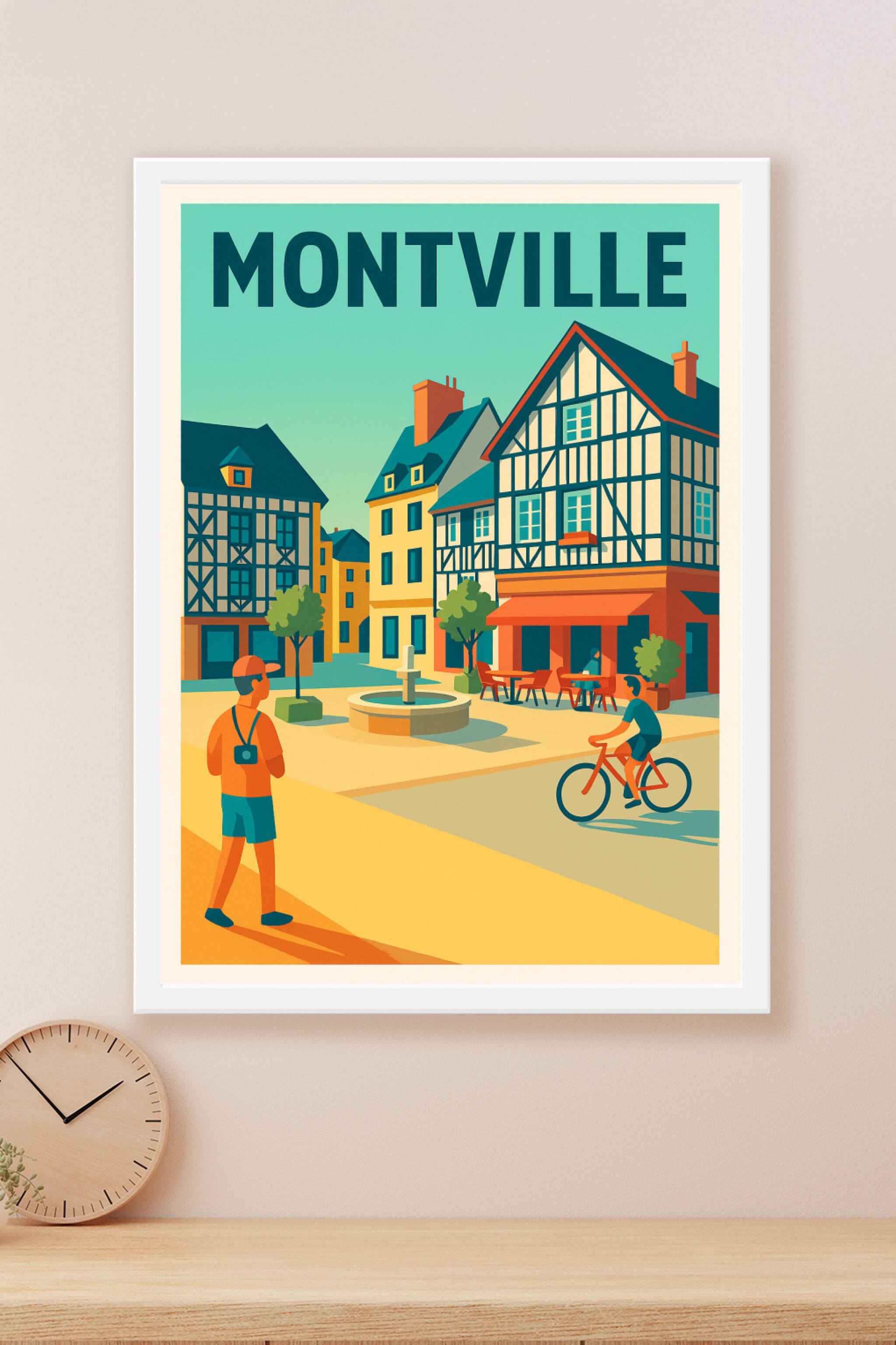 Découvrez le charme pittoresque de Montville à travers cette affiche illustrée au style vintage et coloré. Ce poster met en scène les maisons à colombages typiques, une place conviviale avec sa fontaine, ainsi que des personnages profitant d'une promenade ou d'une pause en terrasse.Ce poster est imprimé en tirage "Fine Art" sur un papier 305g coton garantissant une qualité d'impression exceptionnelle et une tenue durable. Disponible en formats A1 à A4, avec ou sans cadre, cette affiche apportera une touche chaleureuse et authentique à votre décoration intérieure.Laissez-vous séduire par ce tirage premium 100% fabriqué en France, parfait pour offrir un souvenir élégant ou sublimer votre intérieur avec l'atmosphère unique de Montville.