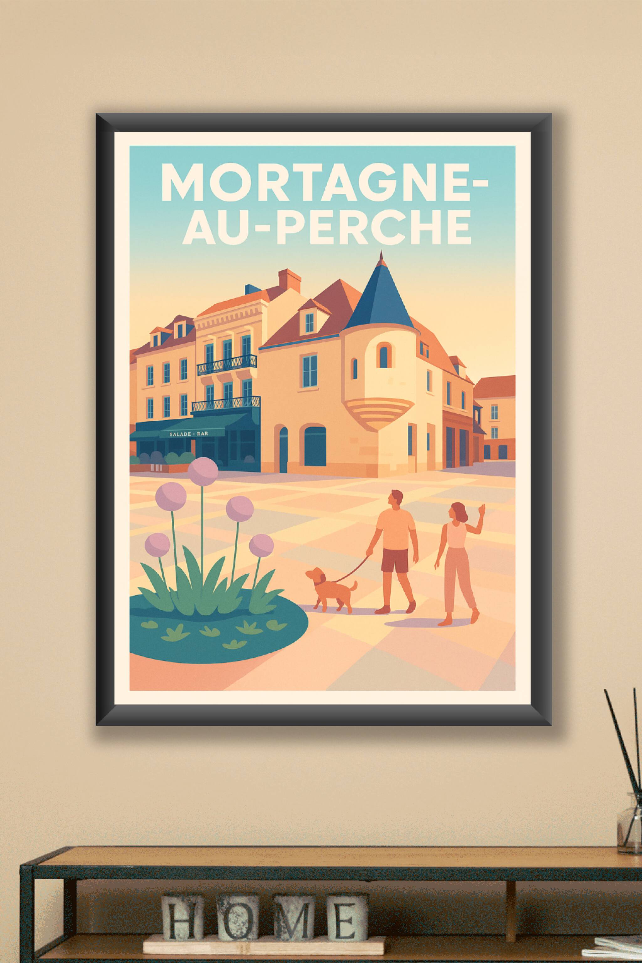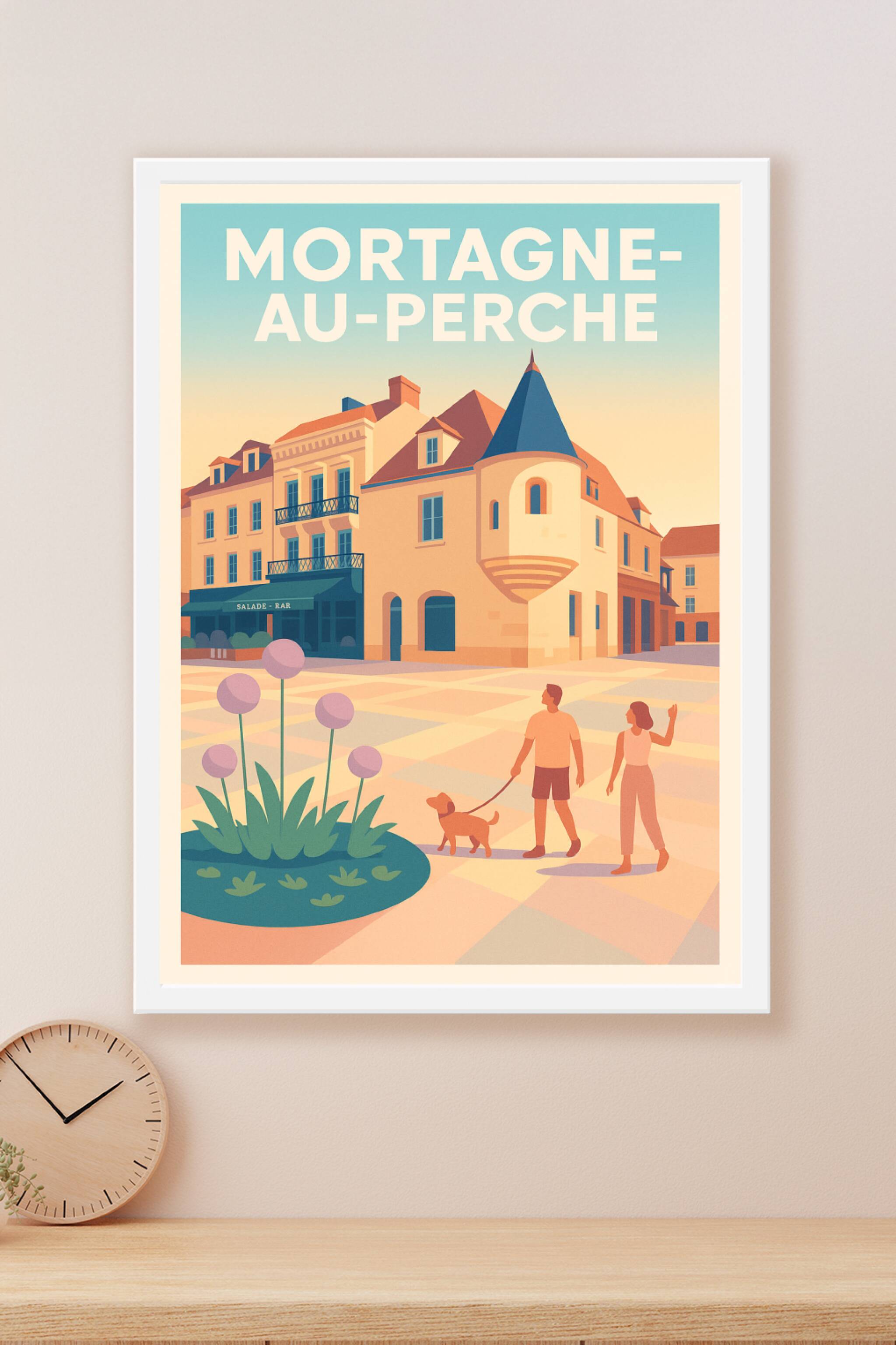 Offrez-vous une immersion dans l'atmosphère paisible et élégante de Mortagne-au-Perche avec cette affiche illustrée au graphisme doux et chaleureux...