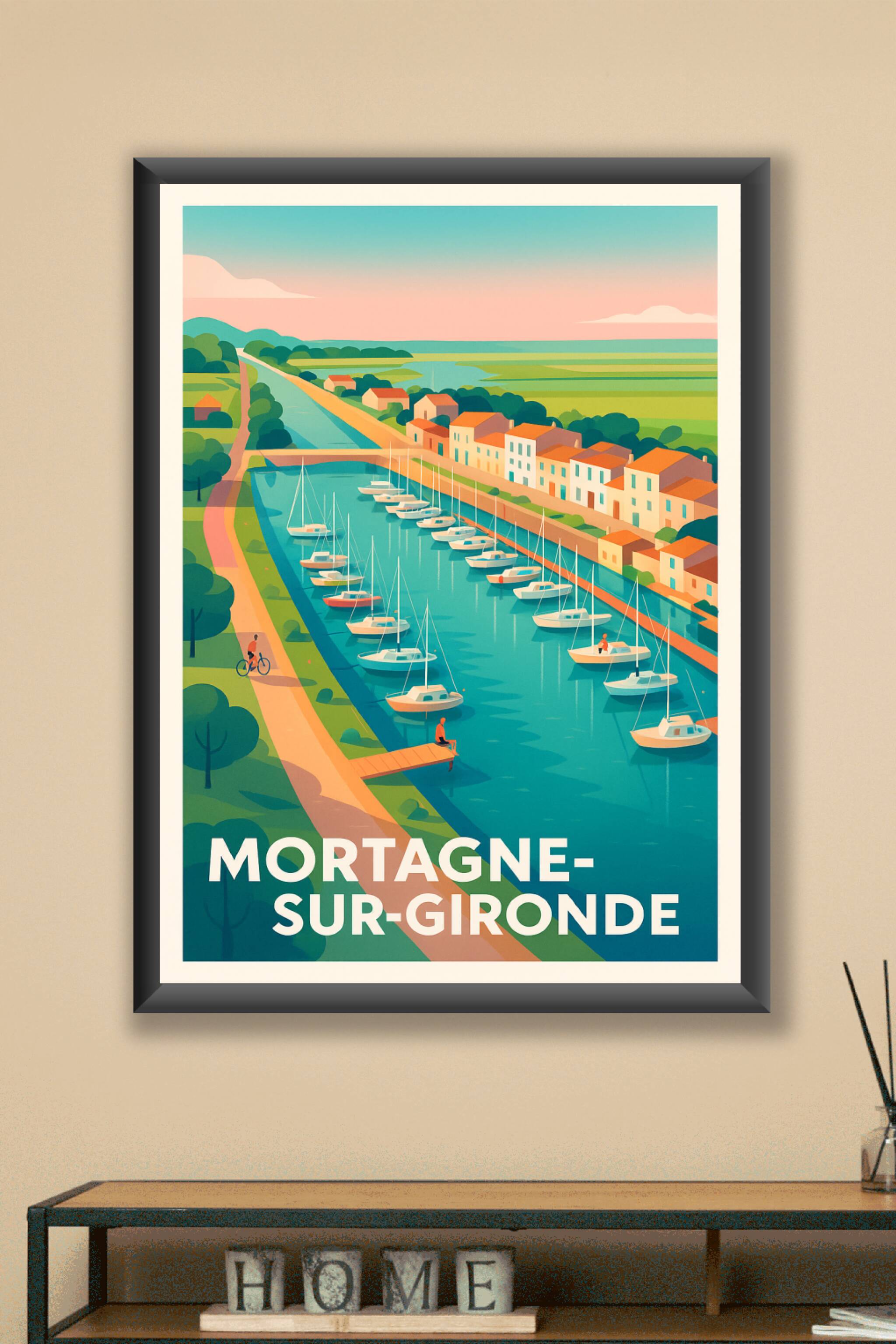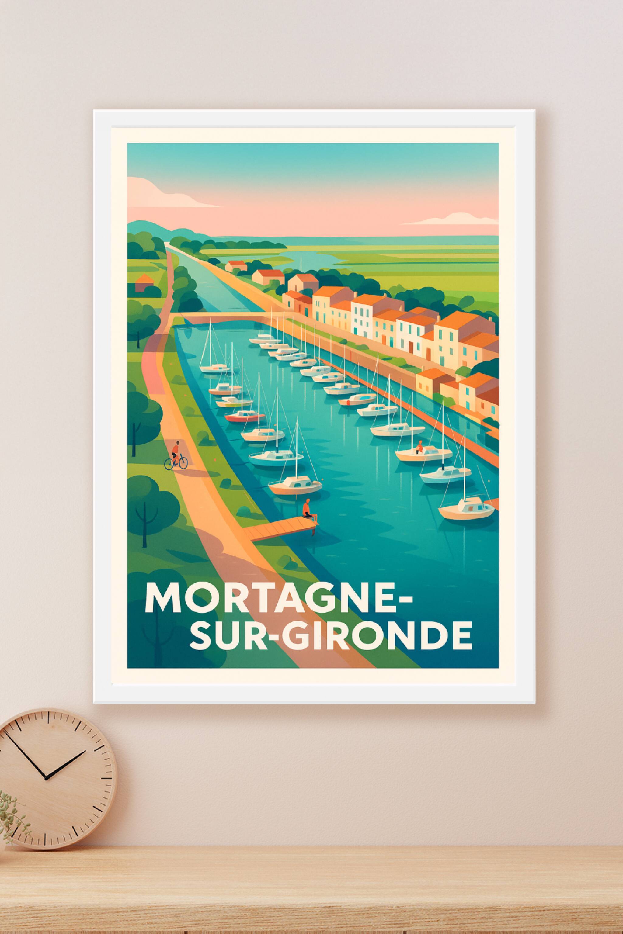 Découvrez l'élégance paisible de Mortagne-sur-Gironde à travers cette affiche vintage stylisée qui met en avant son charmant port et ses maisons ty...