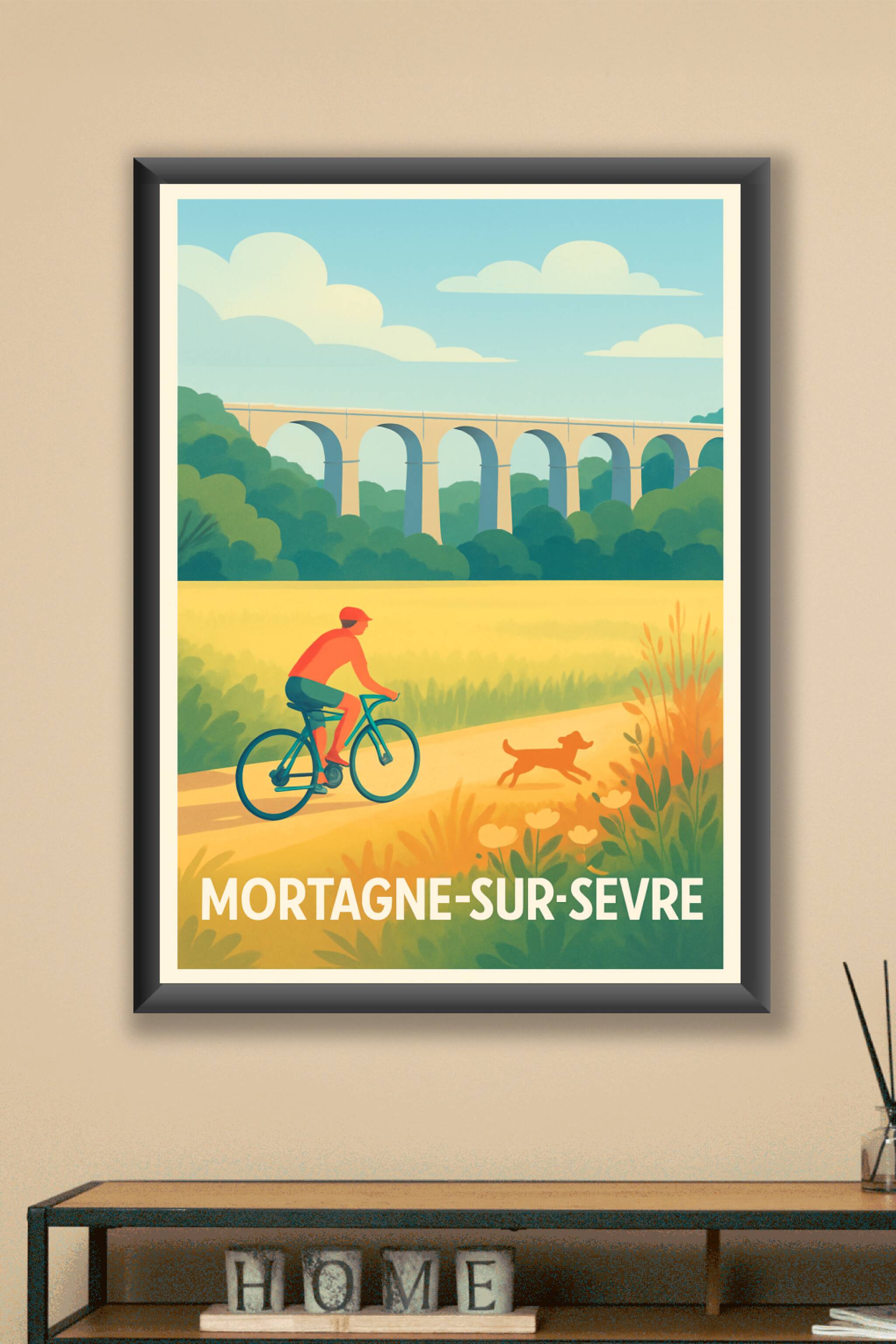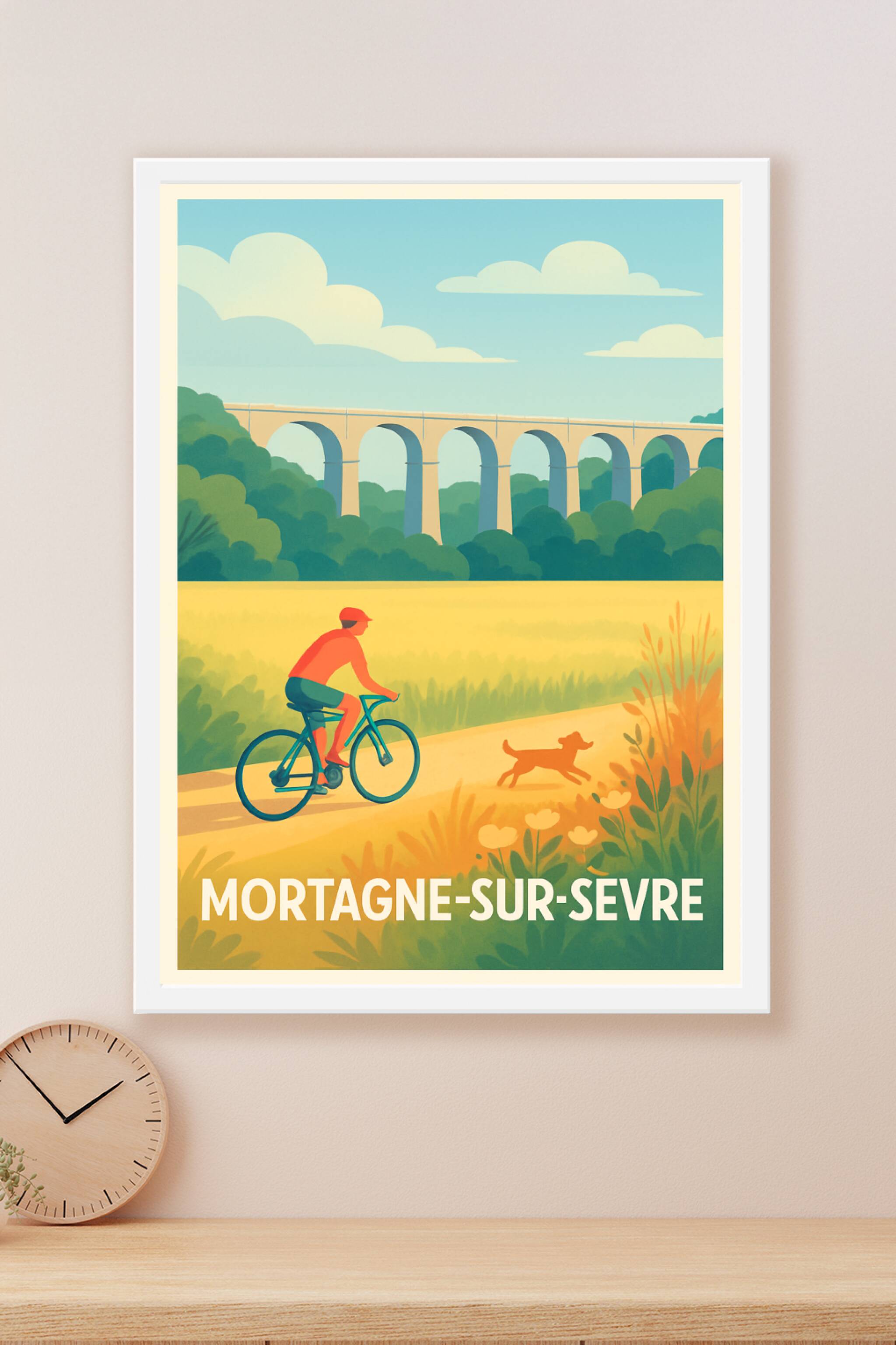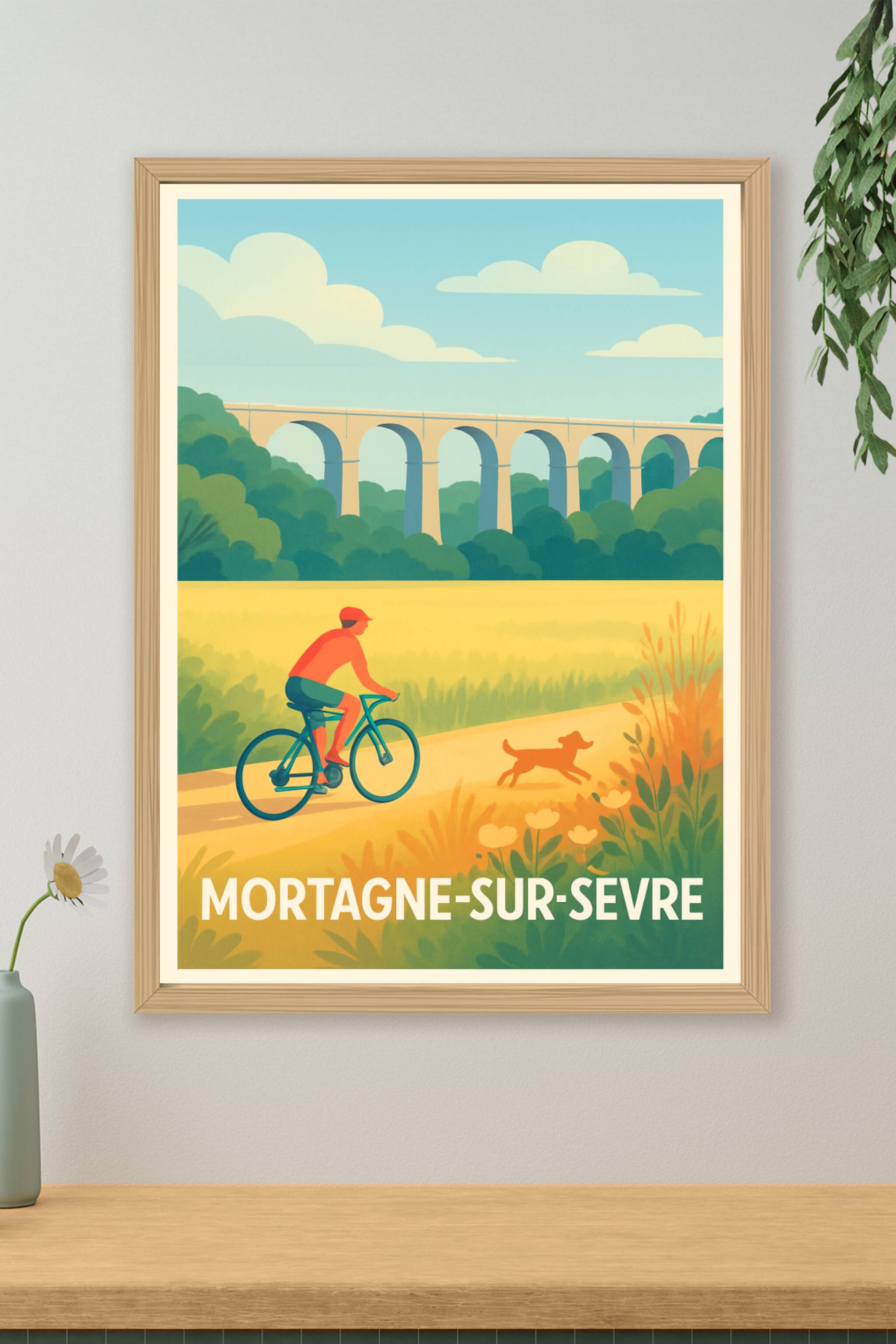 Découvrez la douceur de vivre en Vendée avec cette affiche illustrée représentant une balade à vélo au cœur de Mortagne-sur-Sèvre, sublimée par le ...