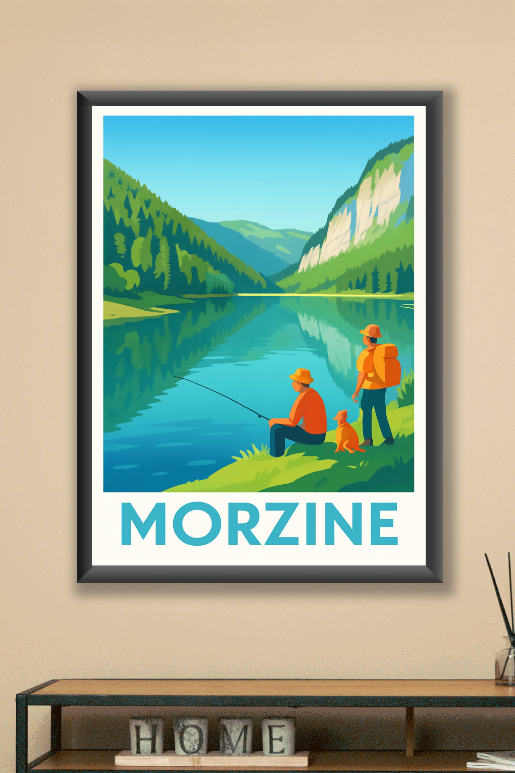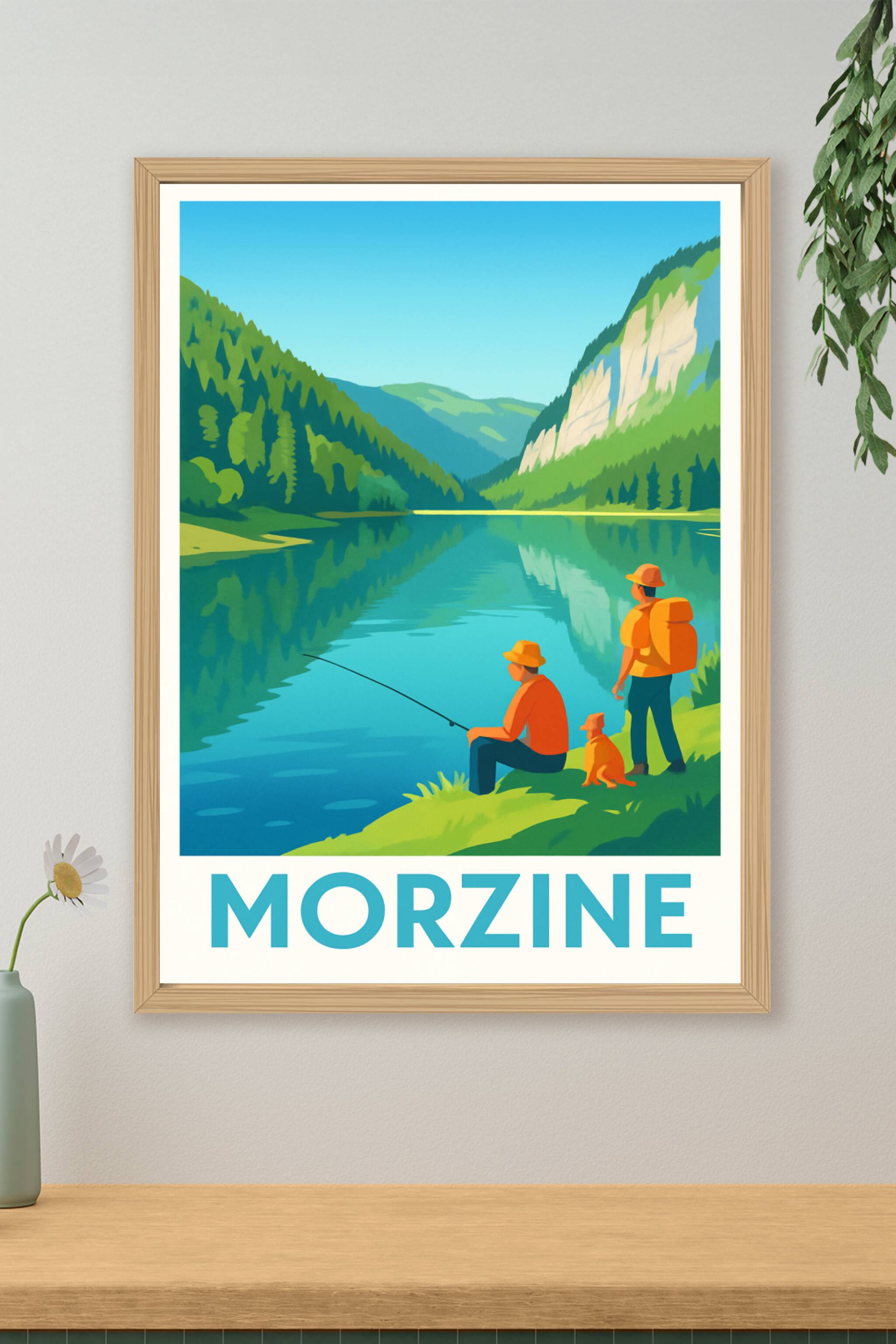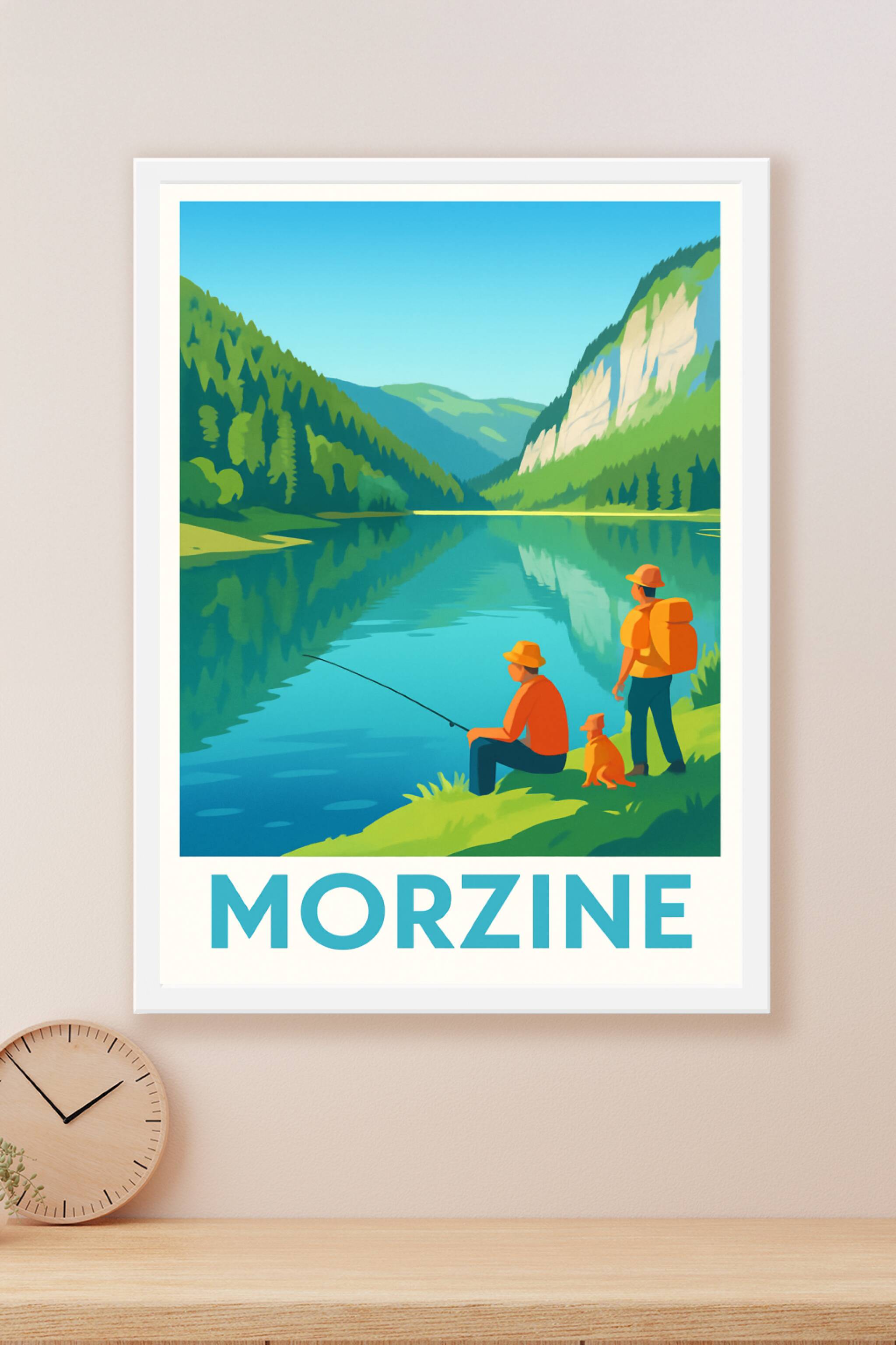 Découvrez la sérénité des paysages alpins avec cette affiche illustrée de Morzine, où deux pêcheurs et leur chien profitent d’un instant paisible a...