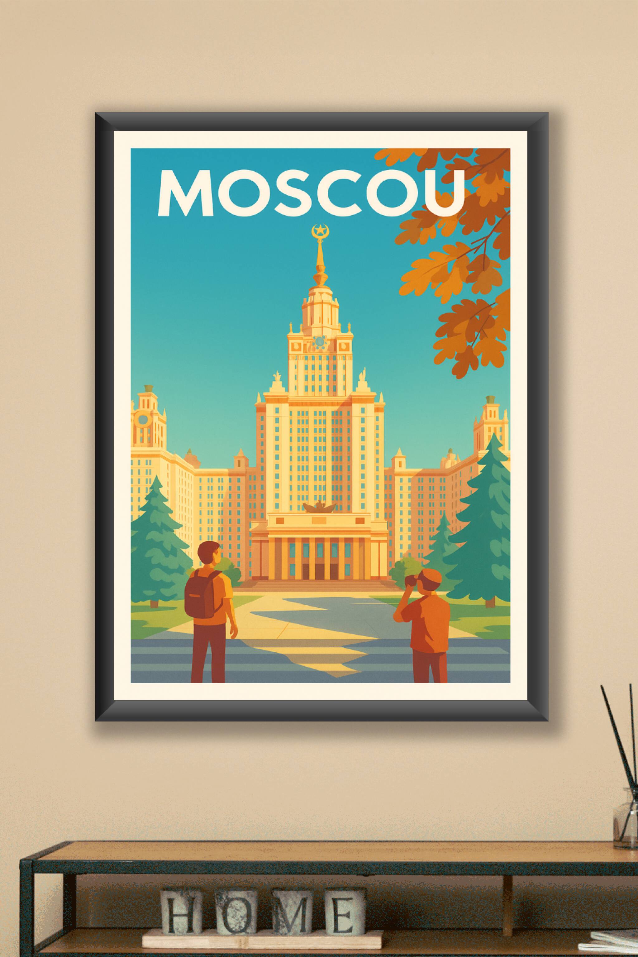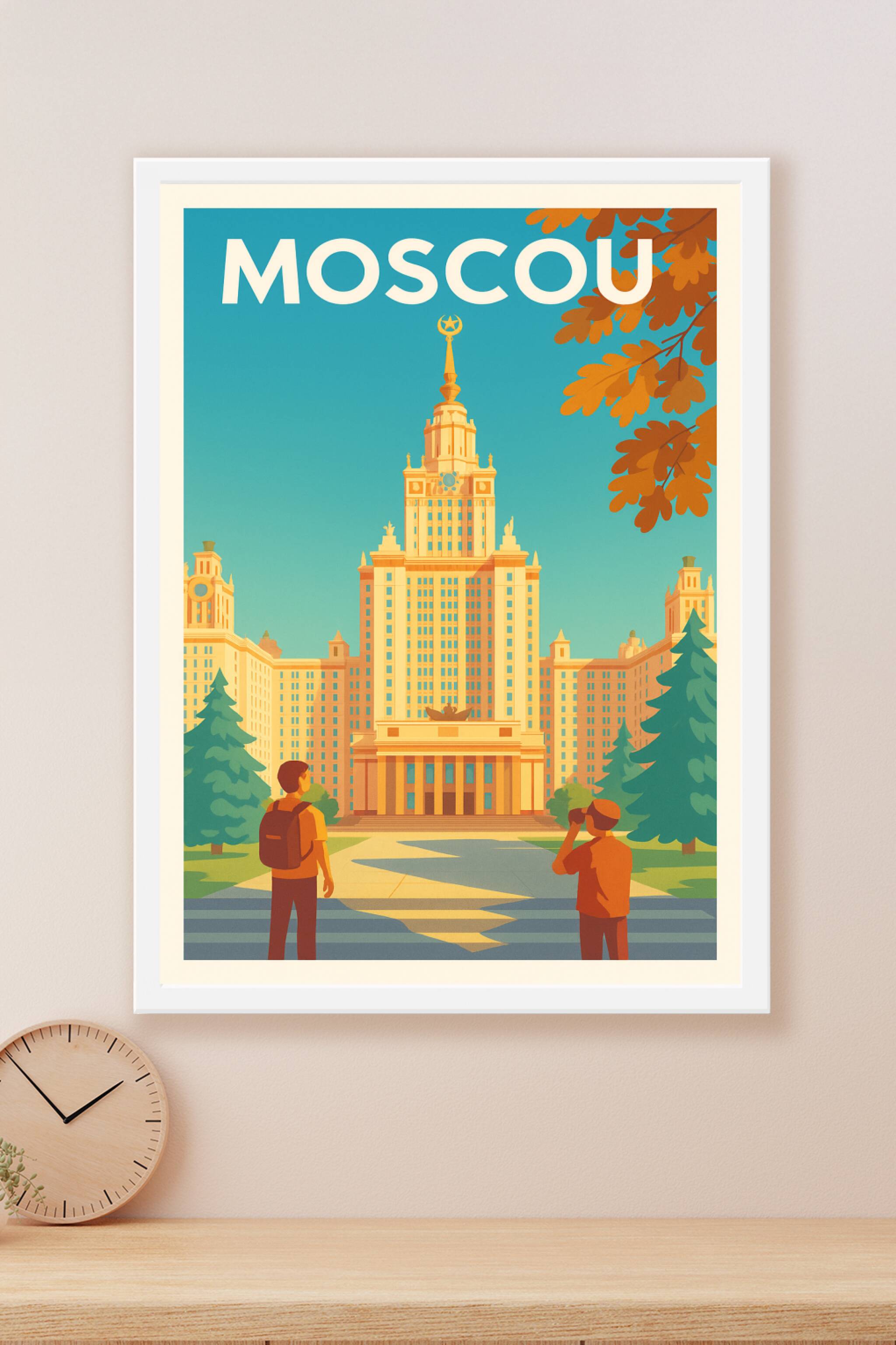 Découvrez la majesté de Moscou avec cette affiche illustrée mettant en avant l'architecture imposante typique de la Russie soviétique, baignée dans...
