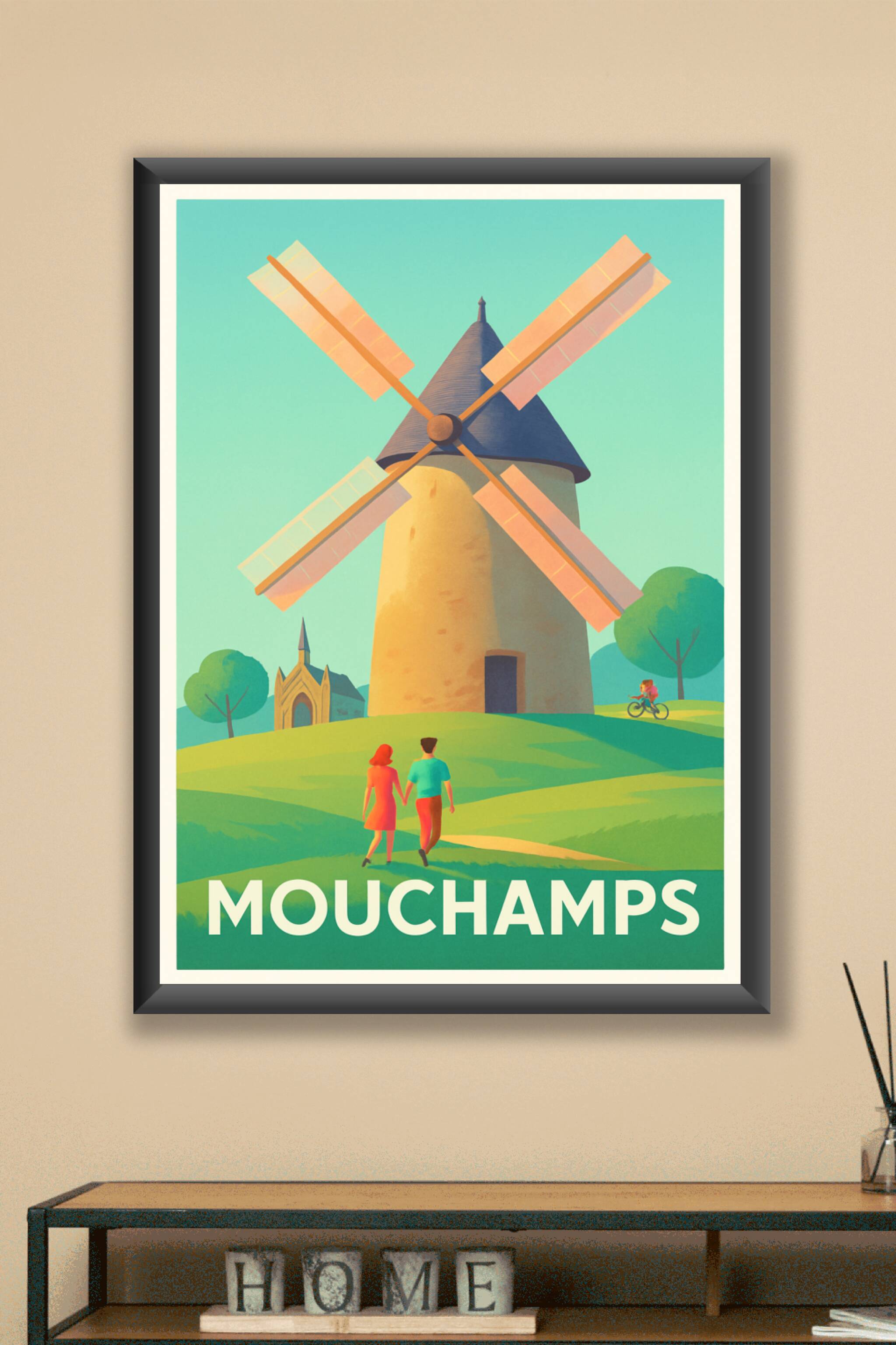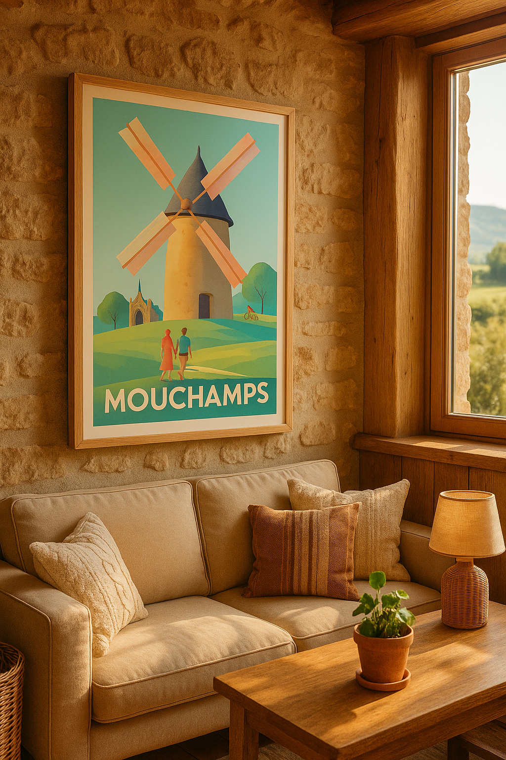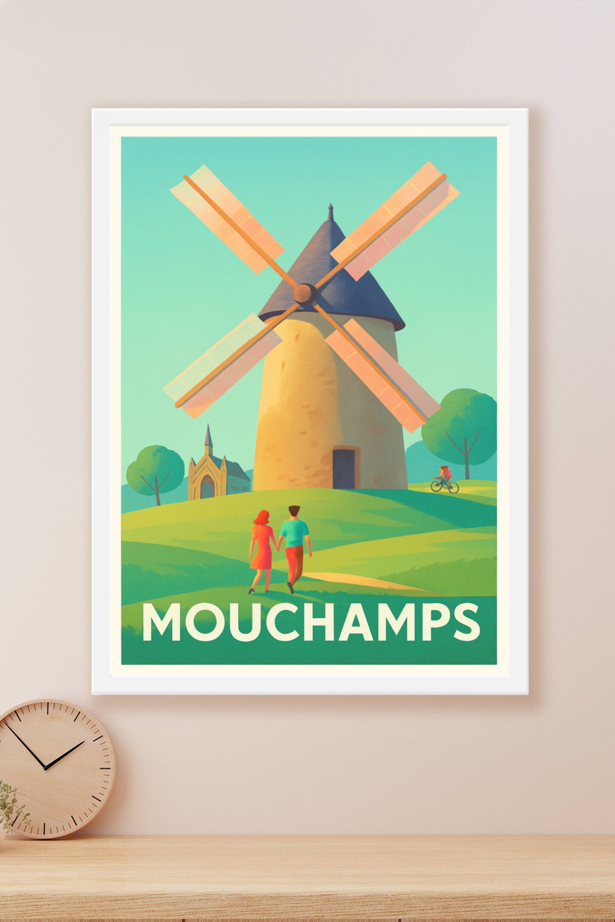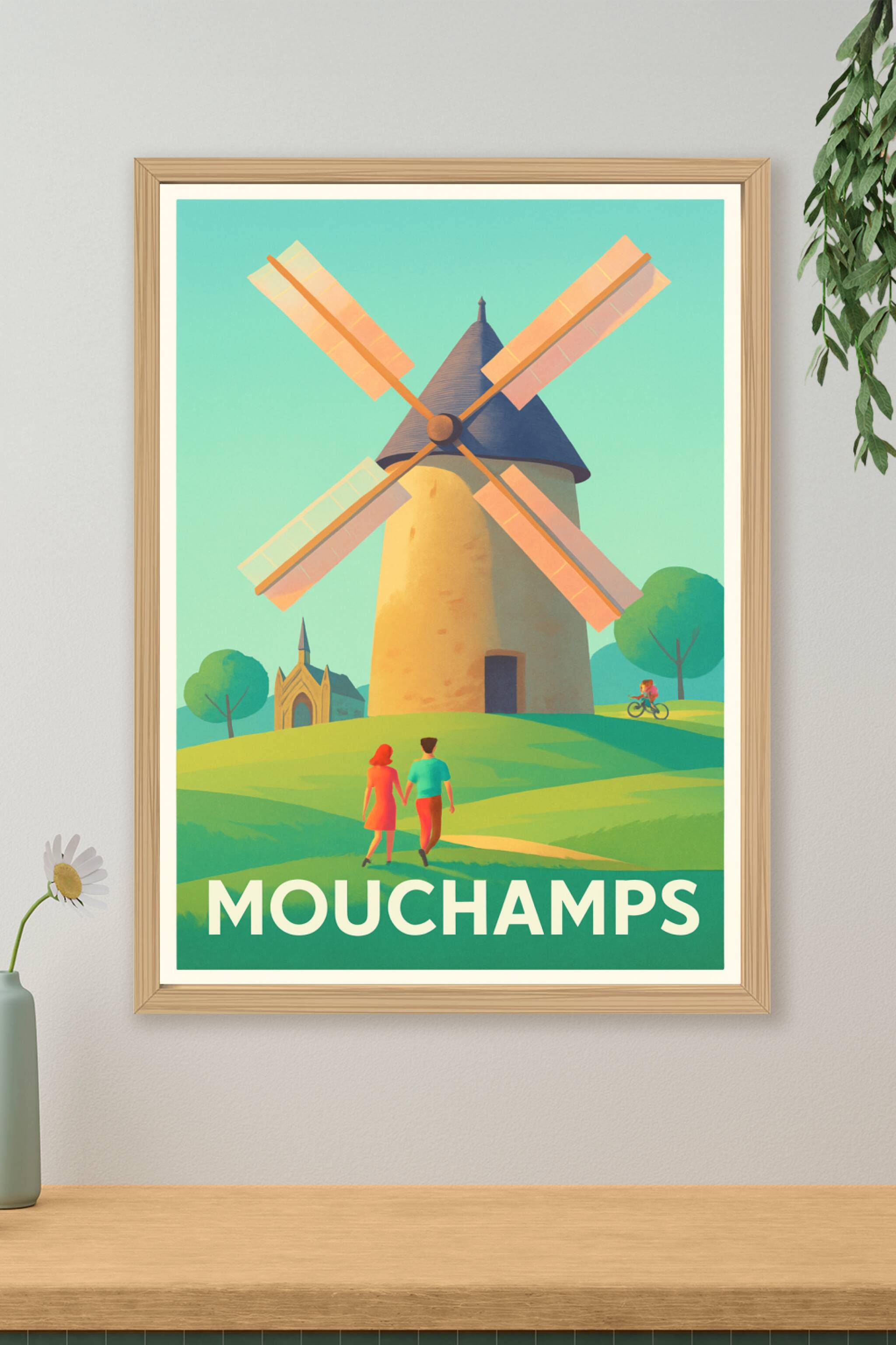 Découvrez la douceur de vivre à Mouchamps avec cette affiche illustrée mettant en scène un moulin emblématique au cœur des paysages verdoyants. Ce ...