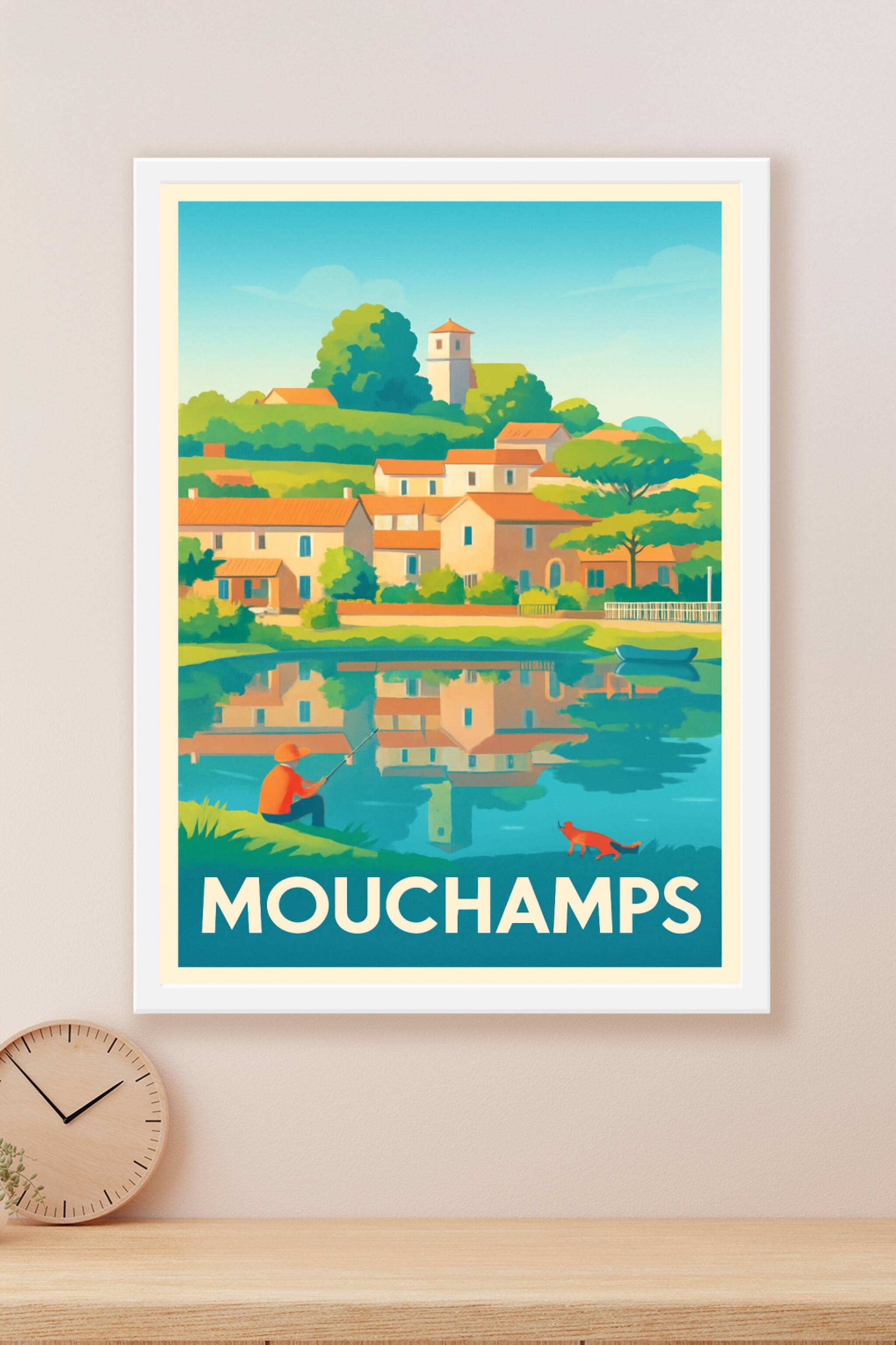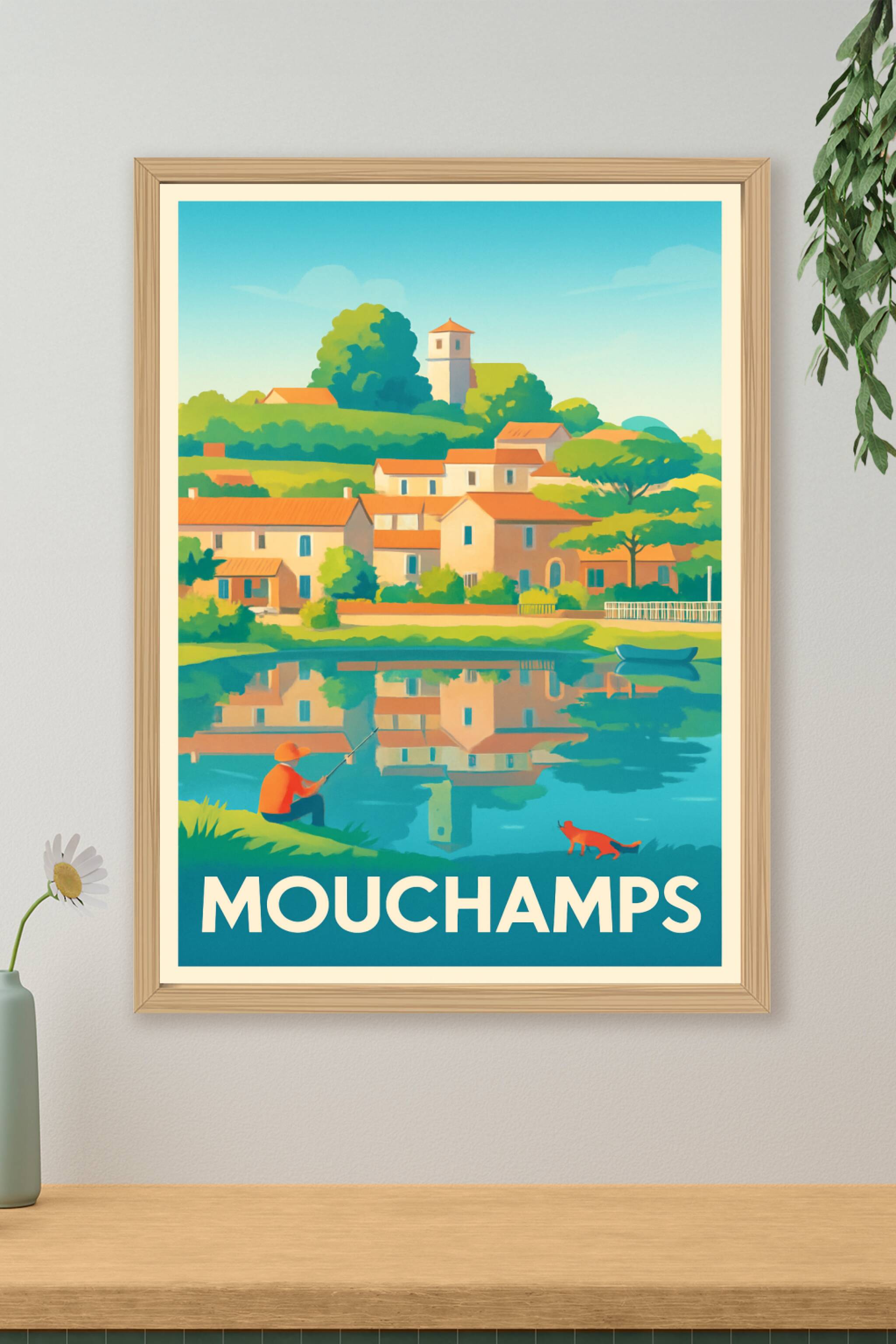 Découvrez le charme paisible de Mouchamps avec cette affiche illustrée mettant en scène un village ensoleillé au bord de son plan d'eau, où un pêch...
