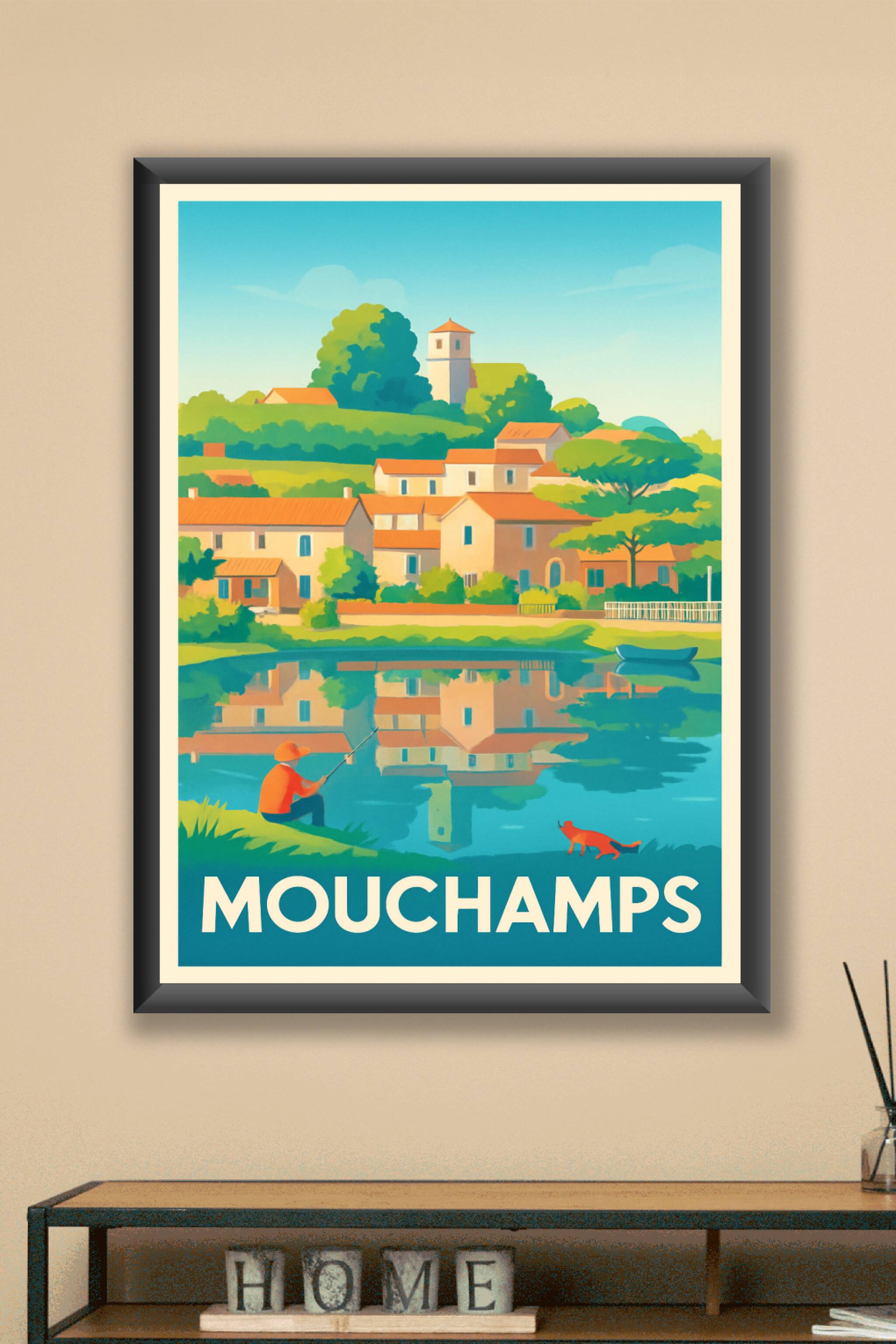 Découvrez le charme paisible de Mouchamps avec cette affiche illustrée mettant en scène un village ensoleillé au bord de son plan d'eau, où un pêcheur profite d'un moment de calme accompagné de son fidèle compagnon. Ce poster inspirant capture l'essence tranquille et bucolique de cette petite ville, idéale pour apporter une touche de douceur à votre décoration intérieure. Disponible en tirage "Fine Art" sur papier 305g coton, garantissant une qualité d'impression exceptionnelle et des couleurs vibrantes qui dureront dans le temps. Proposé en formats A1 à A4, avec ou sans cadre, cette affiche s'adapte parfaitement à tous les intérieurs, du plus cosy au plus moderne. Offrez-vous une escapade visuelle ou un cadeau unique avec ce poster de haute qualité, 100% fabriqué en France.