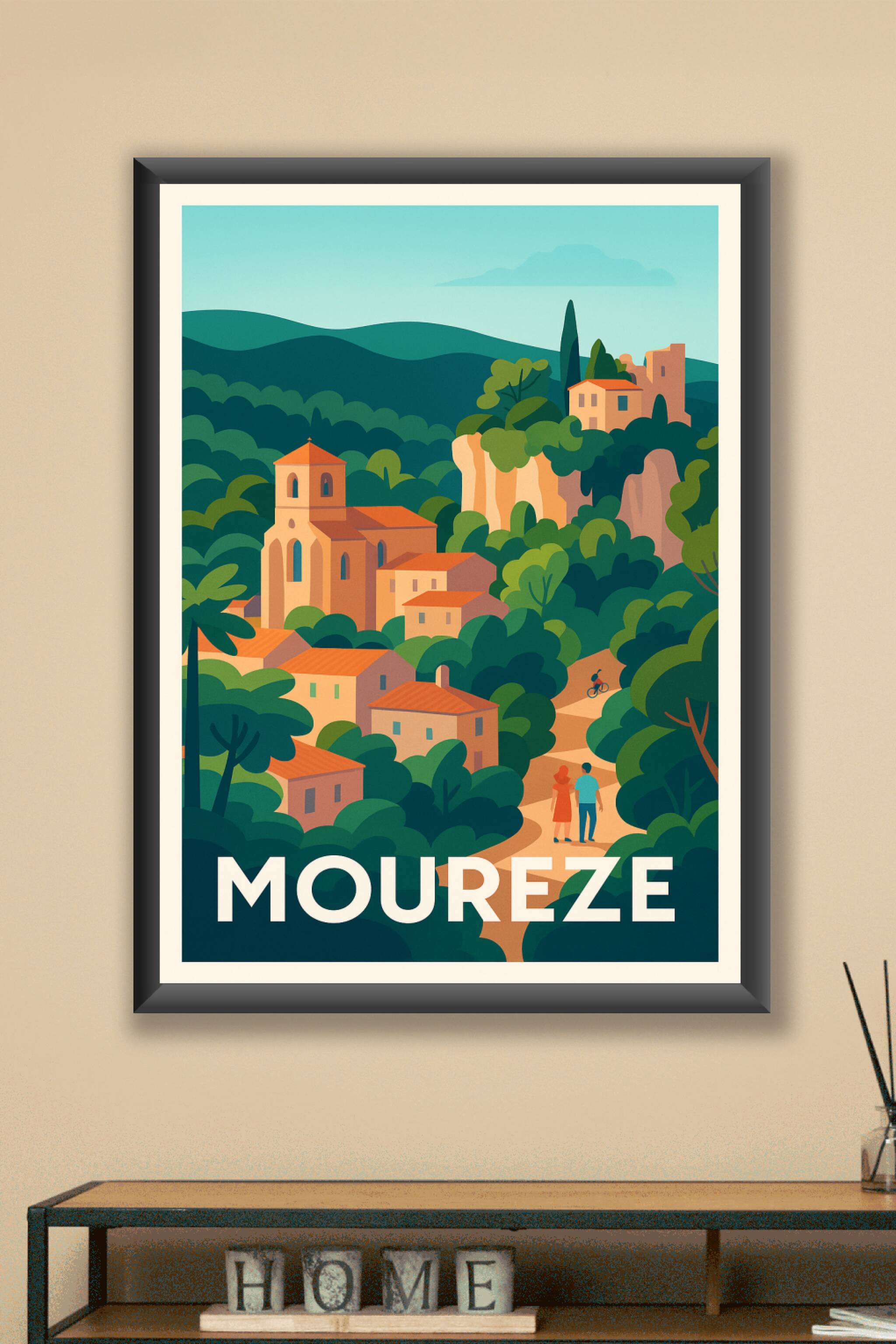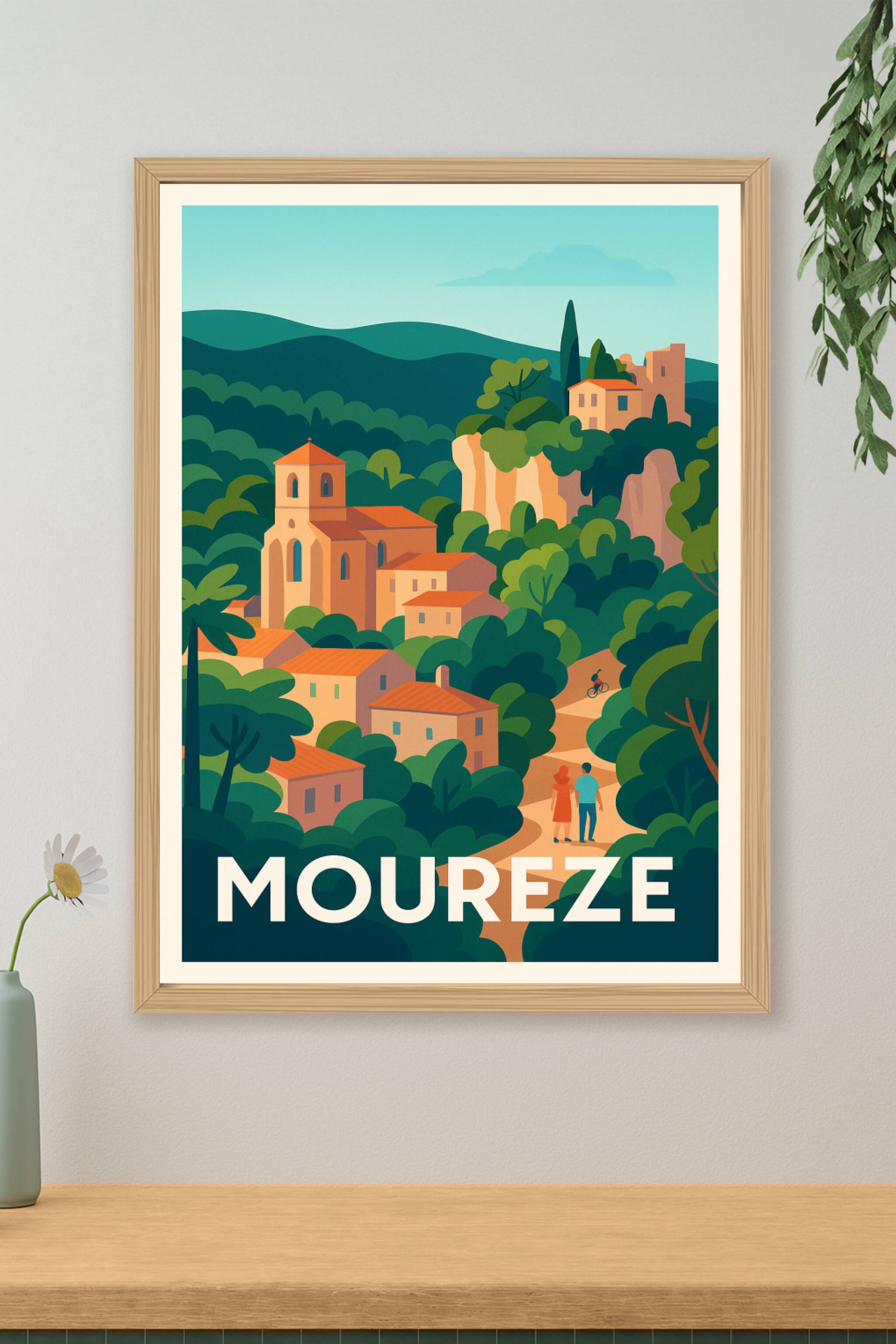 Découvrez l'atmosphère paisible et verdoyante de Mourèze, nichée au milieu des célèbres Causses. Cette affiche moderne met en scène le village avec...