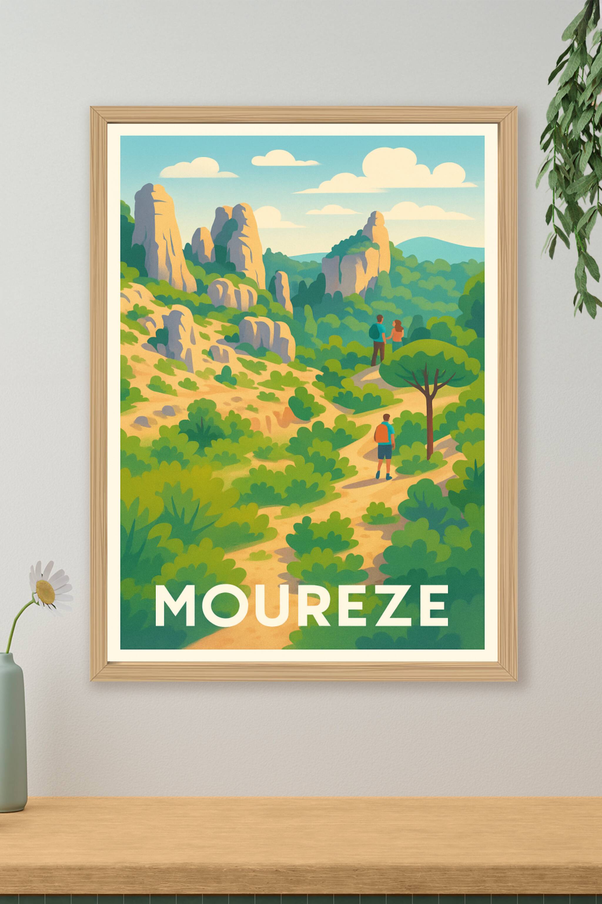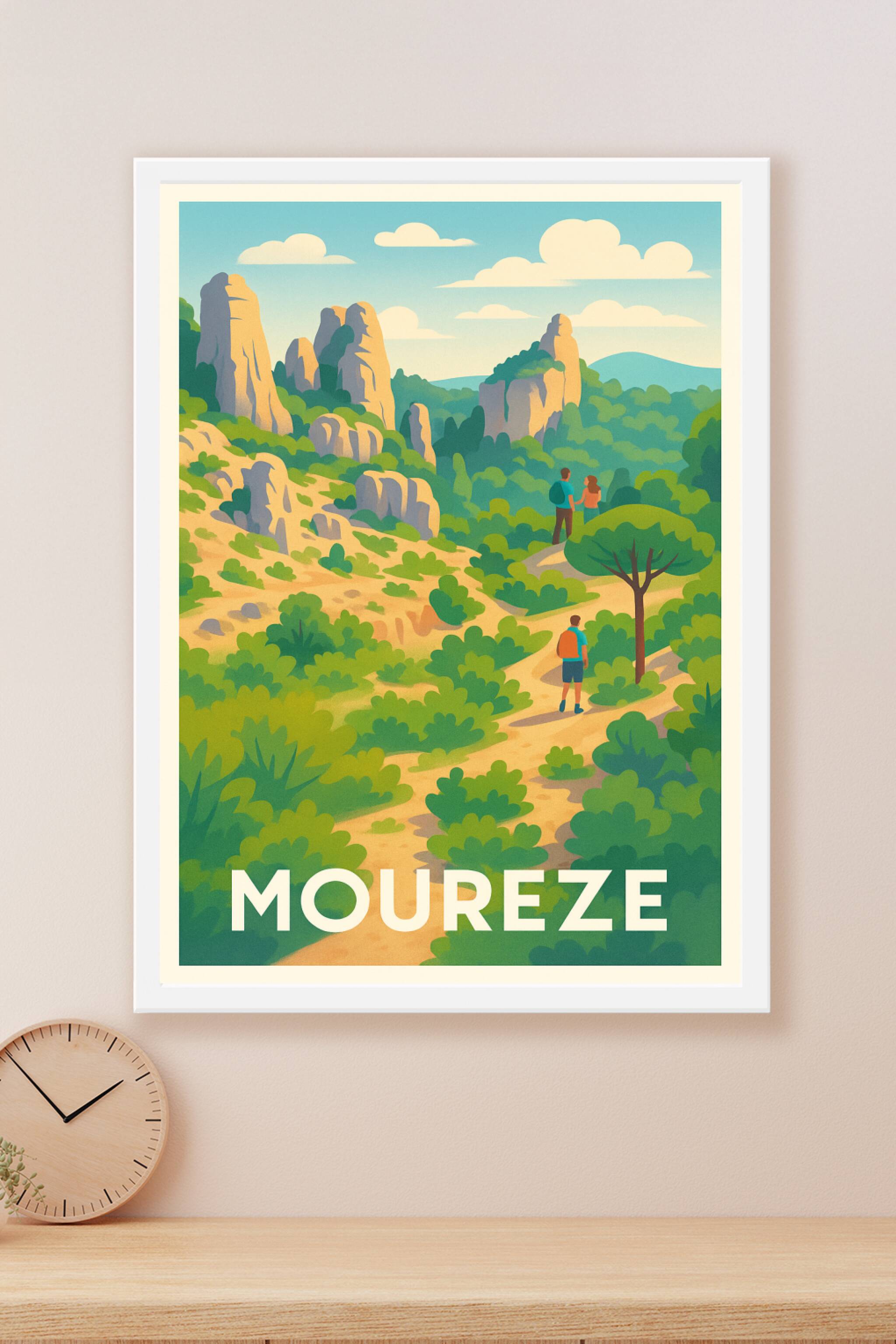 Découvrez la beauté sauvage et les sentiers pittoresques de Mourèze avec cette affiche illustrée aux couleurs vibrantes et au style rétro. Ce poster évoque l'expérience unique des randonnées au cœur des paysages rocheux et verdoyants typiques de cette région.L'affiche est disponible en tirage "Fine Art" sur papier 305g coton, garantissant une qualité d'impression exceptionnelle et une longévité remarquable. Proposée en formats A1 à A4, avec ou sans cadre, cette décoration unique apportera une touche d'évasion et de nature à votre intérieur. Sublimez votre espace ou offrez un cadeau mémorable aux amoureux de la randonnée et des beaux paysages du Sud de la France.