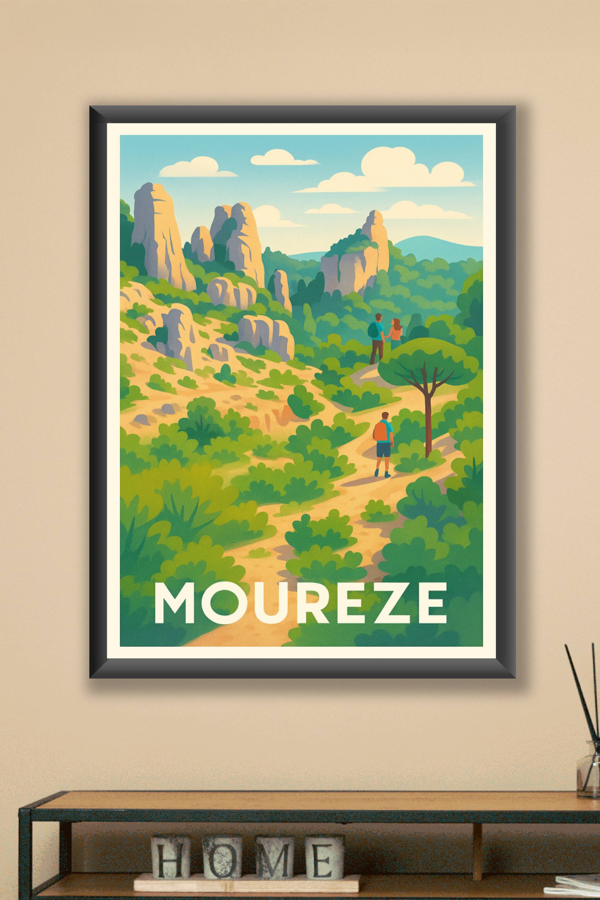 Découvrez la beauté sauvage et les sentiers pittoresques de Mourèze avec cette affiche illustrée aux couleurs vibrantes et au style rétro. Ce poste...