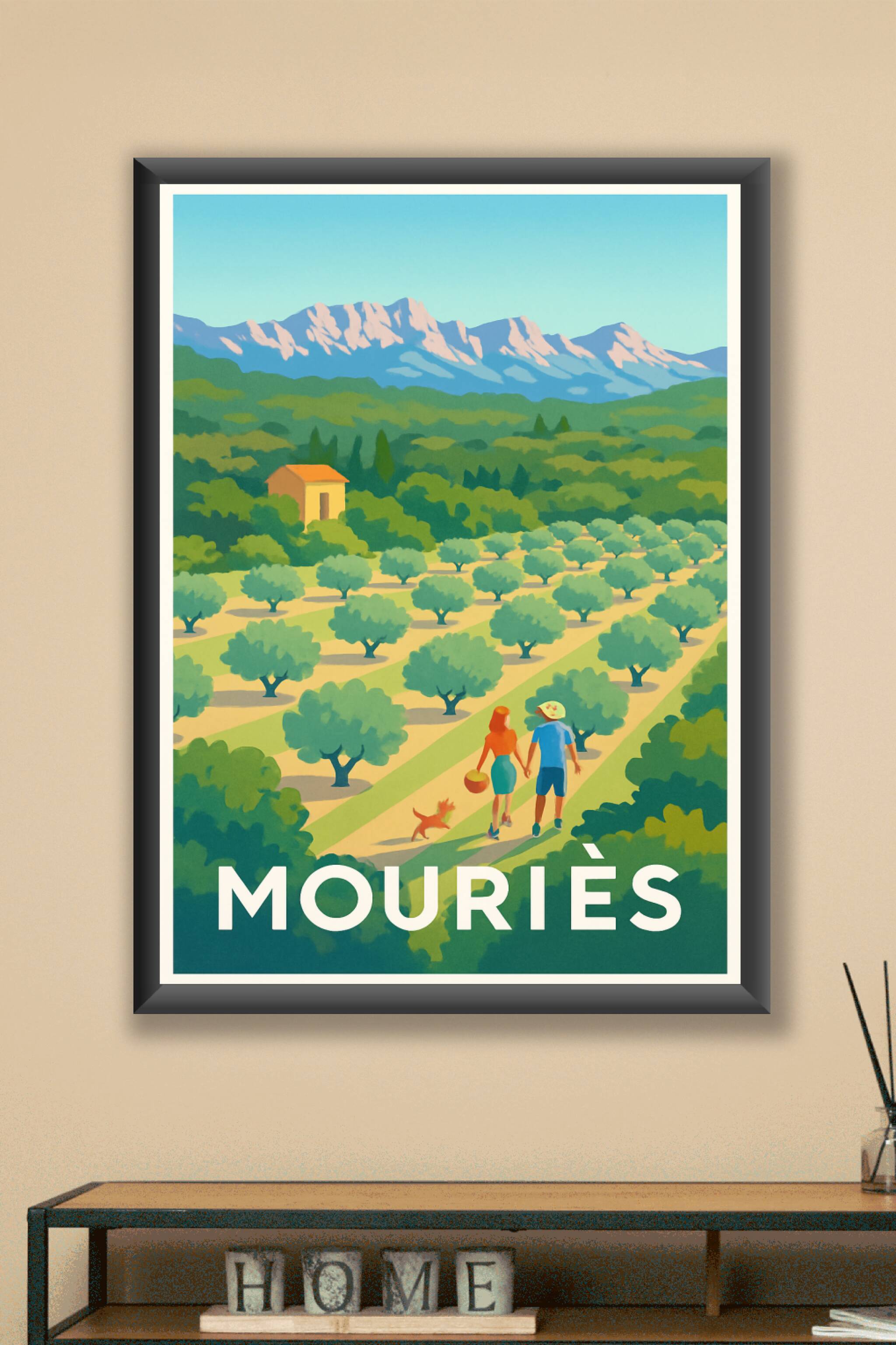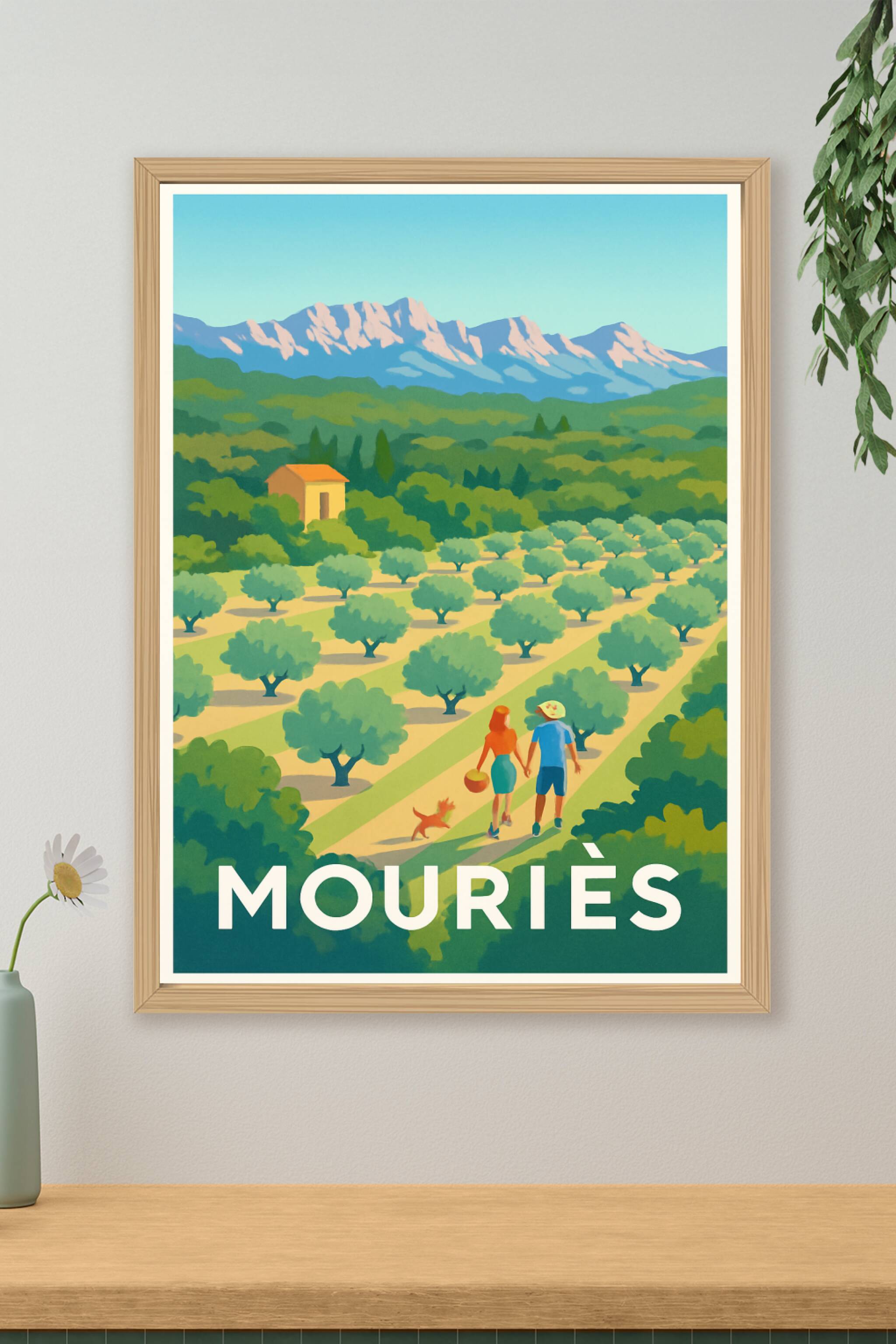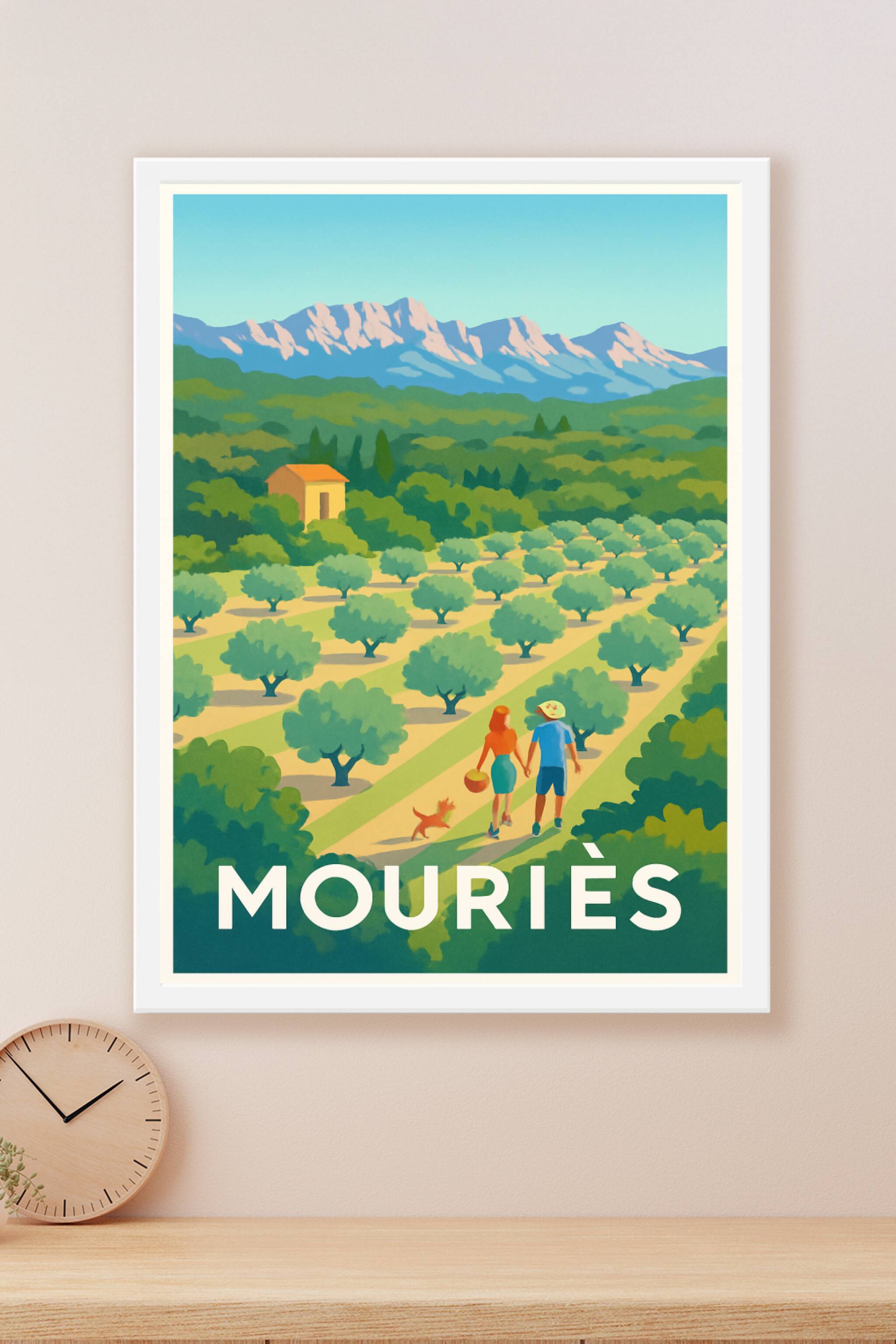 Découvrez la beauté authentique de Mouriès, village pittoresque célèbre pour ses vastes champs d'oliviers et son cadre naturel apaisant, grâce à cette affiche illustrée au style vibrant et coloré. Ce poster capture une promenade idyllique entre les rangées d'oliviers sous un ciel bleu éclatant, évoquant la douceur de vivre en Provence. Imprimée en tirage "Fine Art" sur papier 305g coton, cette affiche garantit une qualité d'impression exceptionnelle avec des couleurs profondes et durables. Disponible en formats A1 à A4, avec ou sans cadre, elle est parfaite pour embellir votre intérieur ou offrir un cadeau raffiné aux amoureux du Sud. Profitez d'un produit 100% fabriqué en France pour une décoration élégante et durable.