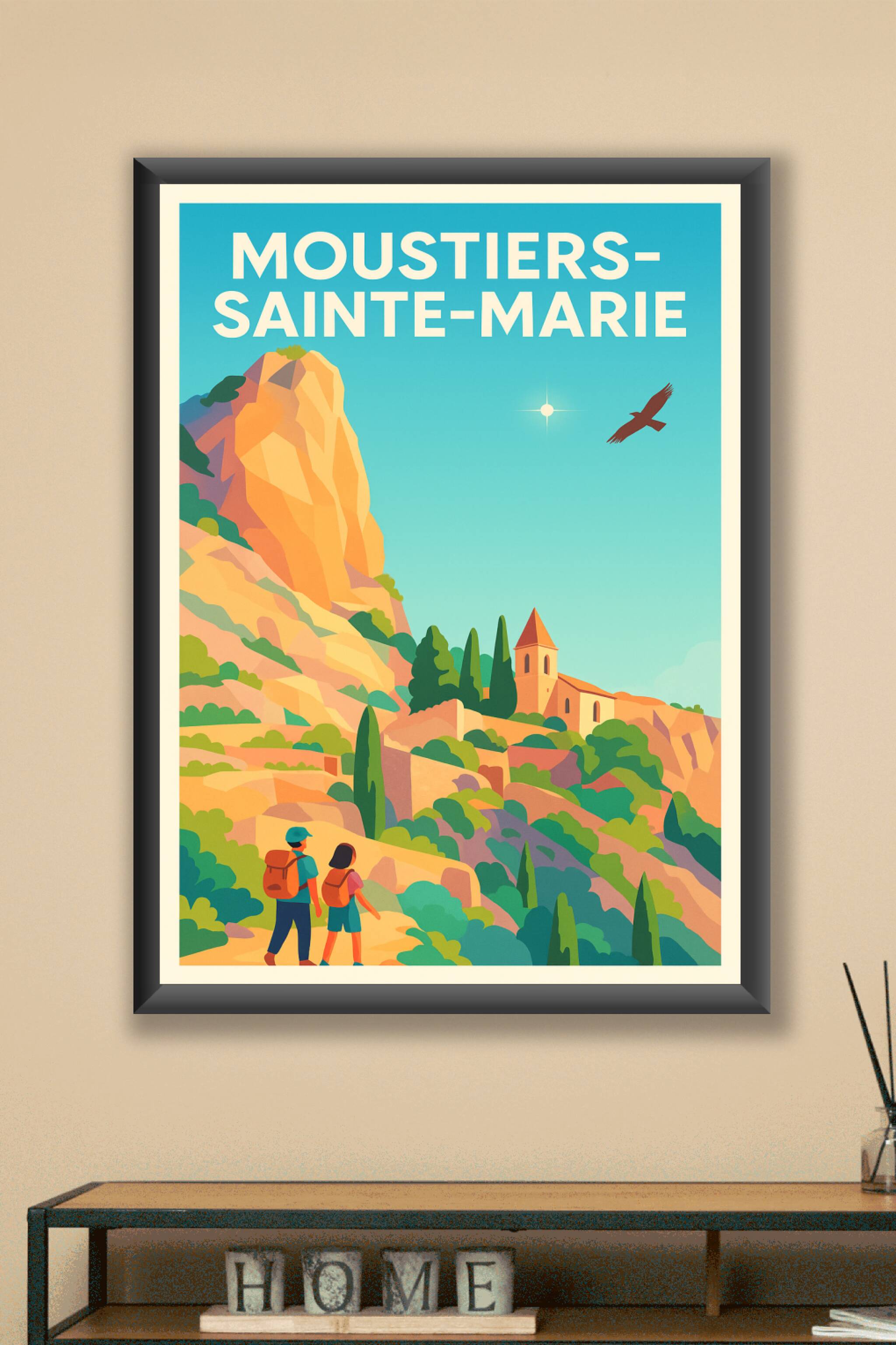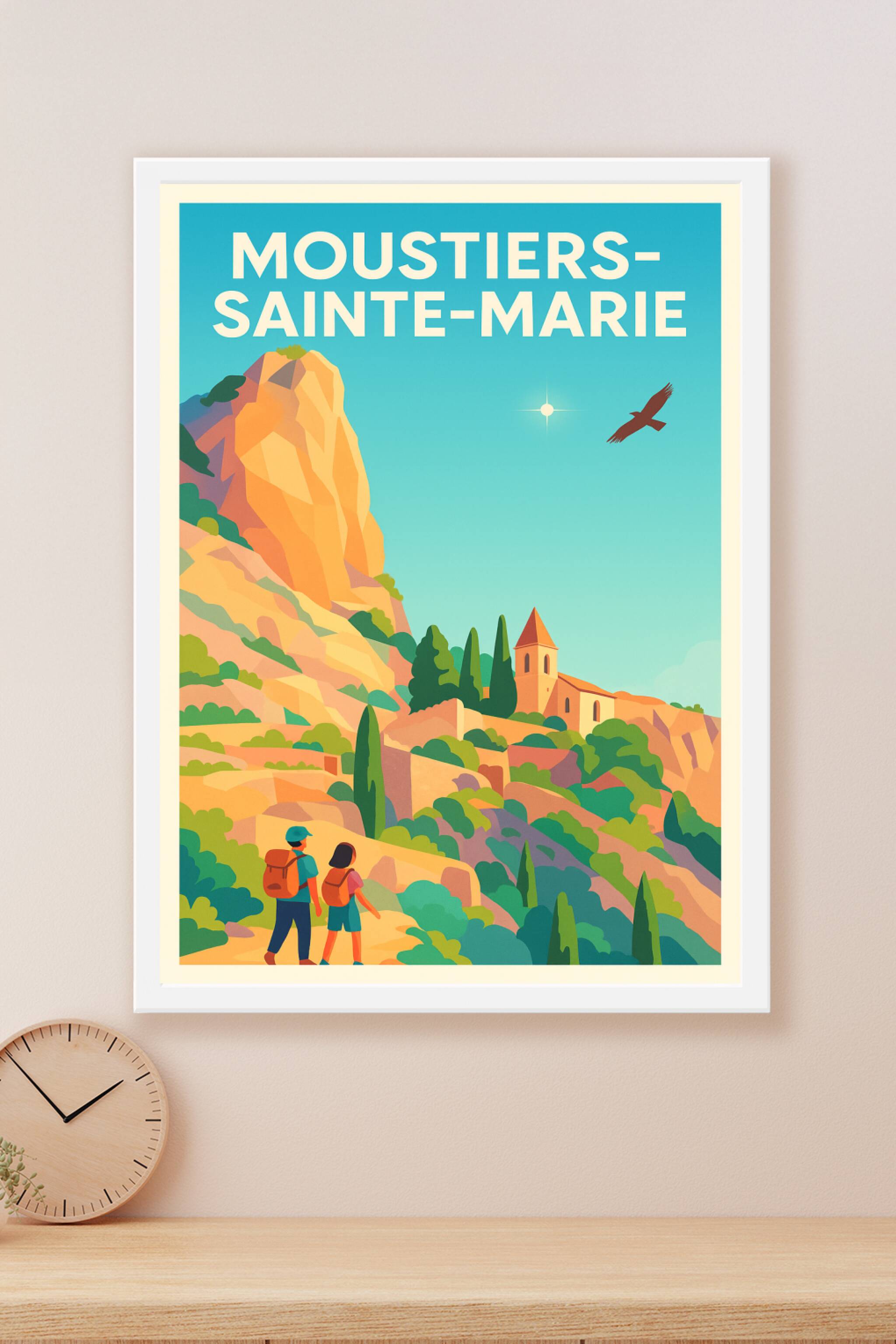 Découvrez la beauté typique de Moustiers-Sainte-Marie avec cette affiche vibrante qui met en scène ses paysages rocheux et son charmant village pro...