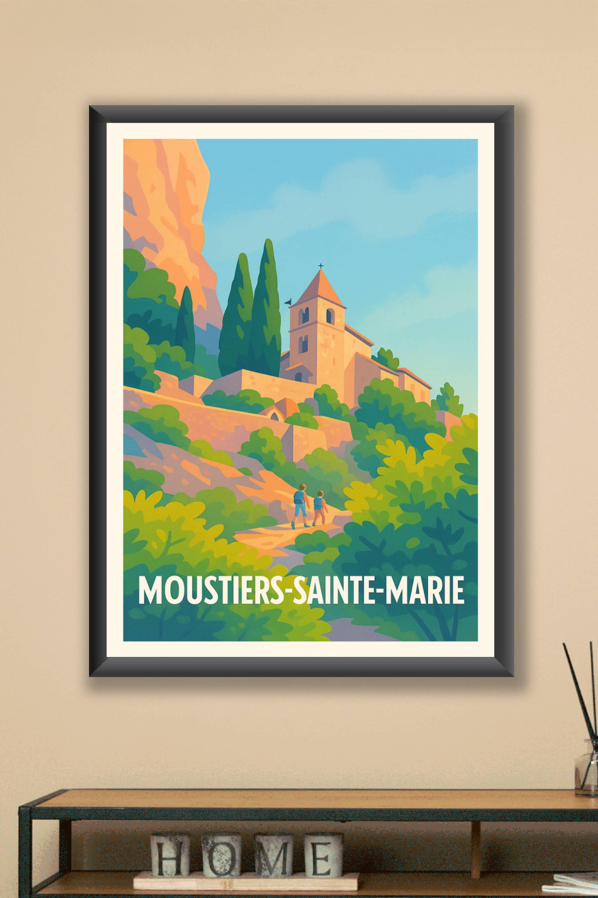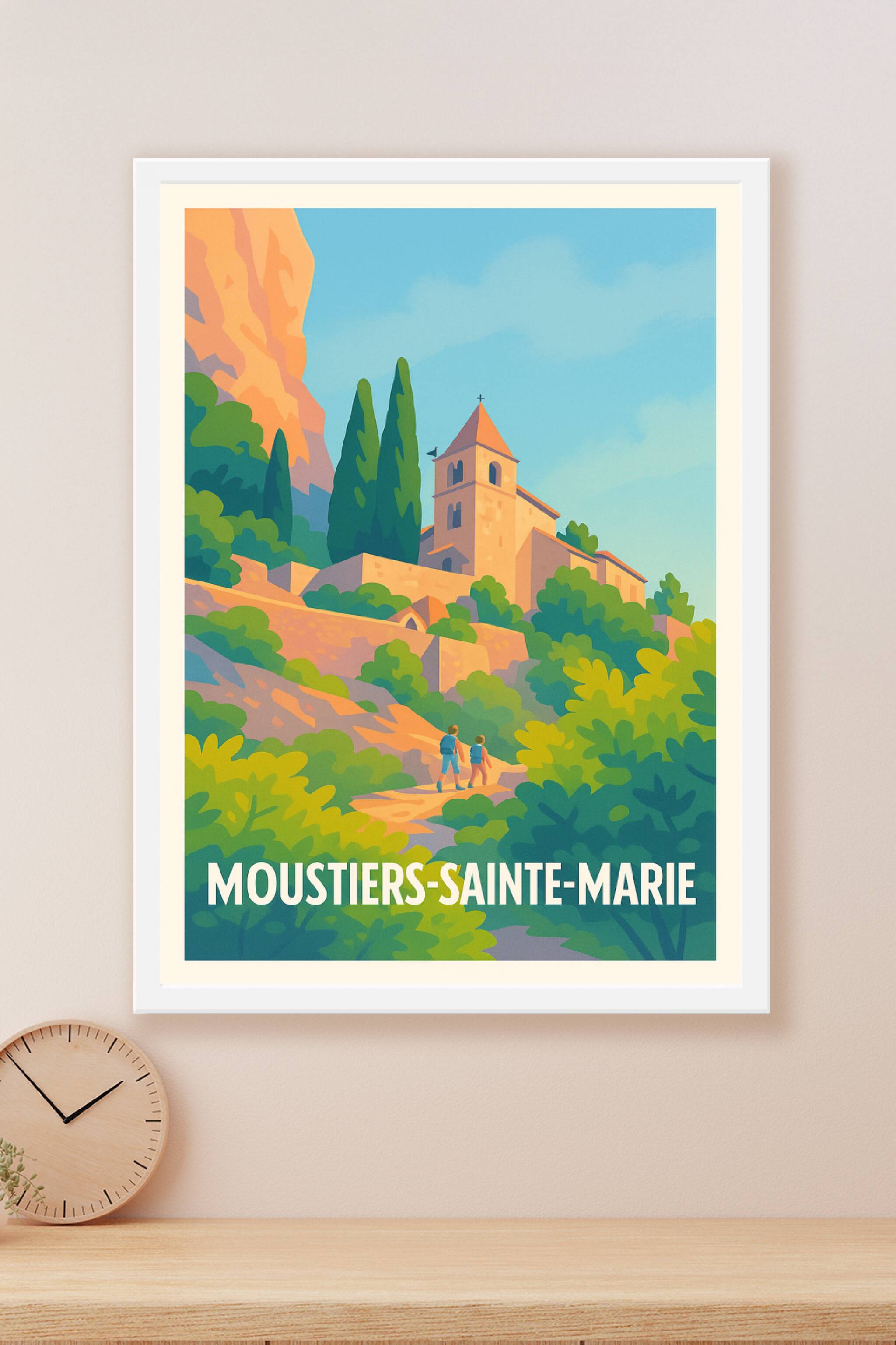 Découvrez la beauté intemporelle de Moustiers-Sainte-Marie avec cette affiche illustrée aux couleurs vives et chaleureuses, mettant en scène son pa...